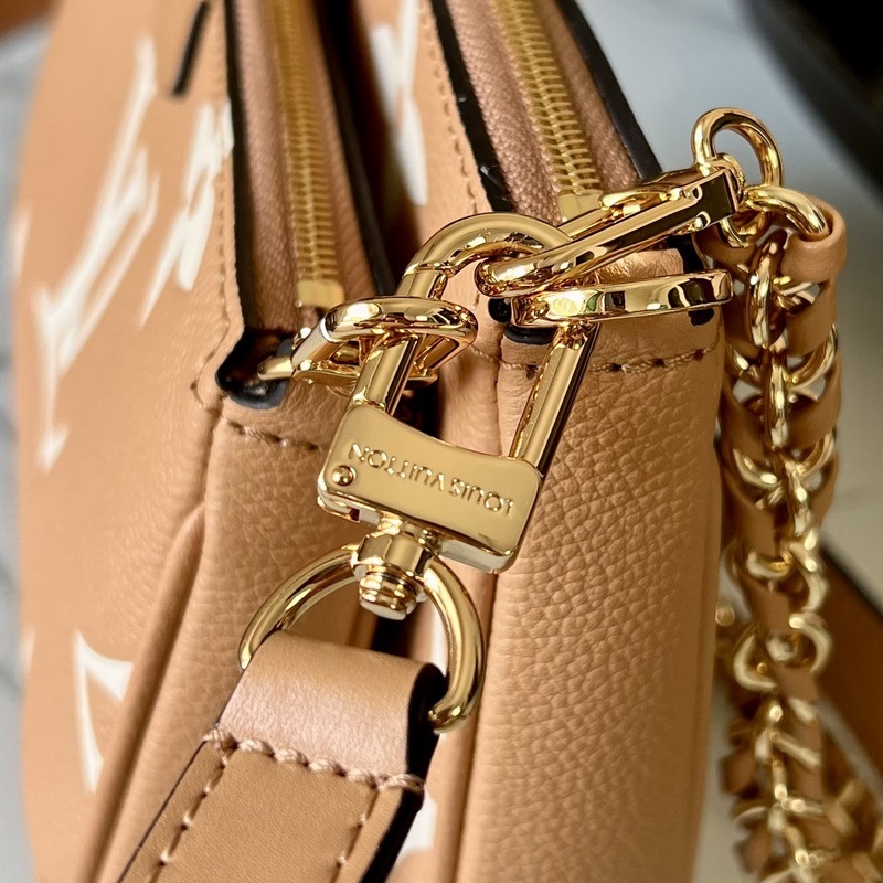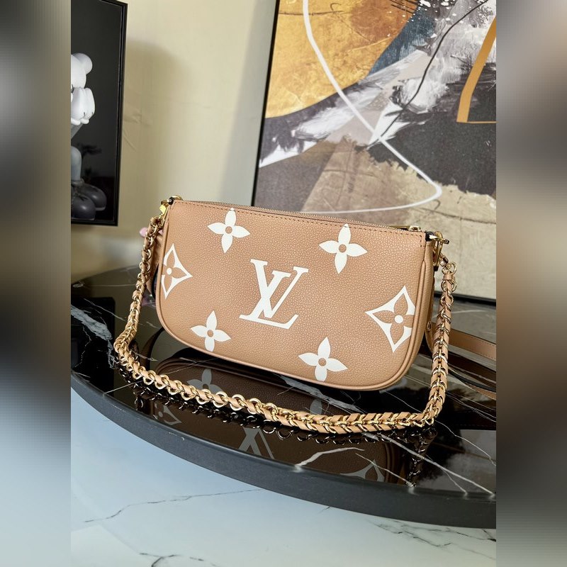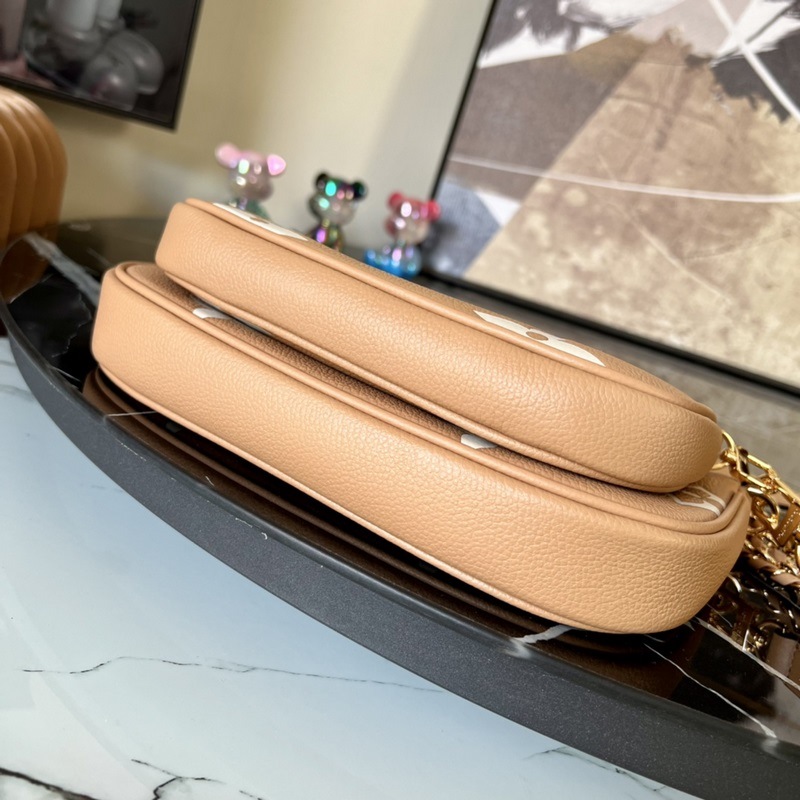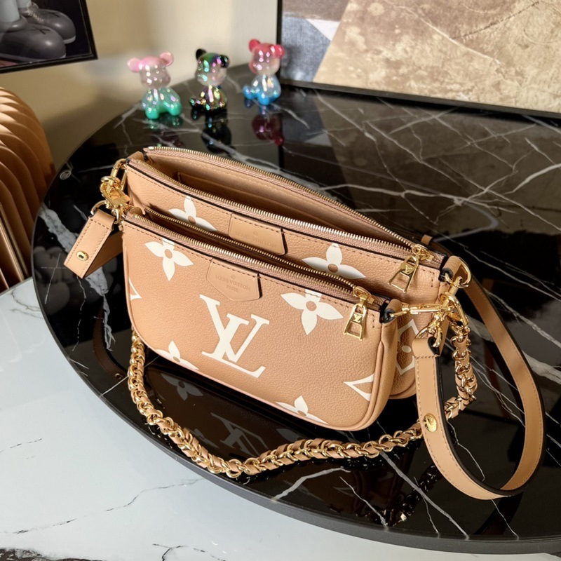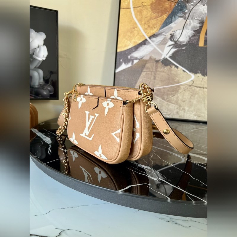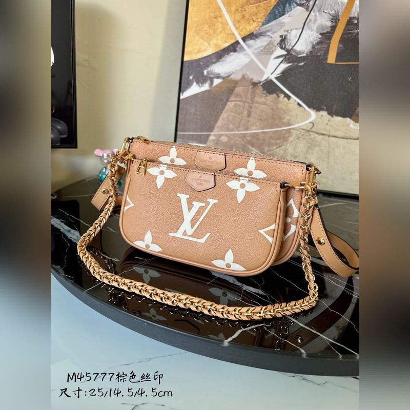 LV 멀티 파쎄트 액세서리 핸드백 모델 M45777 브라운 실크스크린 멀티 파쎄트 액세서리 핸드백은 모노그램 캔버스로 제작되었으며 세 가지 디자인이 하나로 결합된 생동감 있는 디자인입니다. 또한 여러 개의 포켓과 수납공간이 있습니다. 조절 가능한 골드 컬러 체인과 루이 비통 모노그램 자카드 숄더 스트랩은 크로스 바디 등 다양한 운반 방법을 제공합니다. 크기: 25 x 14.5 x 4.5cm