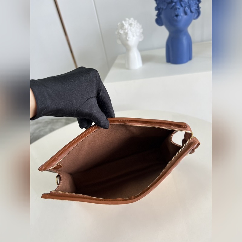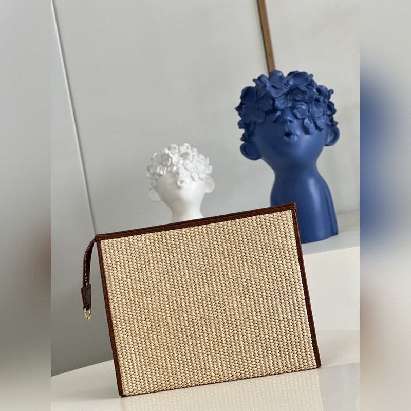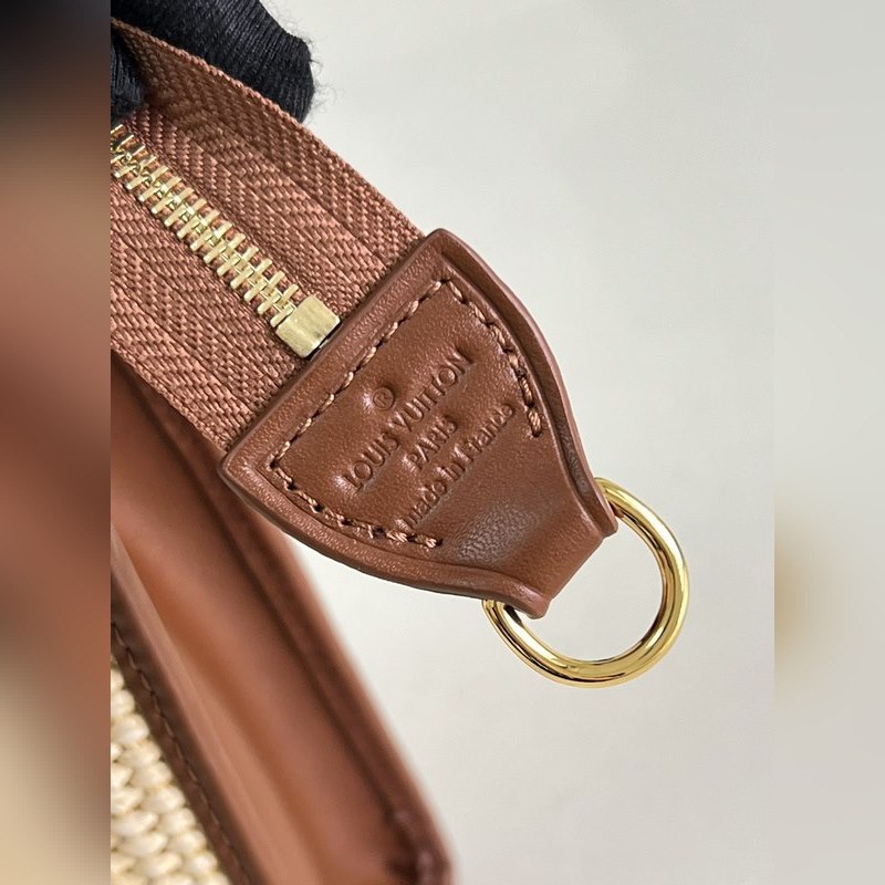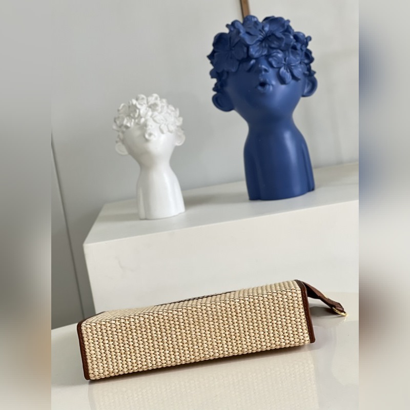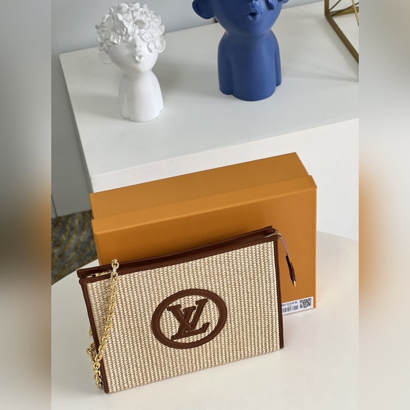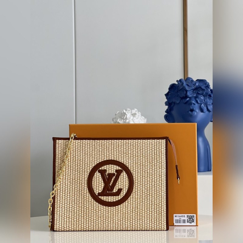LV 라피아 직조 체인 백 숄더백 모델 M81366 브라운 체인에 달린 화장품 가방은 천연 라피아 소재로 만들어졌으며 측면에 블랙 가죽과 LV 서클 로고가 장식되어 있습니다. 이 모델은 1901년에 만들어진 화장품 가방에서 영감을 얻었으며 루이 비통 고객들이 클러치로 사용하기도 했습니다. 이 재해석된 디자인은 손으로 들거나 어깨에 메는 데 사용할 수 있도록 탈착식 골드 체인이 달려 있습니다. 크기 9.8 x 7.9 x 2.2cm