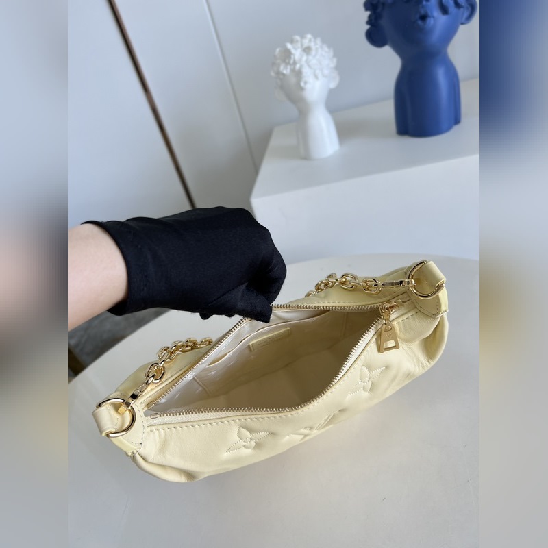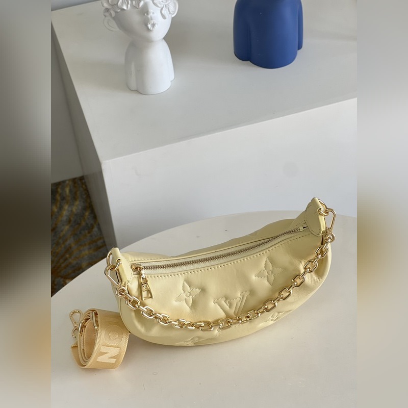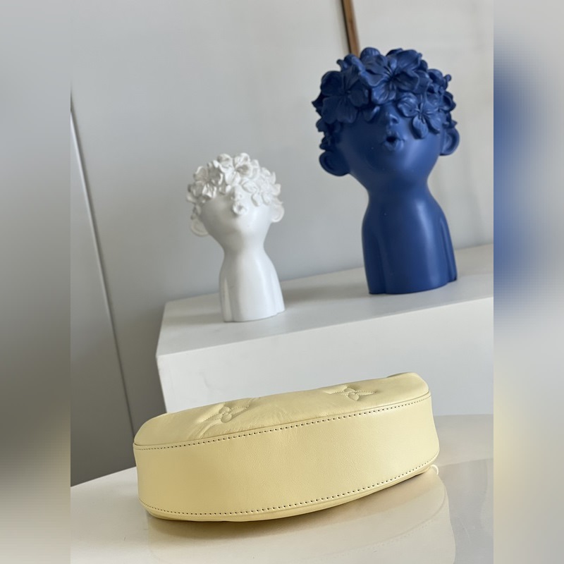 LV 오버 더 문 백 모델 M59823 노란색 이 오버 더 문(Over The Moon) 가방은 부드러운 누비 소가죽으로 만들어졌으며 모노그램 자수 장식이 고급스러움을 더해줍니다. 길이 조절이 가능한 어깨끈과 체인이 달려 있어 몸에 걸치거나 짧은 어깨에 메거나 클러치백으로 사용할 수 있습니다. 크기 27.5 x 16 x 7cm(길이 x 높이 x 너비)