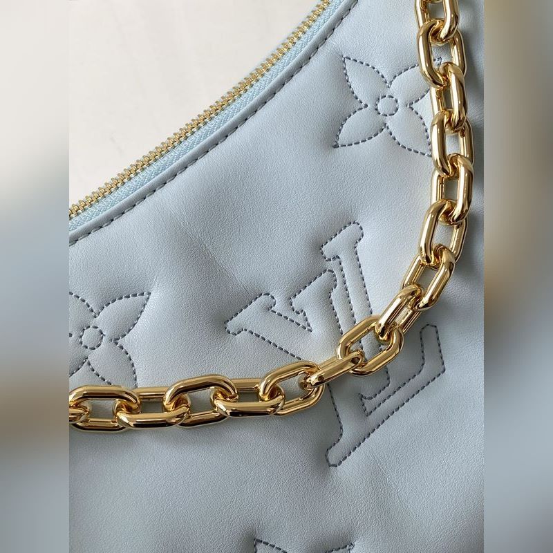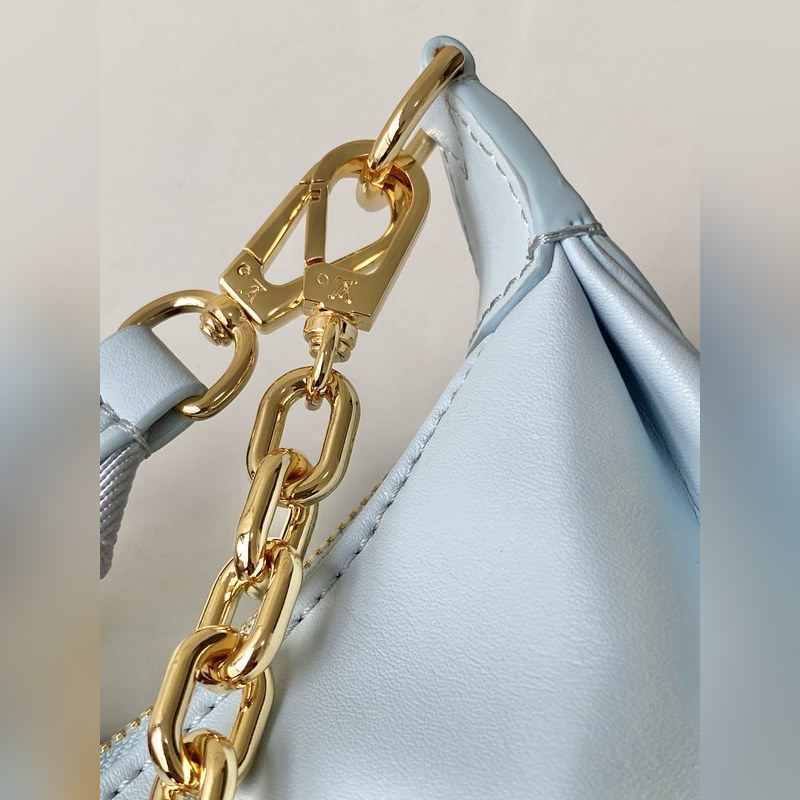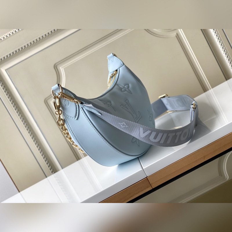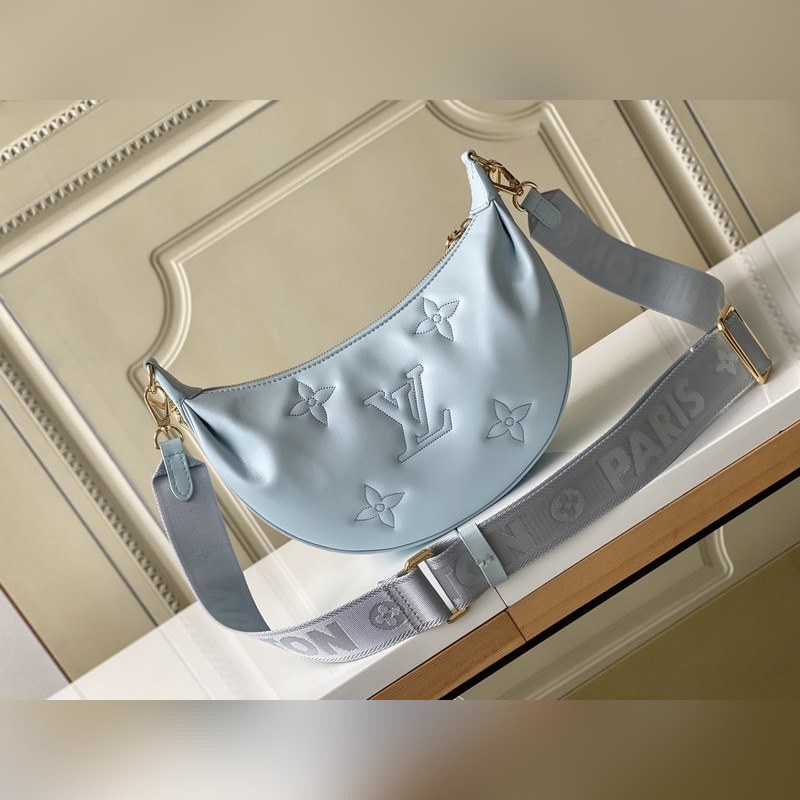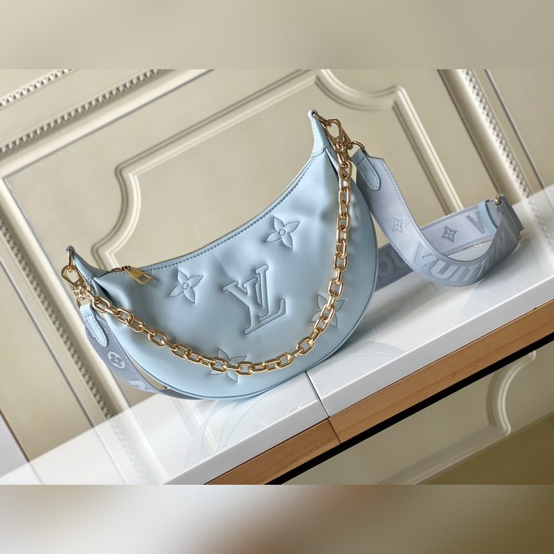 LV 오버 더 문 백 모델 M59825 파란색 오버 더 문 백은 부드러운 누빔 소가죽으로 만들어졌으며 모노그램 자수 장식이 고급스러움을 더해줍니다. 길이 조절이 가능한 어깨끈과 체인이 있어 몸에 걸치거나 짧은 어깨에 메거나 클러치백으로 사용할 수 있습니다. 크기: 27.5x16x7cm