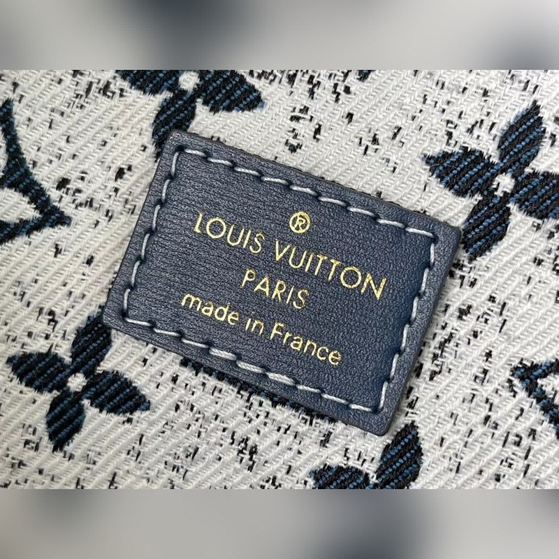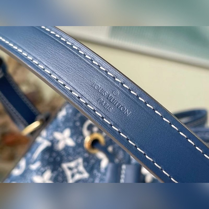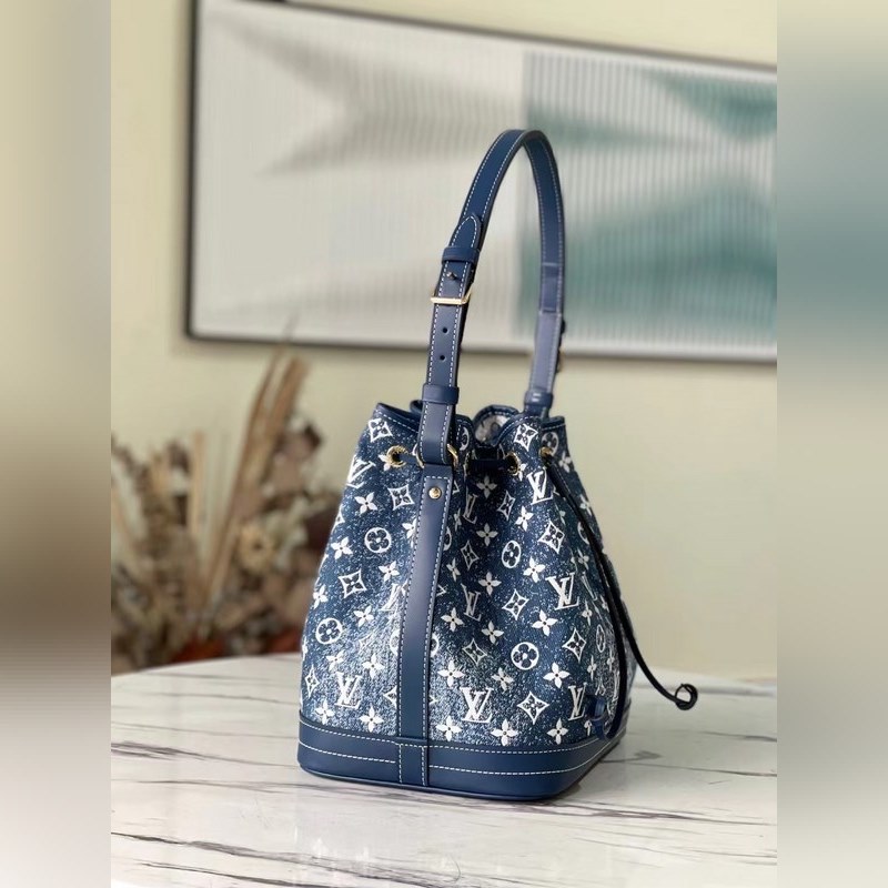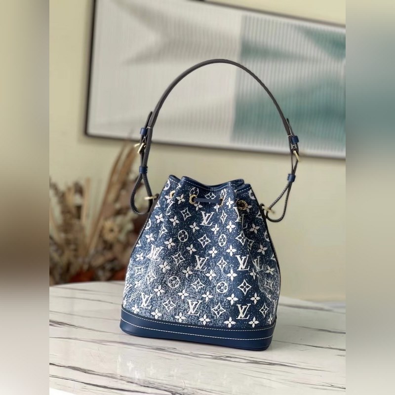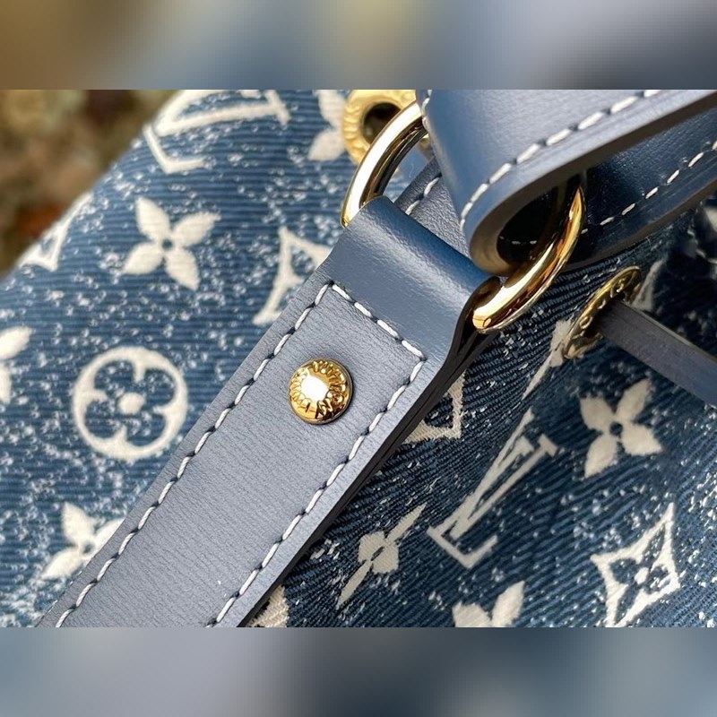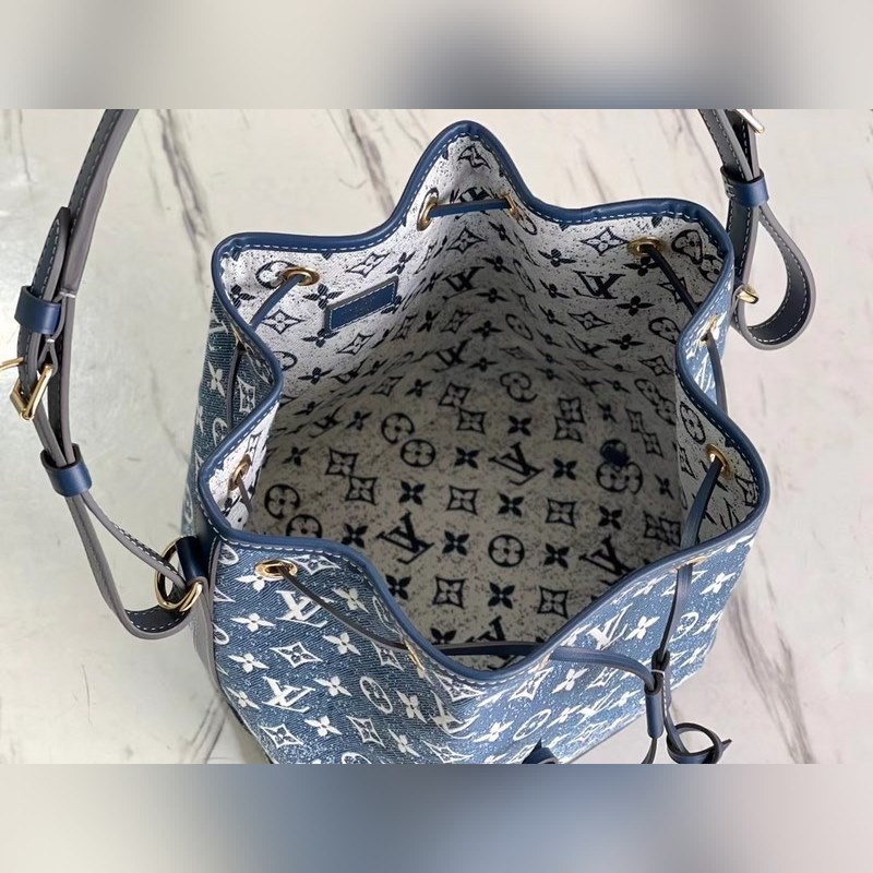 LV Petit No? 버킷백 모델 M59606 이 쁘띠 노에 버킷 백은 모노그램 자카드 데님 소재에 샌드워싱 처리와 가죽 트리밍 탑스티치로 제작되었습니다. 물건을 안전하게 보관할 수 있는 끈이 달린 스마트한 내부 공간과 어깨에 메거나 몸에 걸칠 수 있는 길이 조절이 가능한 어깨끈이 있습니다. 크기: 25 x 28.5 x 20cm