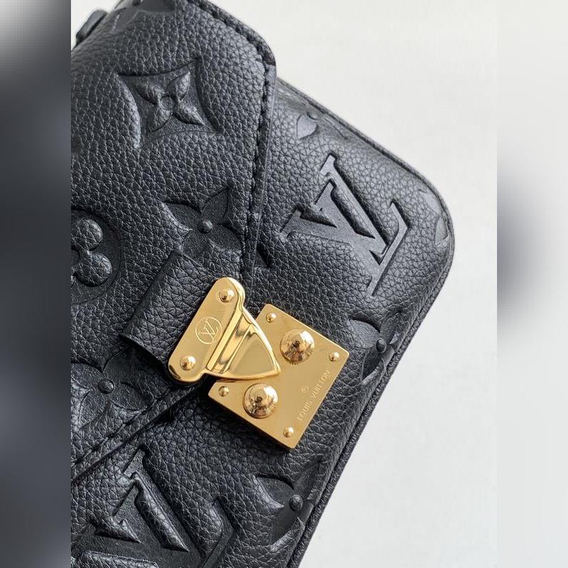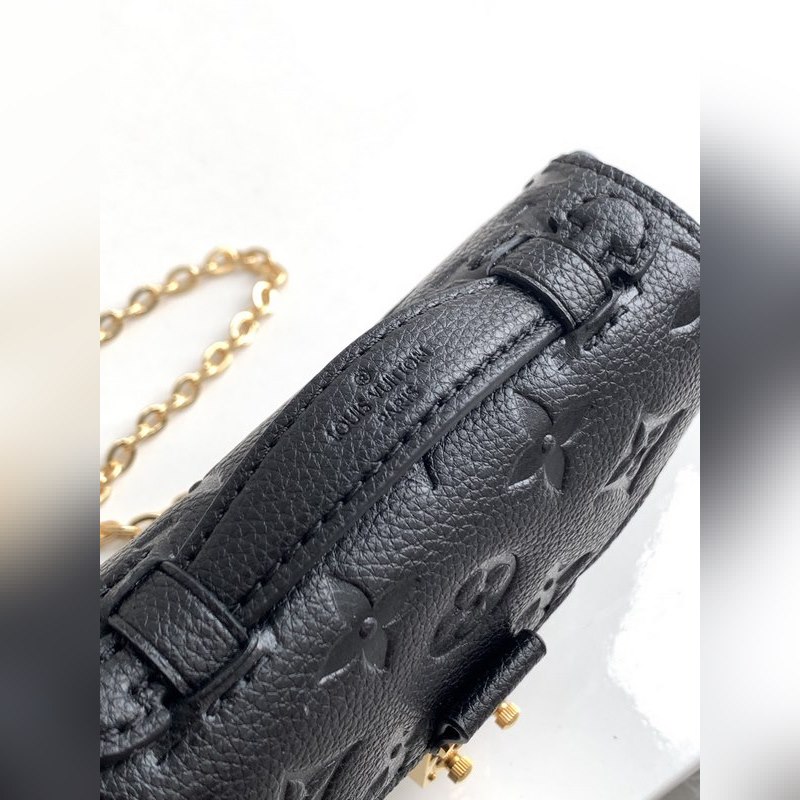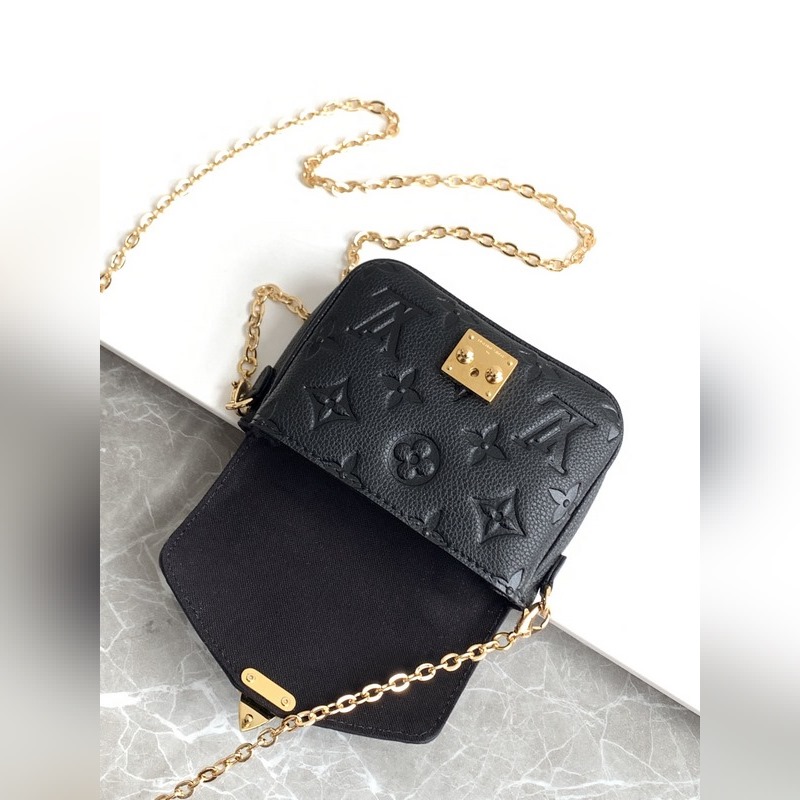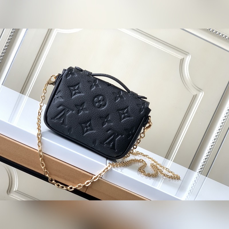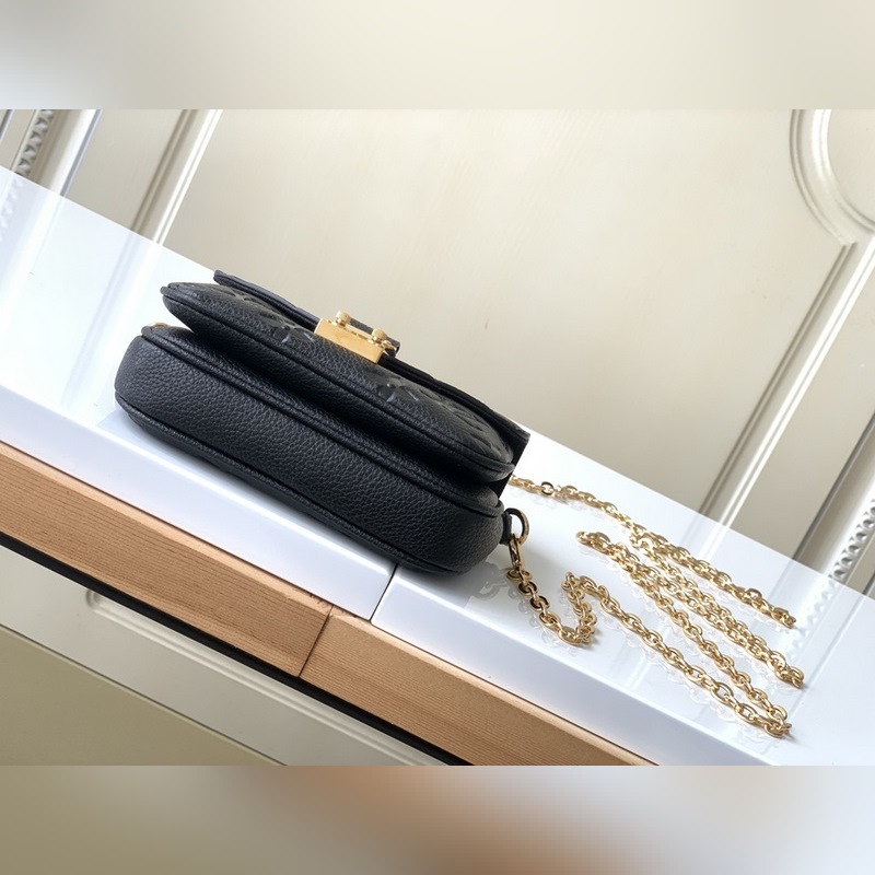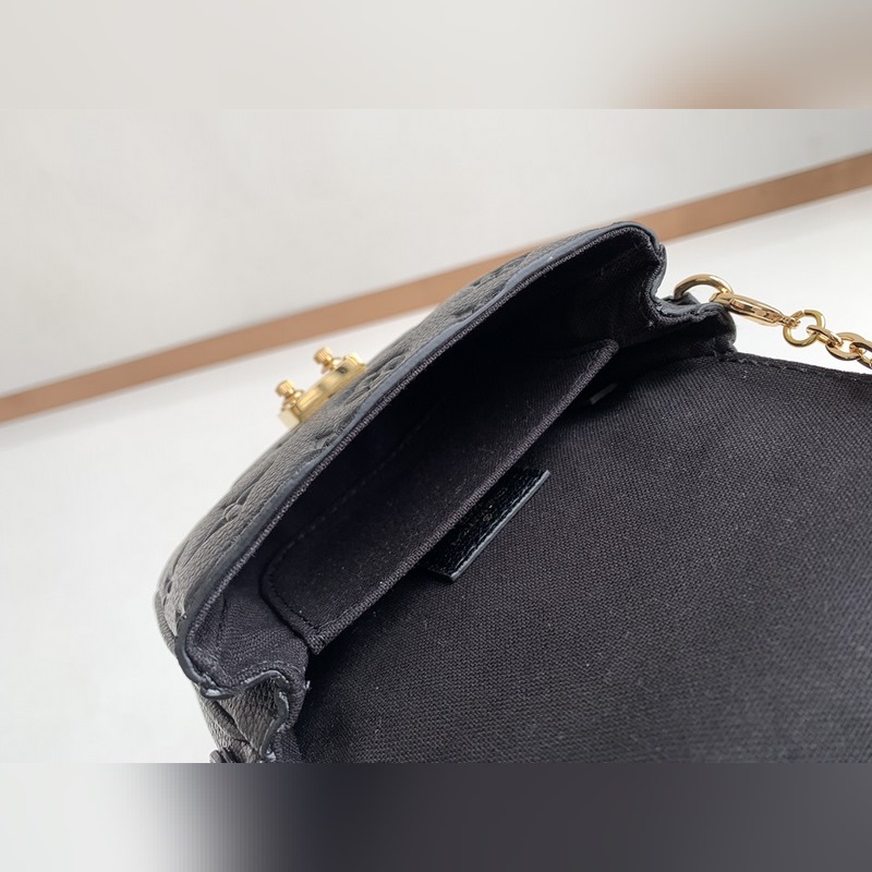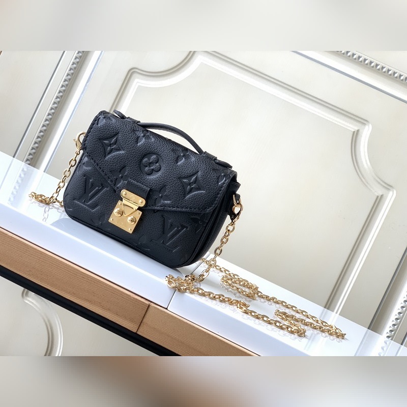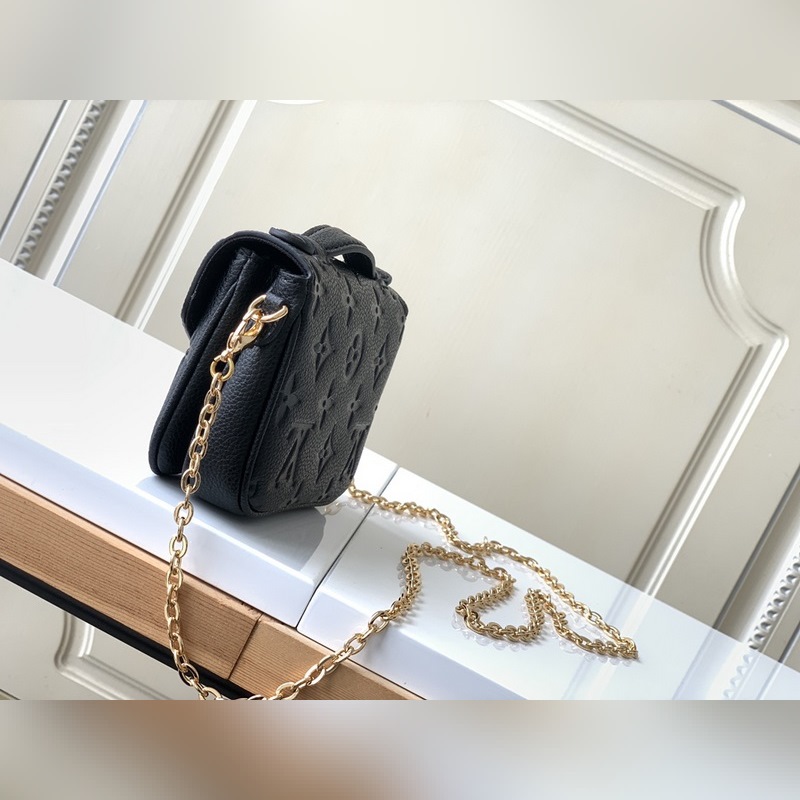 LV 모델 M81390 블랙 풀 레더 체인백 컬렉션 마이크로 메티스 체인백 부드러운 모노그램 앙프렝뜨 가죽으로 제작된 마이크로 메티스 체인 백은 상징적인 포셰트 메티스 핸드백의 축소판 버전입니다. S자형 잠금 장치는 루이 비통의 전통적인 트렁크 제작 방식과 메티스 라인의 특징을 반영한 것입니다. 크기: 14 x 11 x 3.5cm