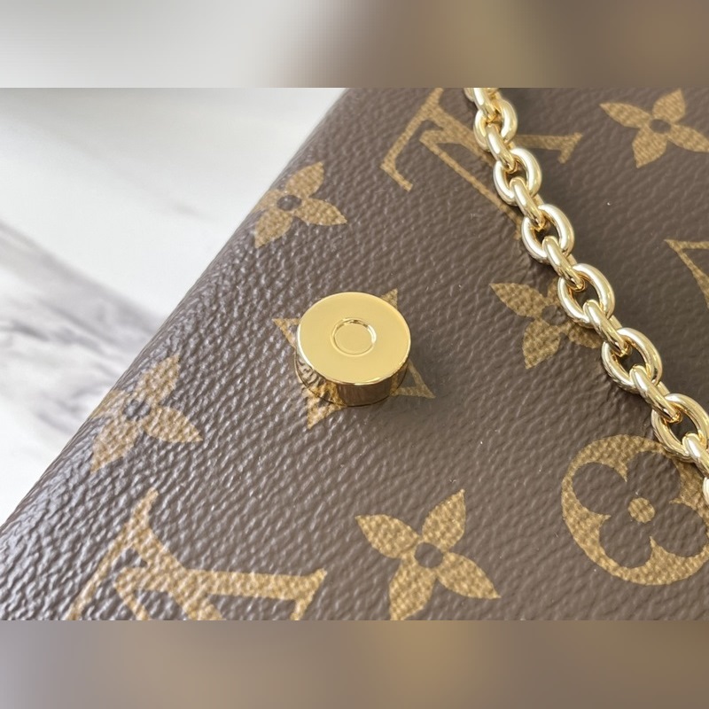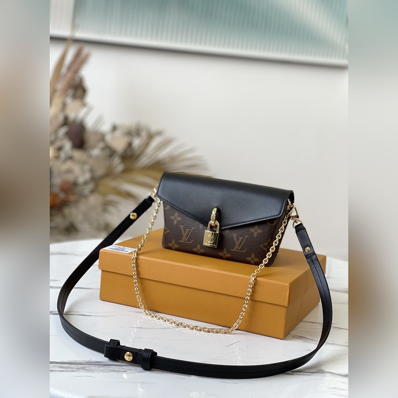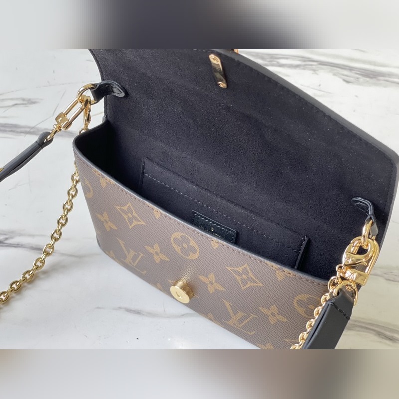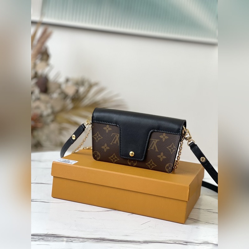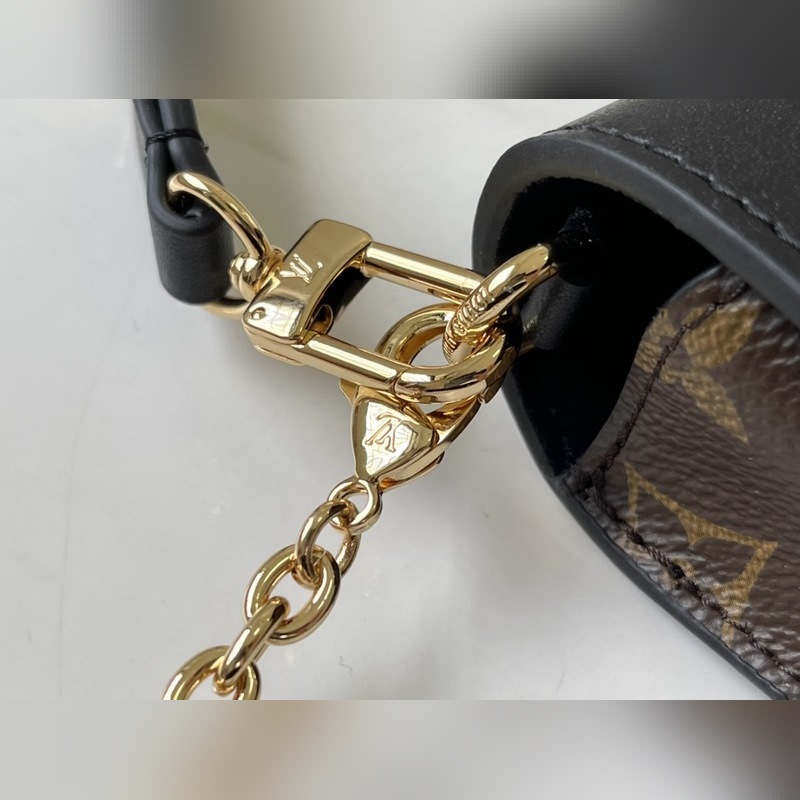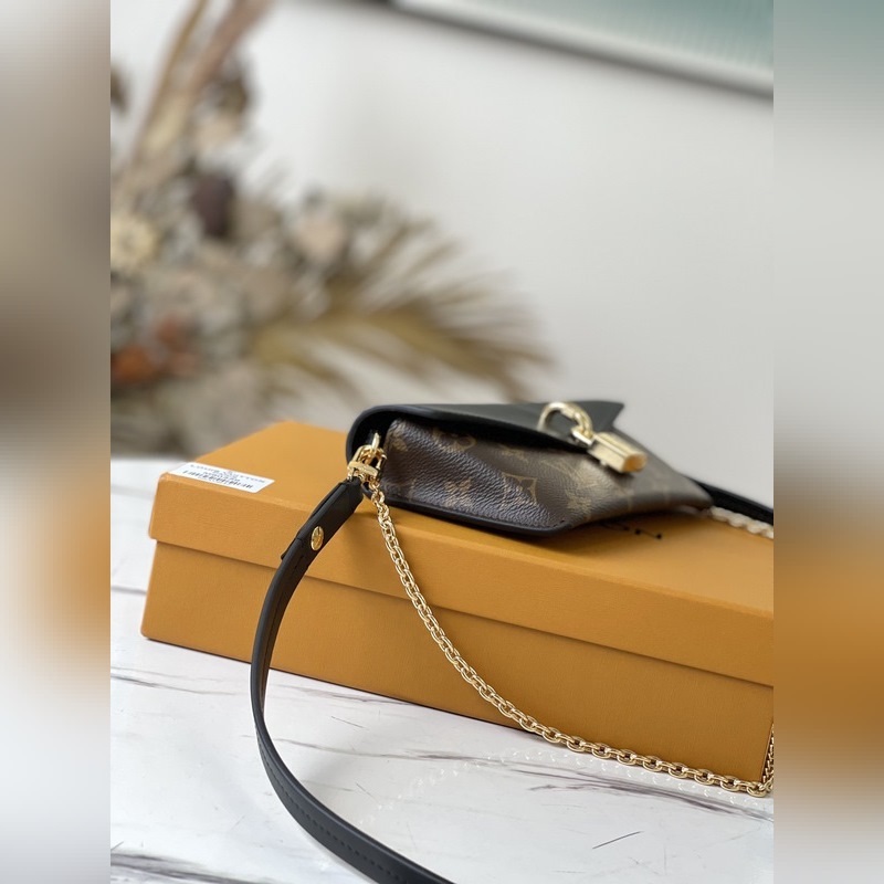 LV 모델 M80559 스트랩 핸드백에 부착된 검은색 자물쇠 클래식한 모노그램 캔버스와 부드러운 소가죽 소재의 플랩이 특징이며 뒷면에 끈 고리가 달려 있습니다. 자물쇠가 새겨진 자석 걸쇠가 안전하게 잠글 수 있게 해줍니다. 탈부착이 가능한 체인과 조절 가능한 어깨끈이 있어 어깨에 메거나 크로스 바디로 메는 것도 가능합니다. 크기: 19 x 11 x 3cm