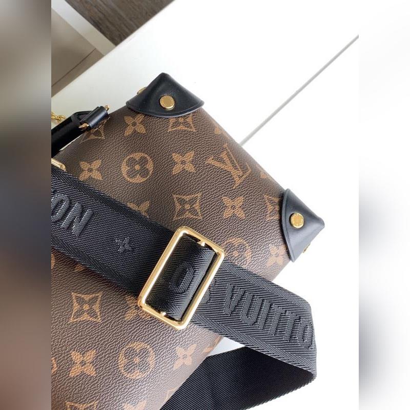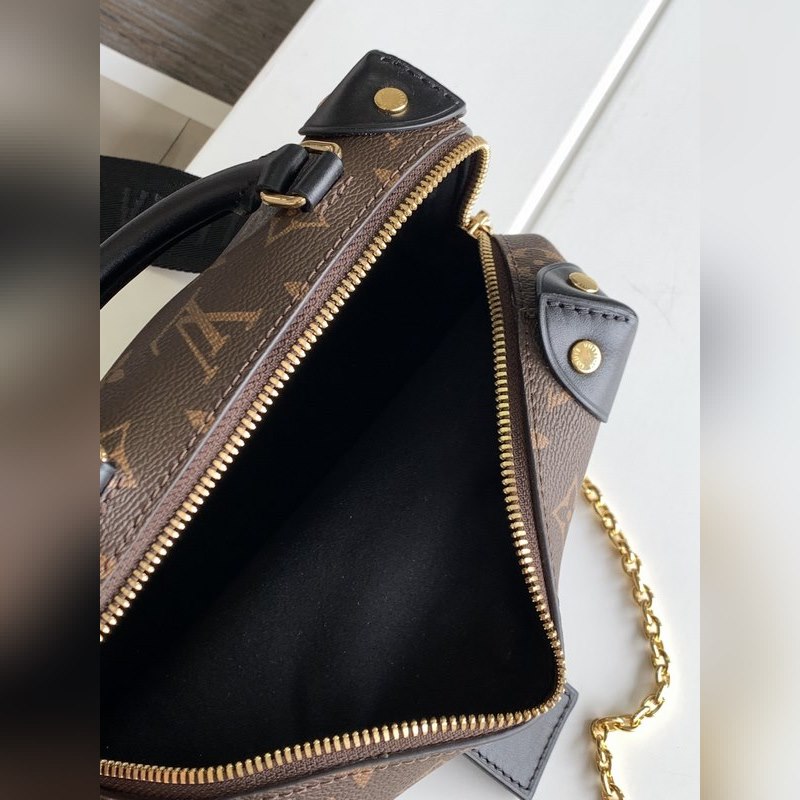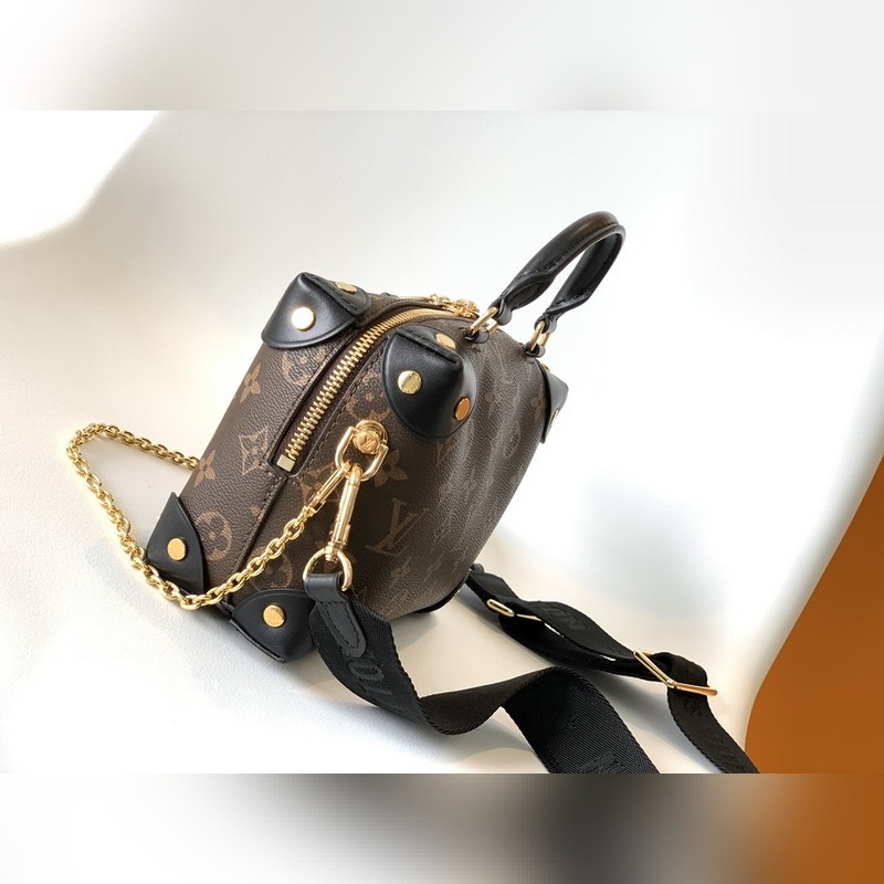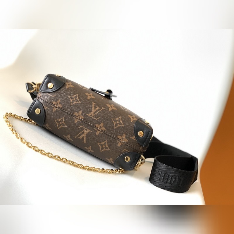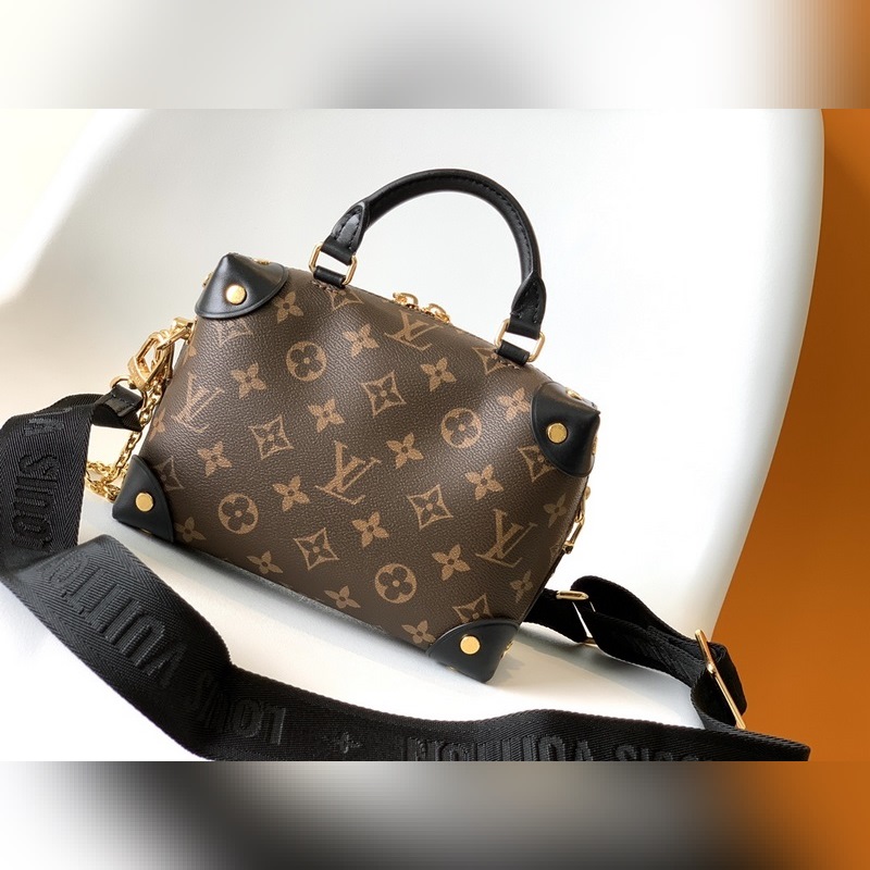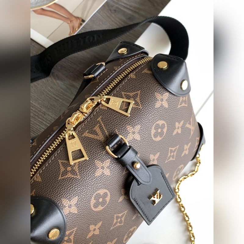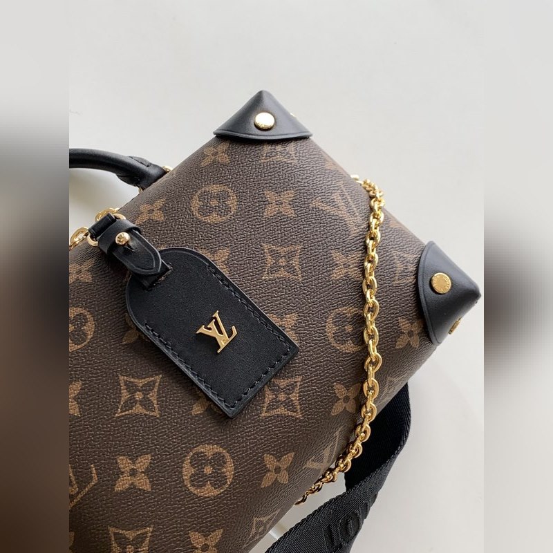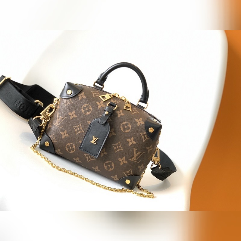 LV 모델 M45571 블랙 토트백 숄더백 모노그램 캔버스 소재의 쁘띠 말레 수플레 핸드백으로 스터드 장식 가죽 모서리와 가죽 이름표가 특징입니다. 루이 비통의 트렁크 제작 유산을 연상시키는 이 핸드백은 해상풍의 체인과 루이 비통 말레티에 자수 탈착식 넓은 어깨 스트랩으로 마무리되었습니다. 크기: 20.0 x 14.0 x 7.5cm