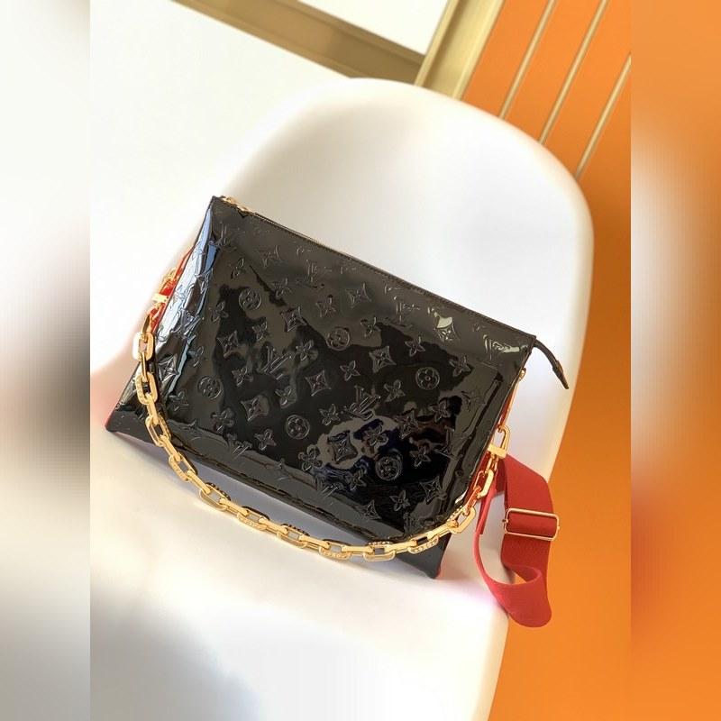 LV 모델 M57783 특허 가죽 블랙 쿠썽 미디엄 백 숄더백 크로스바디 백 2021년 봄/여름 패션쇼에서 큰 반향을 일으켰습니다. 양각 모노그램 양가죽으로 만든 쿠션 모양의 베개는 미니멀한 디자인에 아방가르드 스타일을 불어넣습니다. 어깨끈을 이용해 크로스 바디로 착용하거나 체인 백으로 사용할 수 있습니다. 이 숄더백은 가죽으로 만든 양각 체인 패브릭 숄더 컴파트먼트가 달려 있으며 팔 아래로 매고 다닐 수도 있습니다. 크기 34 × 24 × 12cm