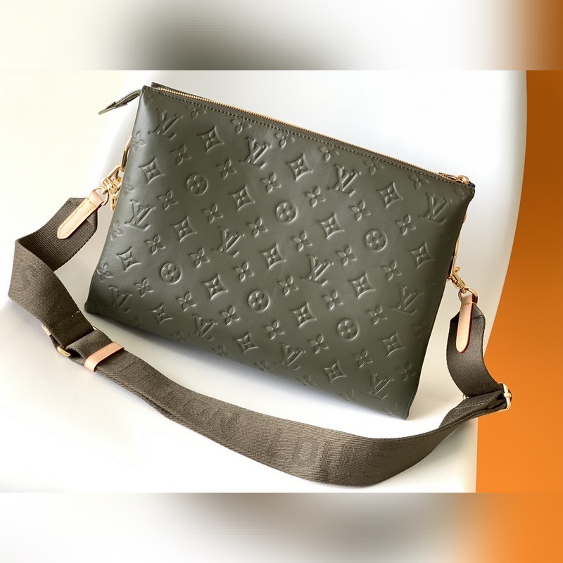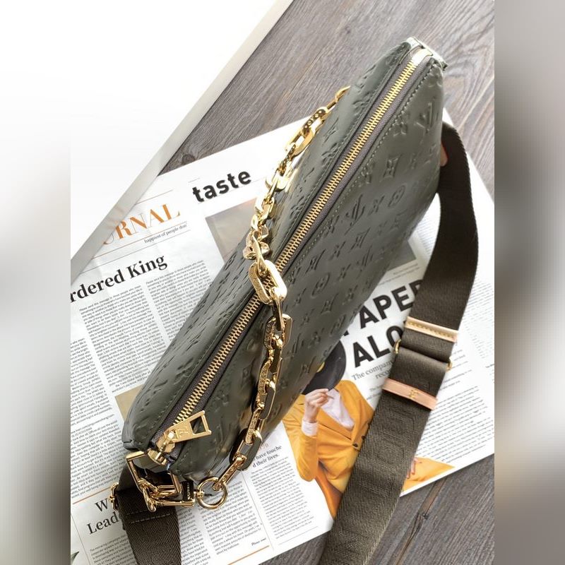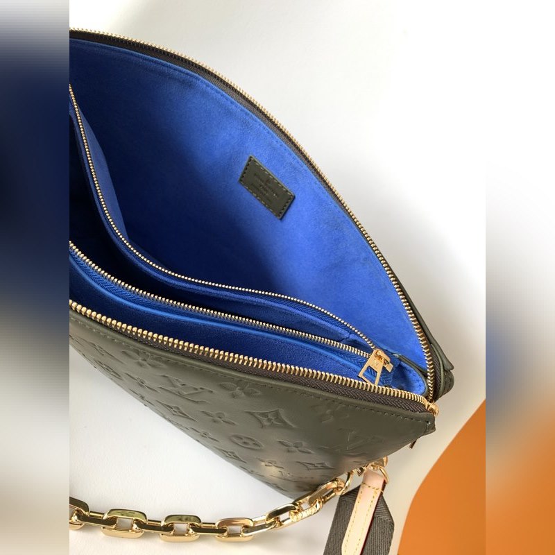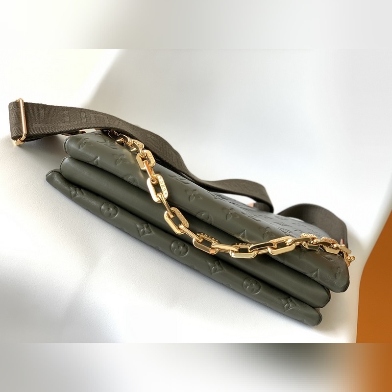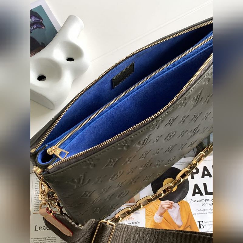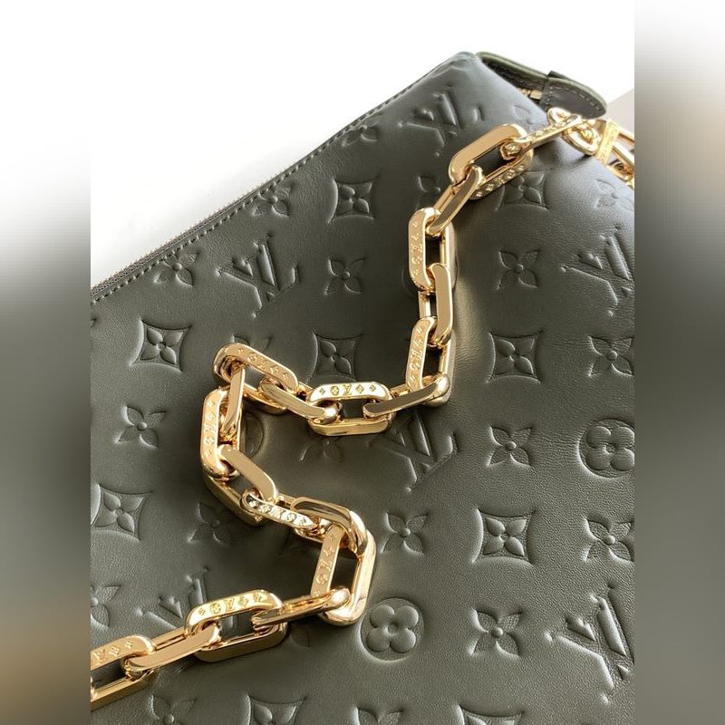 LV 모델 M57782 다크 그린 색상의 중간 크기의 핸드백 쿠썽 숄더백 2021년 봄/여름 패션쇼에서 눈길을 사로잡다 엠보싱 스웨이드 모노그램 송아지 가죽 트림 극세사 안감 금속 부품 내부 수납공간 지퍼 잠금 어깨끈: 탈부착 가능 길이 조절 가능 손잡이 길이: 30.0cm 조절 가능한 스트랩 길이: 50.0cm 체인: 제거 가능 체인 반 길이: 21.0cm 크기 34 x 24 x 12cm (길이 x 높이 x 너비)