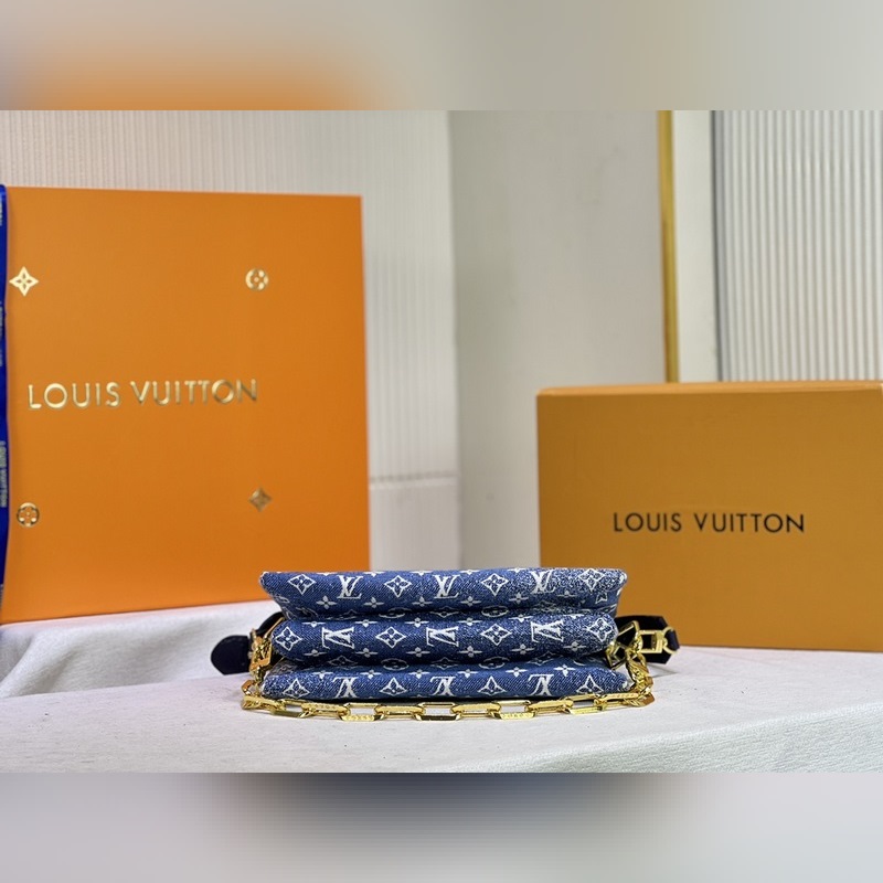 LV 데님 모델 M57782 57790 쿠쎌 소형 가방 쿠썽 클러치 백은 2021년 봄/여름 패션쇼에서 큰 인기를 끌었습니다. 양각 무늬가 새겨진 부드러운 양가죽으로 만든 쿠션 모양의 형태는 미니멀리스트 디자인에 날카로운 느낌을 더해줍니다. 어깨끈을 이용해 크로스 바디로 착용하거나 체인 백으로 착용하거나 팔 아래로 매고 다닐 수 있습니다. 크기 26 x 20 x 12cm