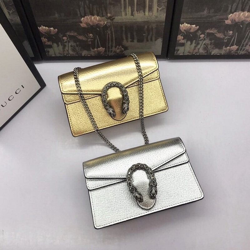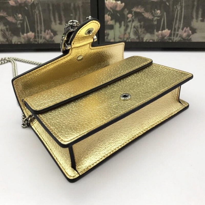 GUCCI 가죽 체인 울트라 미니 핸드백 모델 번호: 476432 골드 가방에 다른 가방을 연결할 수 있는 열쇠고리가 달린 가죽 체인 미니 가방. 이 클로저는 직조된 호랑이 머리 박차 버클로 구성되어 있습니다. 이 독특한 디테일은 그리스 신 디오니소스에게서 영감을 받은 것으로 디오니소스는 제우스가 보낸 호랑이를 타고 티그리스 강을 건넜습니다. 호랑이 머리 버클은 스와로브스키 크리스탈 보석으로 장식되어 있습니다. 튼튼한 직조 가죽으로 제작되었습니다. 크기: 16.5 x 10 x 4.5cm