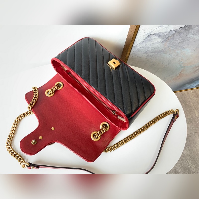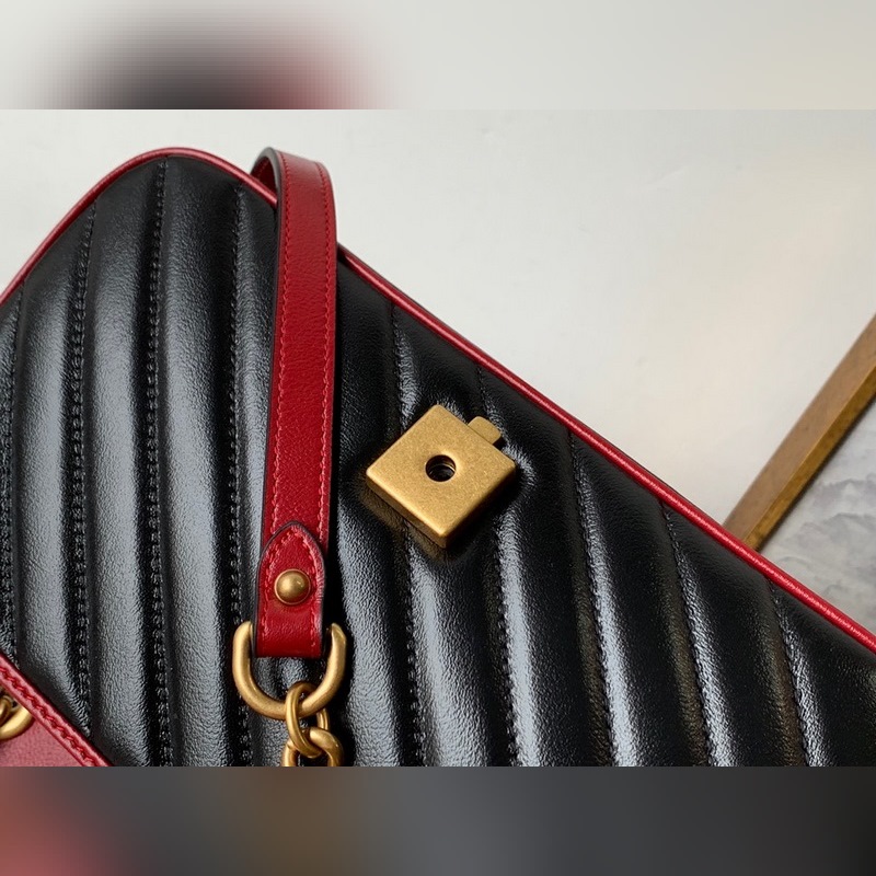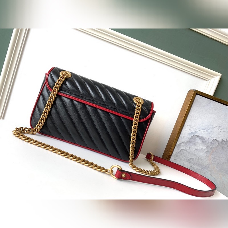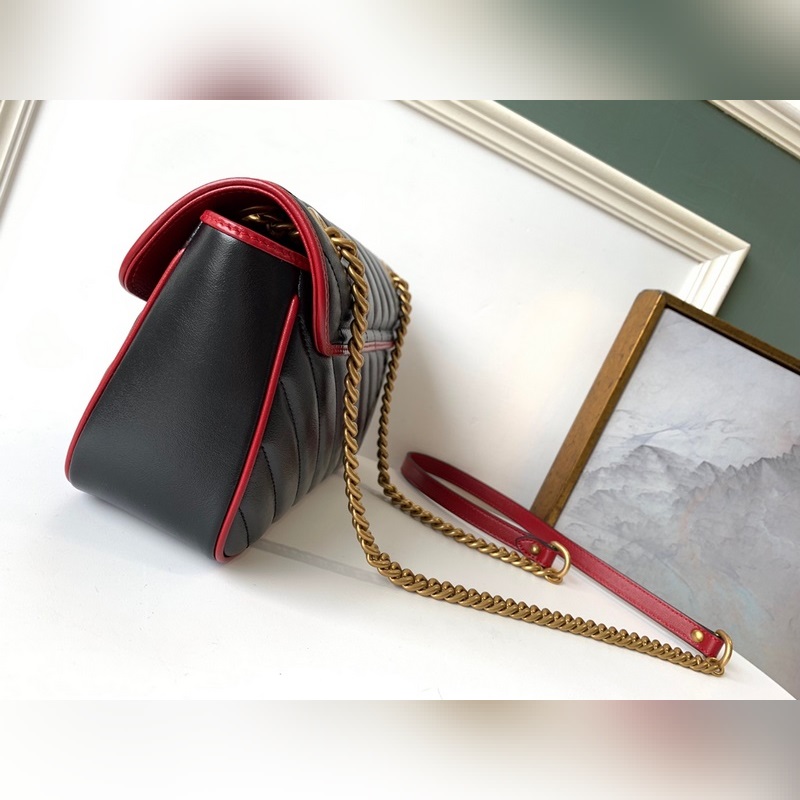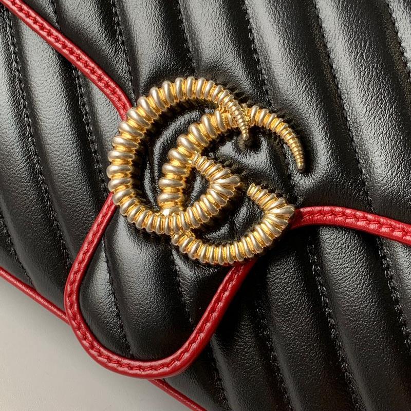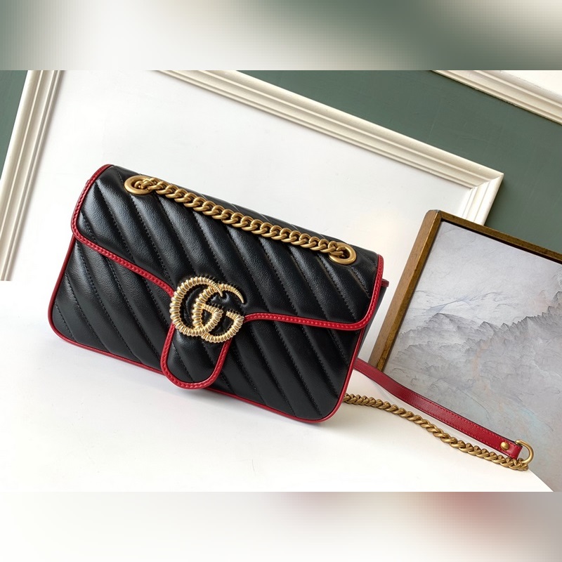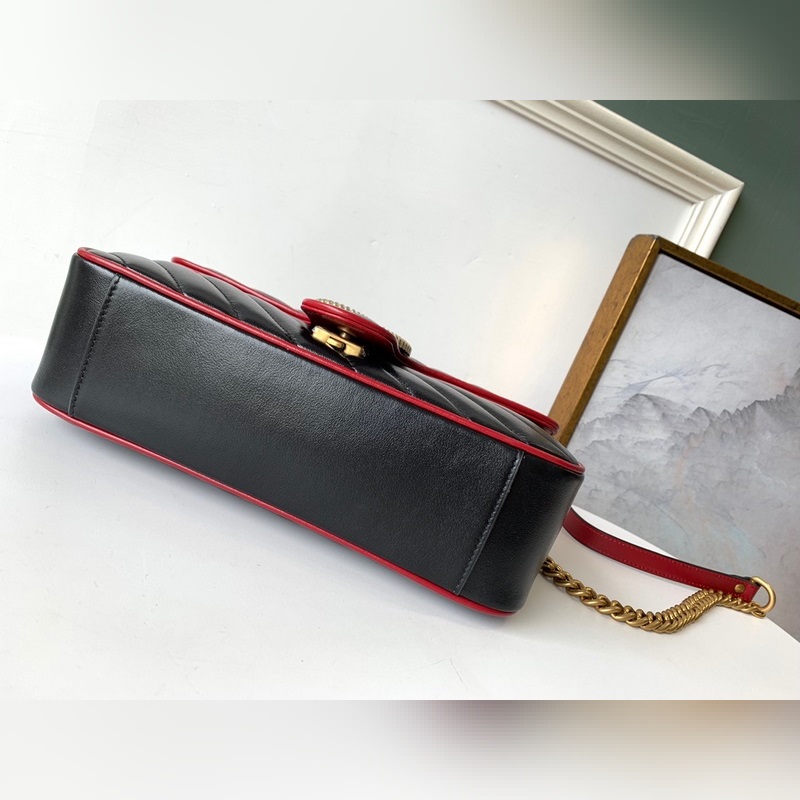 GUCCI GG 마몽트 숄더백 모델 443497 검정색과 빨간색 검은색 퀼팅 가죽은 빨간색 스티치와 조화를 이루고 꼬인 리본으로 장식된 이중 G자 장식 액세서리로 장식되어 초가을 컬렉션의 뛰어난 매력을 참신한 스타일로 해석합니다. 크기: 26/15/7cm
