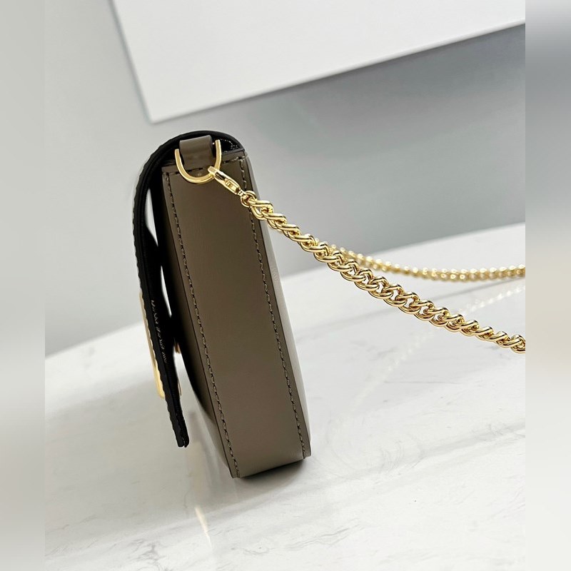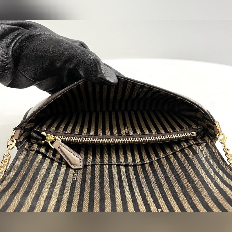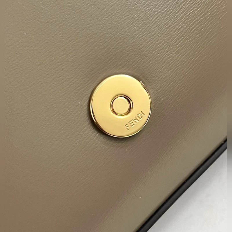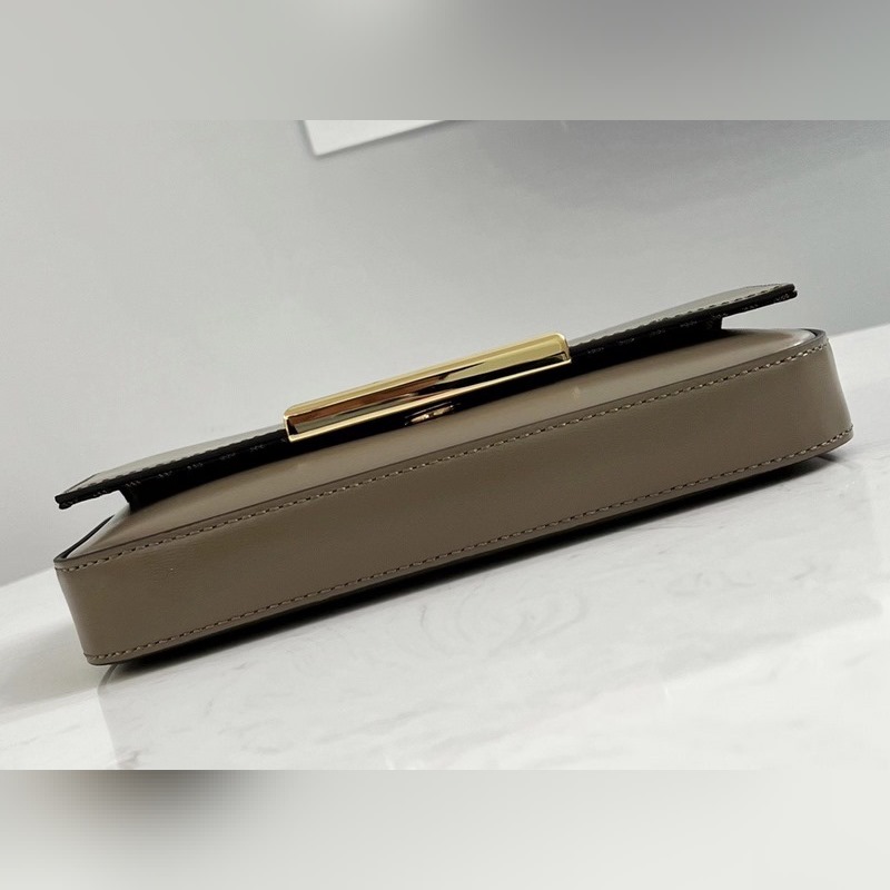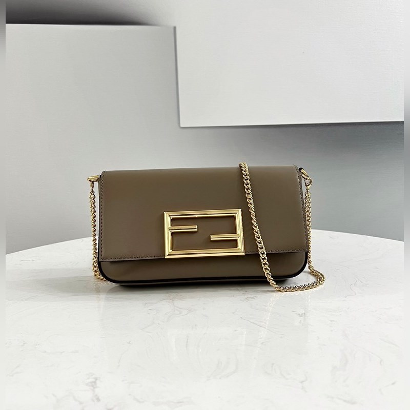 FENDI 기하학 미니 핸드백 회색 송아지 가죽 소재에 금속 FF 장식 플랩과 스냅 여밈 안감은 페킨 원단 플랫 포켓 탈착식 지퍼가 달린 Pequin 패브릭 내부 포켓 + 금색 마감 금속 부품 탈착식 체인 숄더 스트랩 손/십자/어깨 크기: 21.5*13*3CM