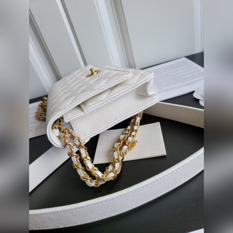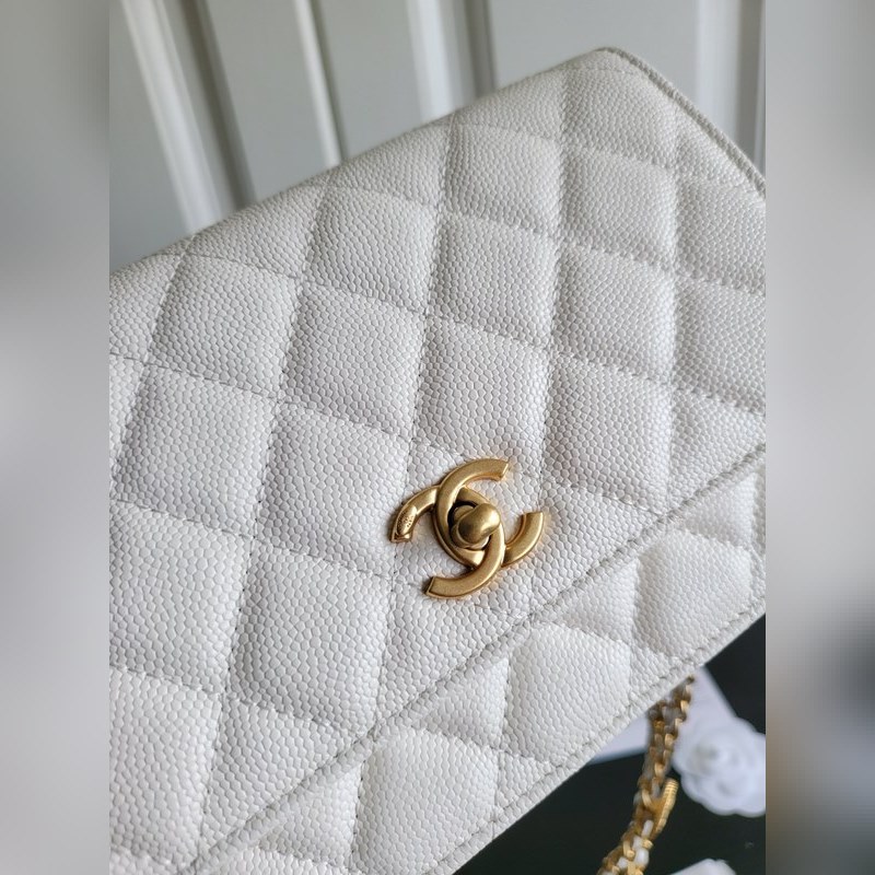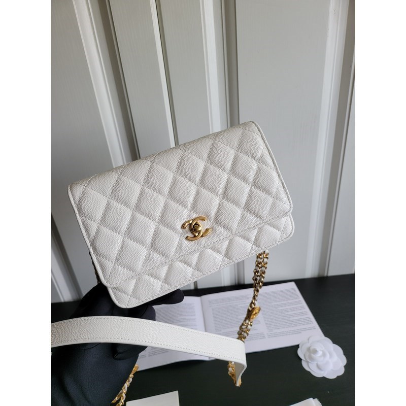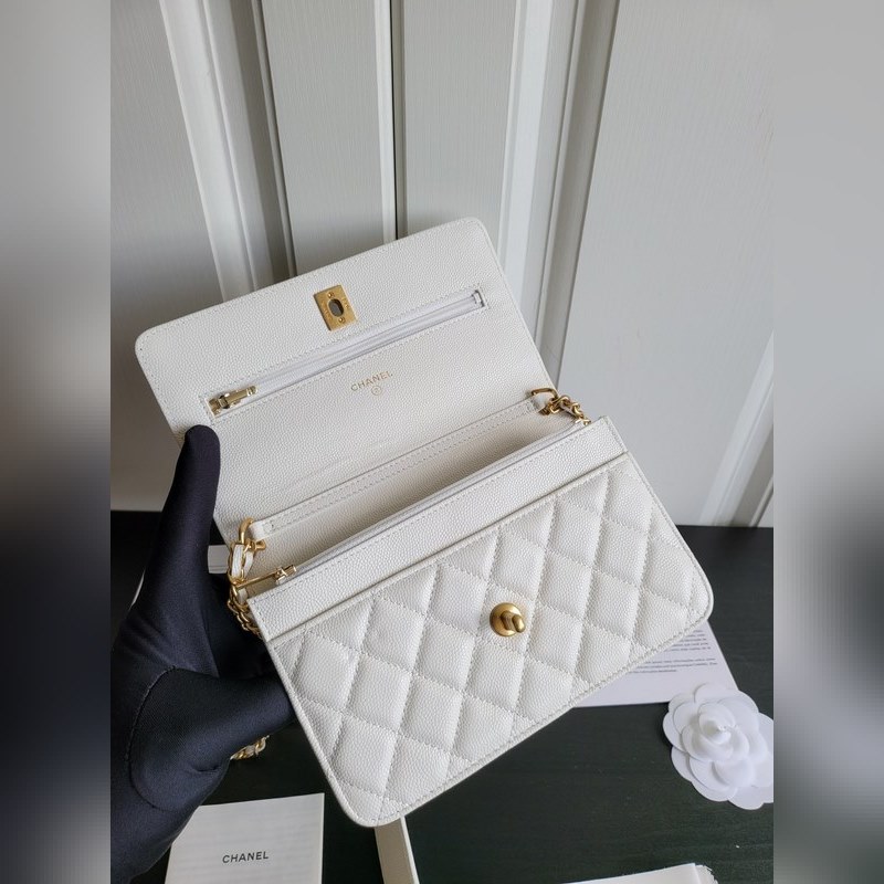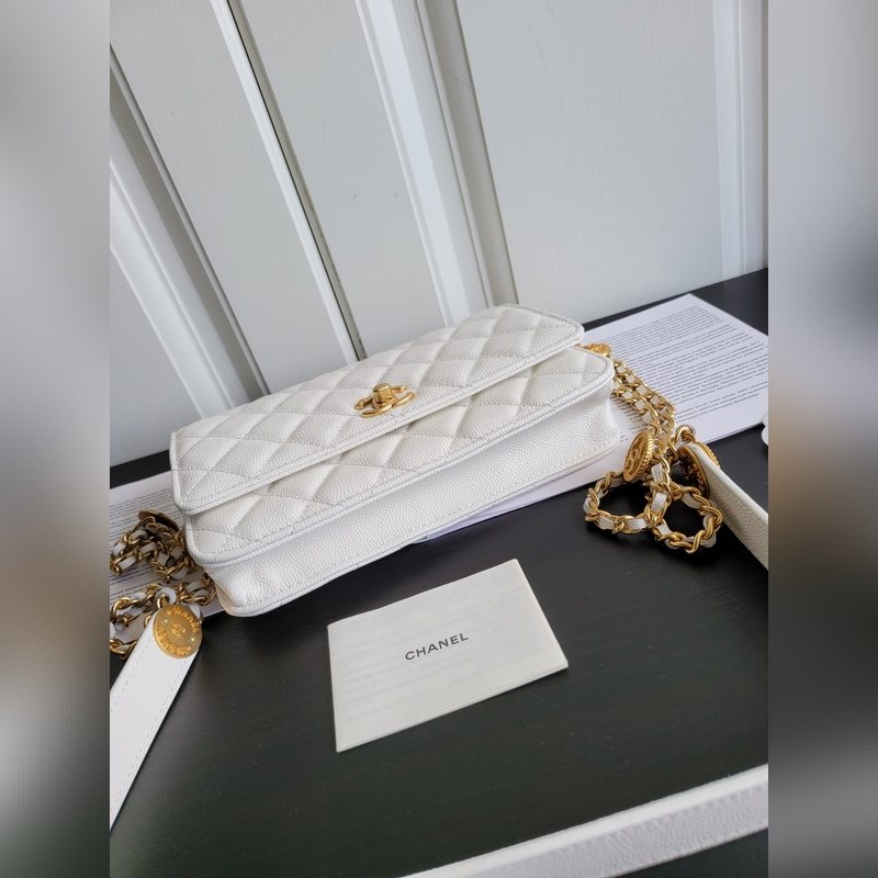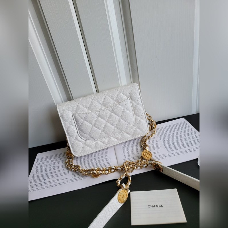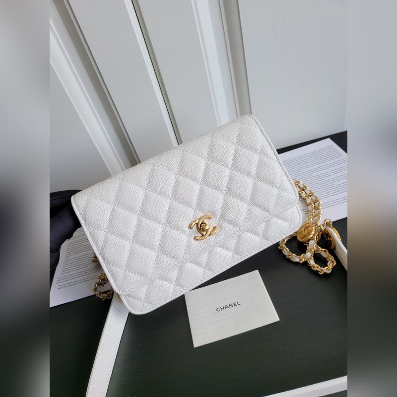 샤넬 골드 코인 파인 볼 소가죽 WOC 행운의 가방 골드 체인과 버튼 디자인 펜던트로 장식된 크로스 바디 백 크기: 19*13*3.5cm