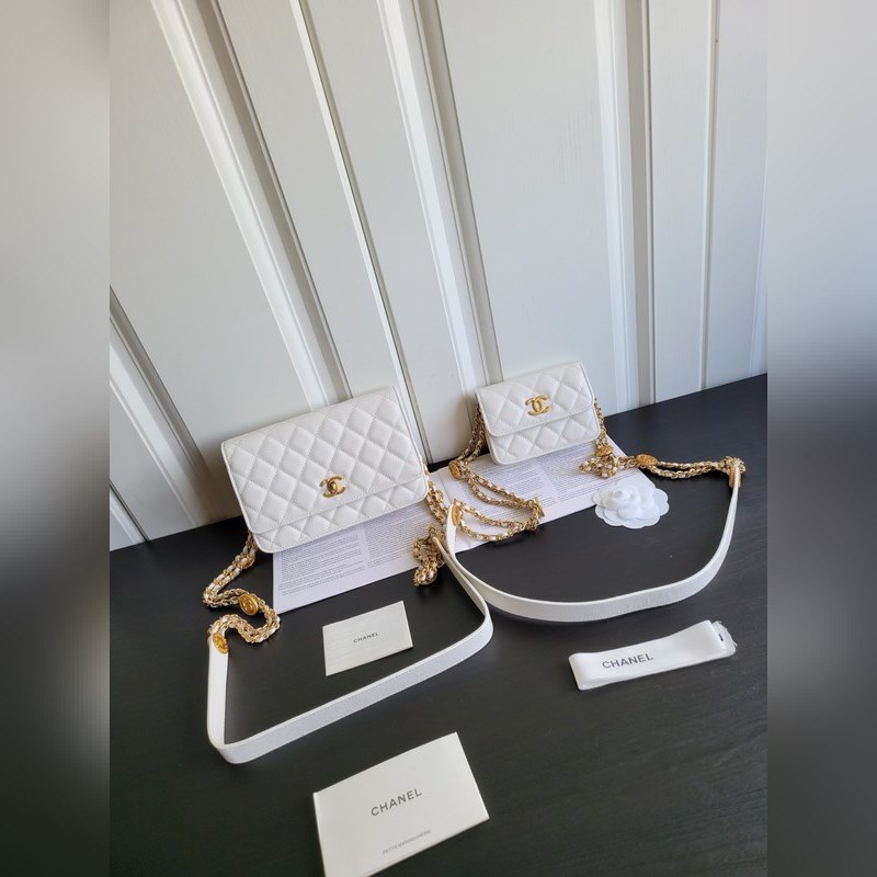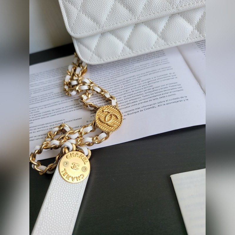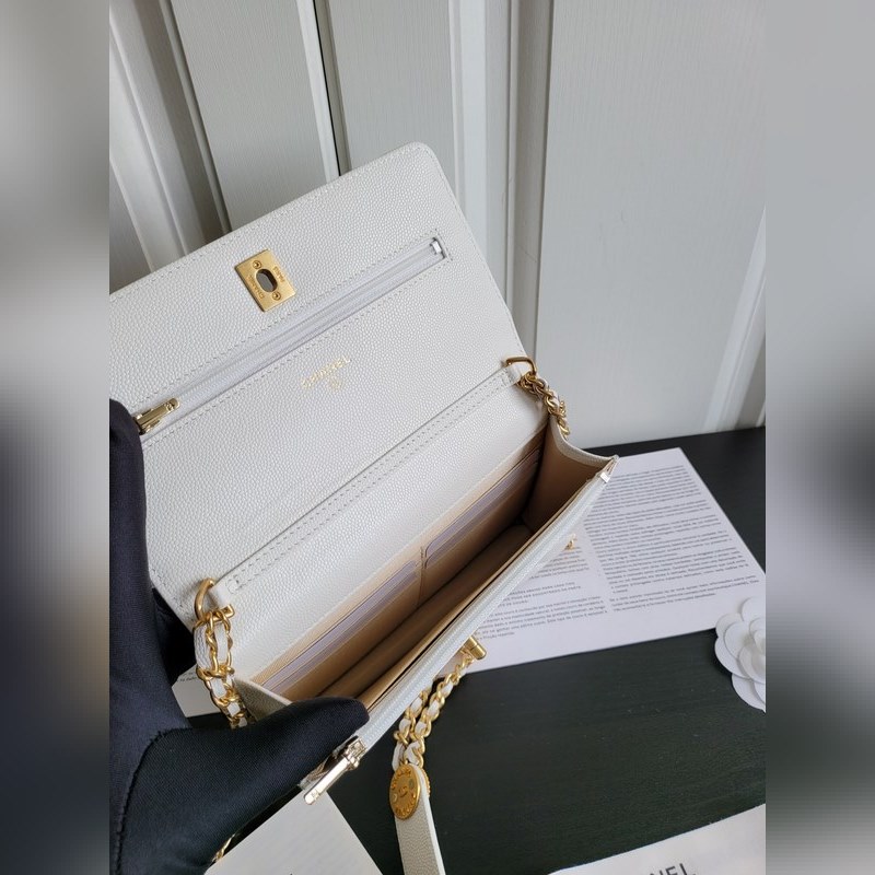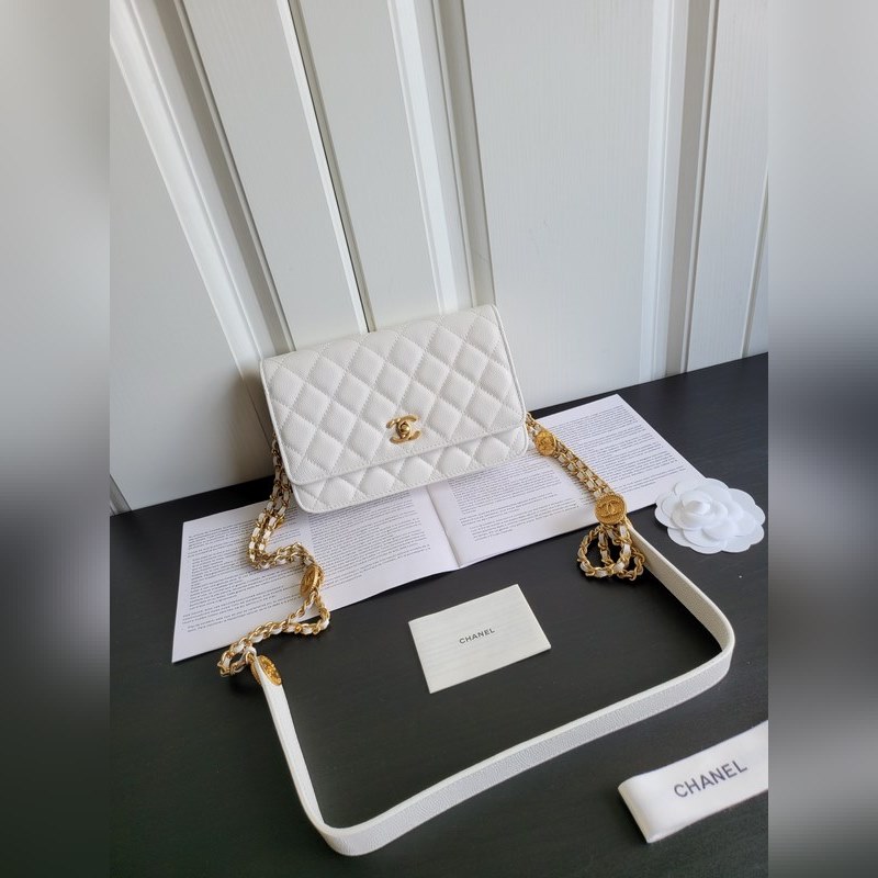샤넬 골드 코인 파인 볼 소가죽 WOC 행운의 가방 골드 체인과 버튼 디자인 펜던트로 장식된 크로스 바디 백 크기: 19*13*3.5cm