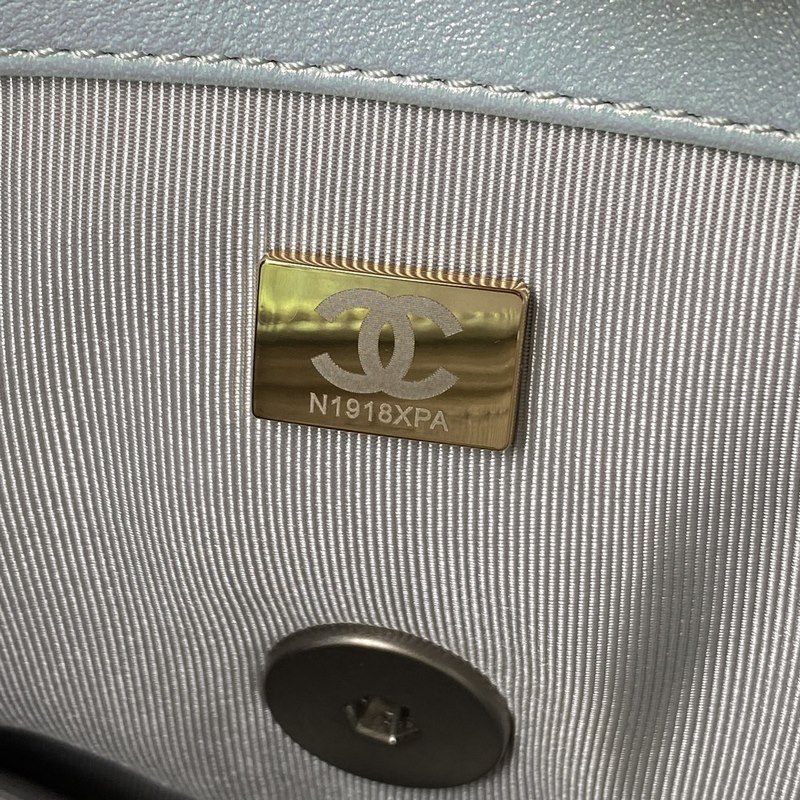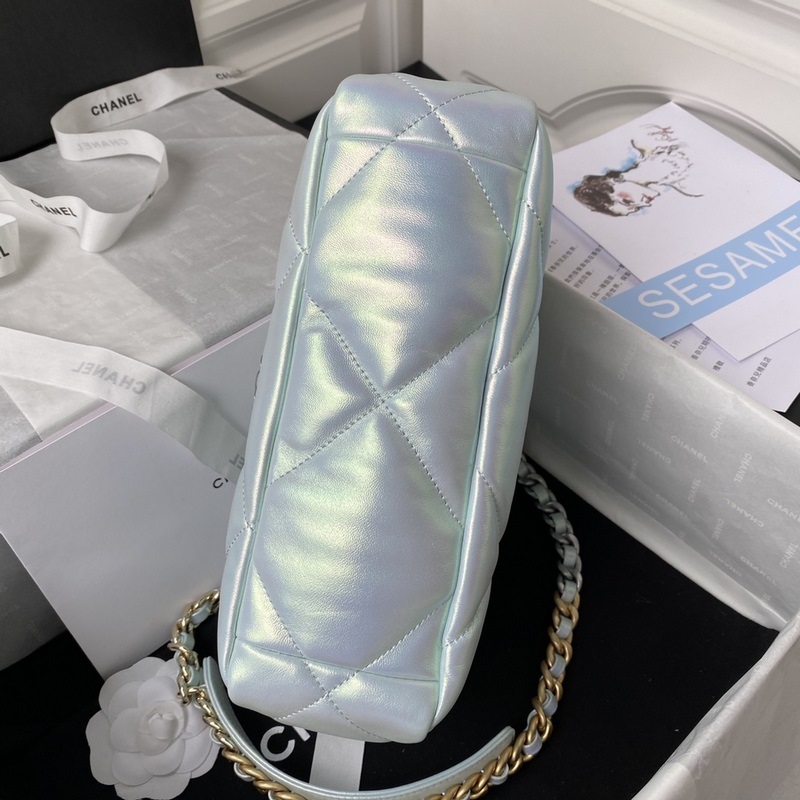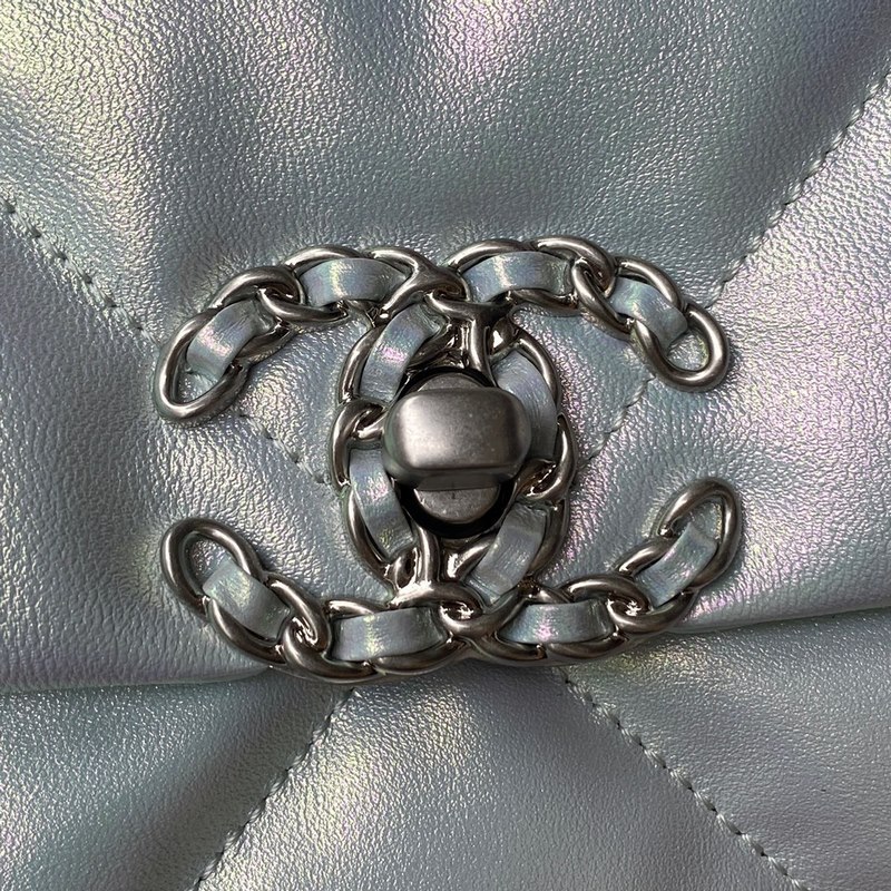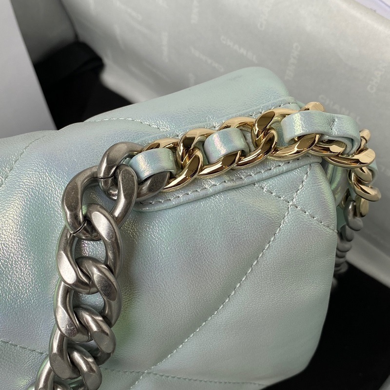 샤넬 2019 가을/겨울 가방 진주 빛의 하늘색과 은색 체인이 결합된 클래식한 베개 가방 이 가방은 칼 라거펠트와 새로운 디렉터인 버지니 비아르가 디자인했습니다. 이 가방은 또한 할머니가 우리에게 준 마지막 선물이기도 합니다. 샤넬의 새로운 가방 모델인 CHANEL 19는 클래식한 2.55 가방의 탄생일에서 이름을 따왔습니다. 이 가방은 퀼팅 패턴 가죽 체인 백 더블 C 로고 등 코코 샤넬의 모든 클래식 요소를 결합한 제품입니다. 첫눈에 반할 것입니다! 처음 보시면 항상 그리워질 것입니다. 손에 들거나 몸에 걸치거나 옆에 두거나 어깨에 메고 다닐 수 있습니다. 완벽하고 다재다능한 가방입니다! 촉감이 부드럽고 편안합니다. 크기 26cm