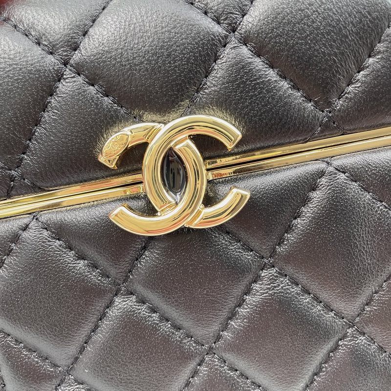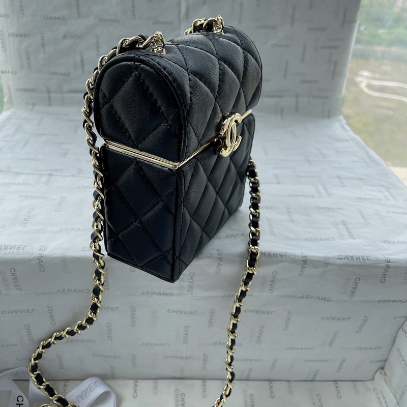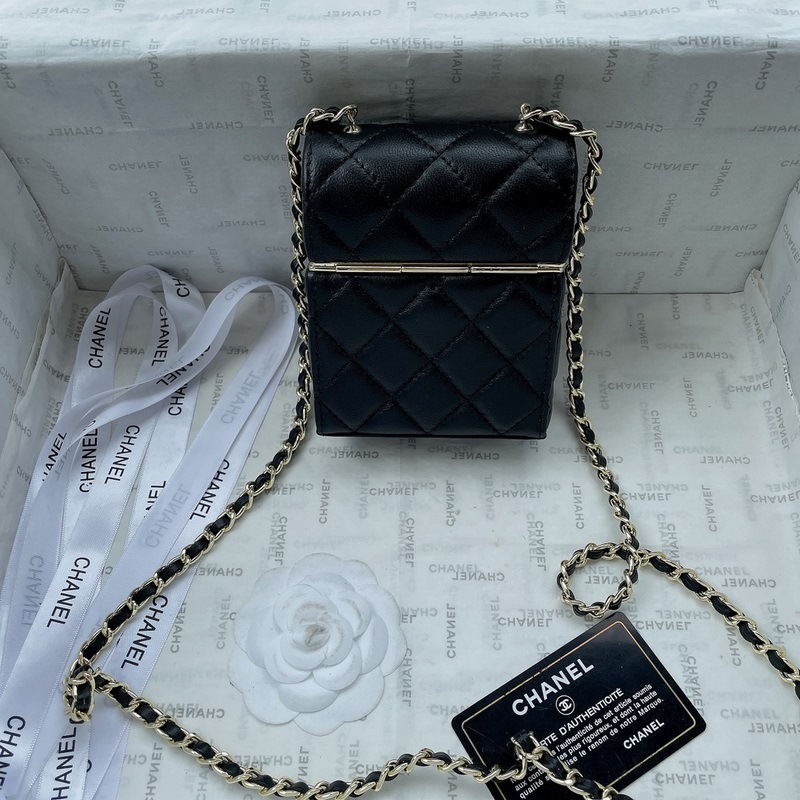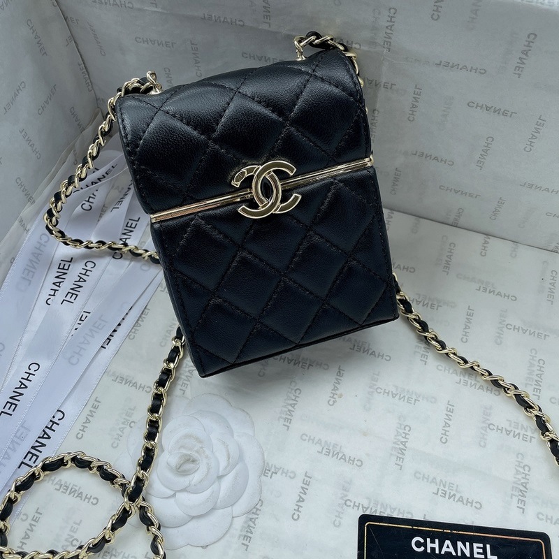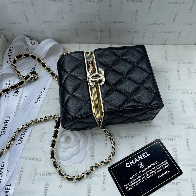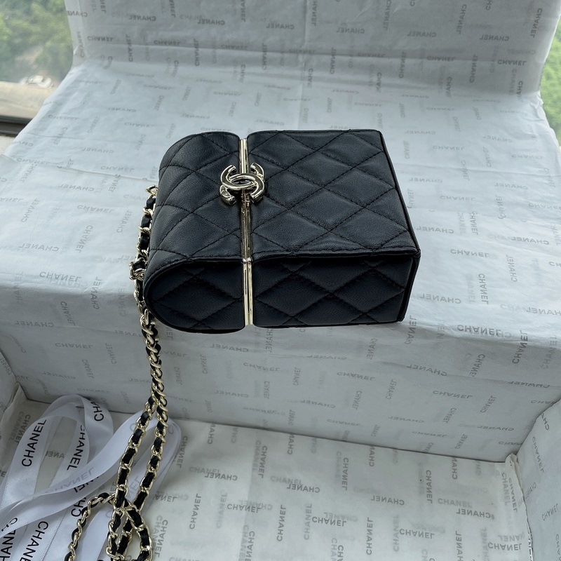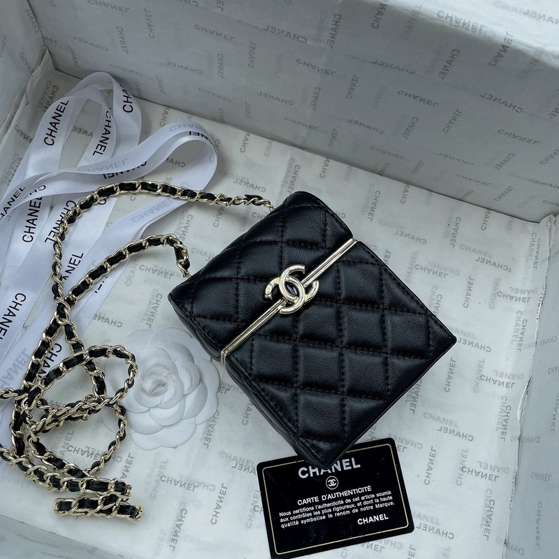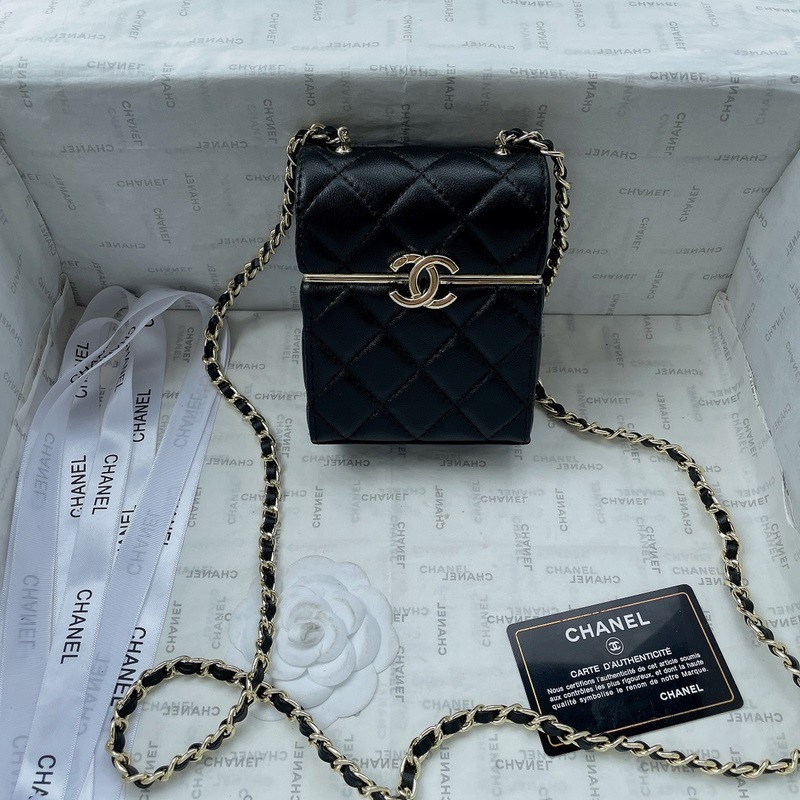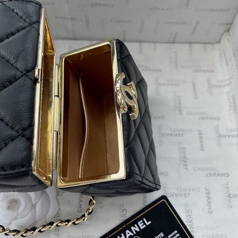 샤넬의 새로운 봄/여름 박스형 가방 거울이 달린 내부. 내구성이 좋은 양가죽과 금색 하드웨어로 제작된 이 작은 상자는 사랑입니다. 크기: 13x10cm