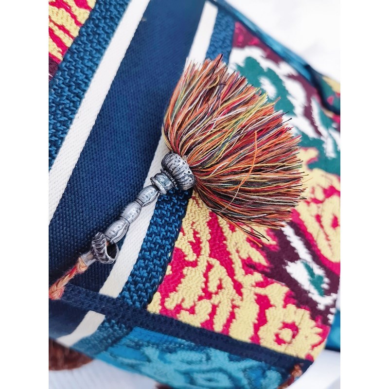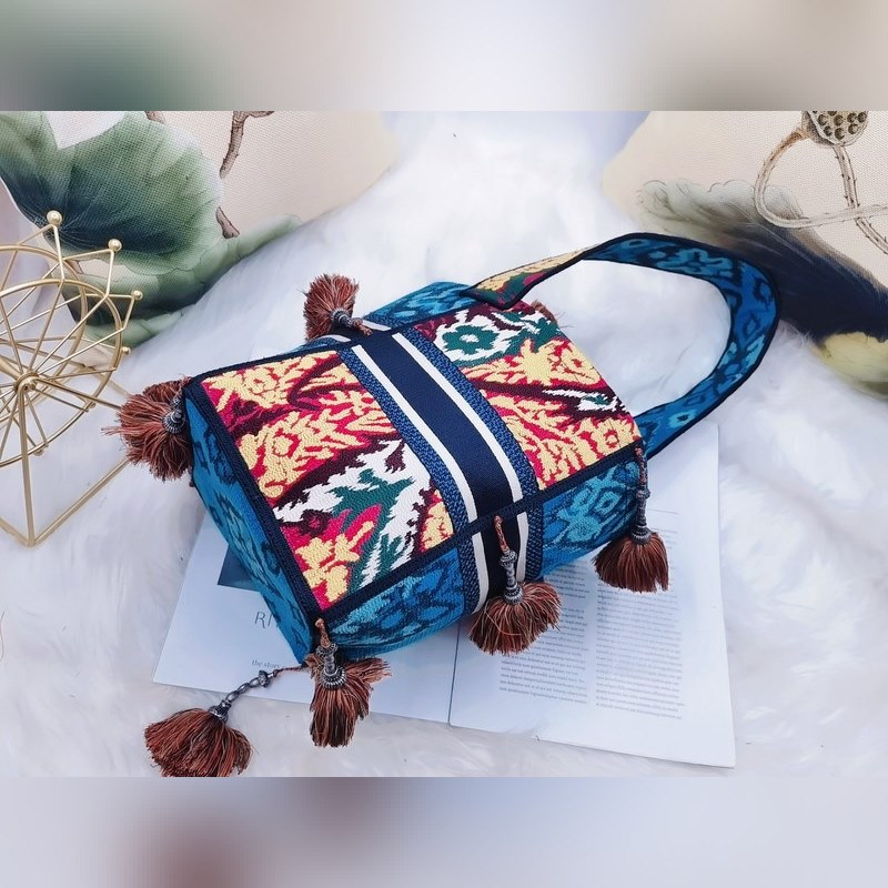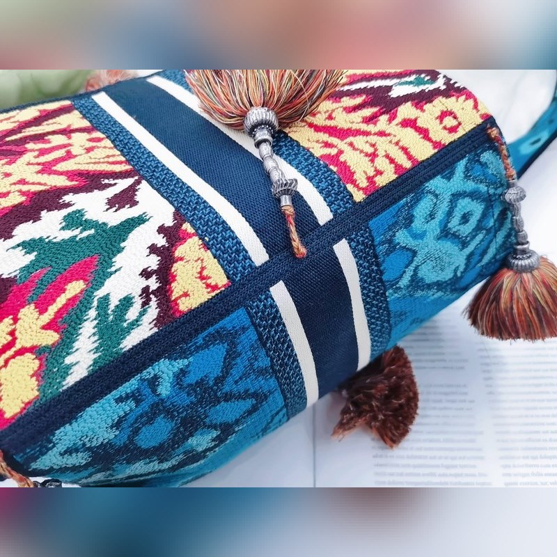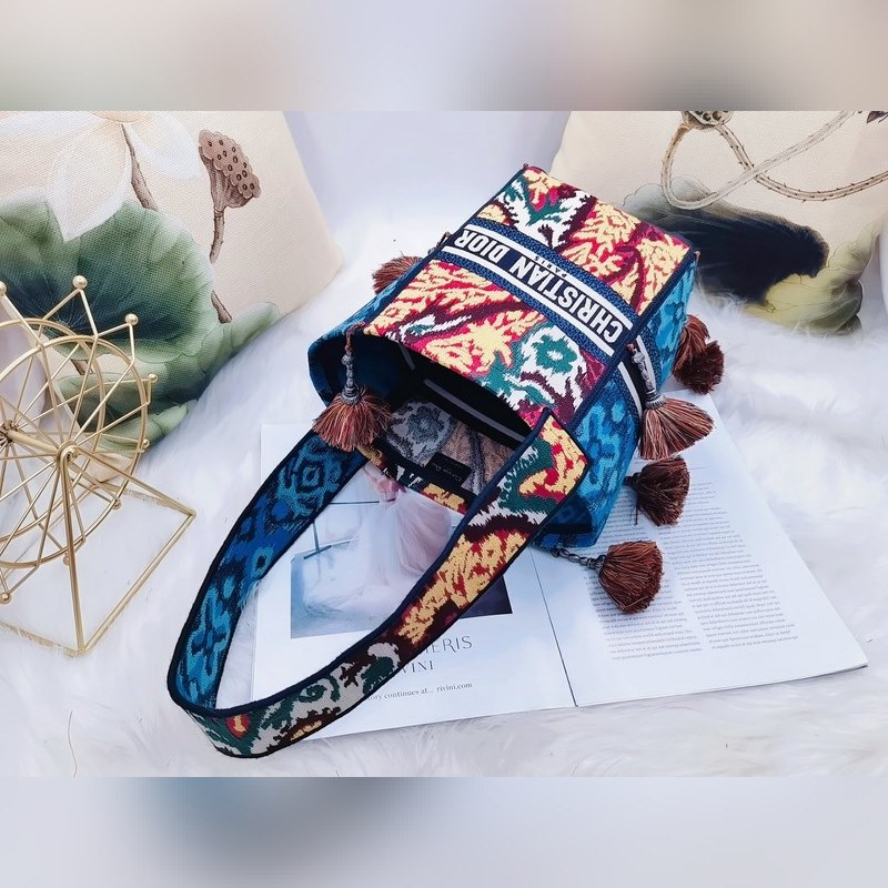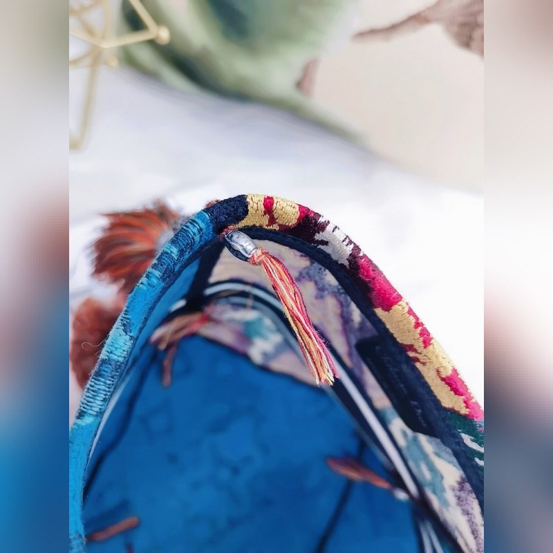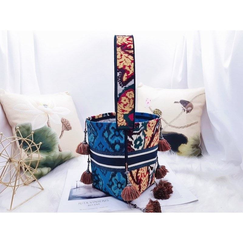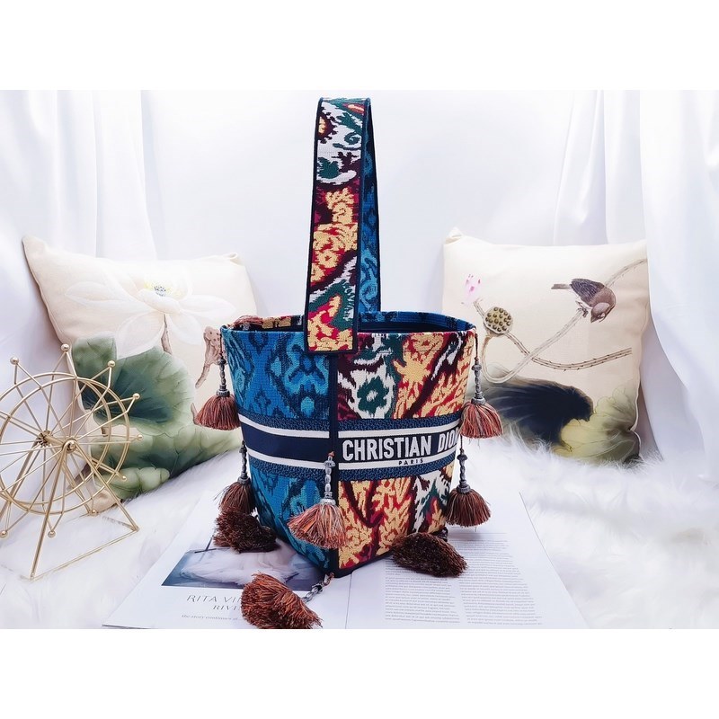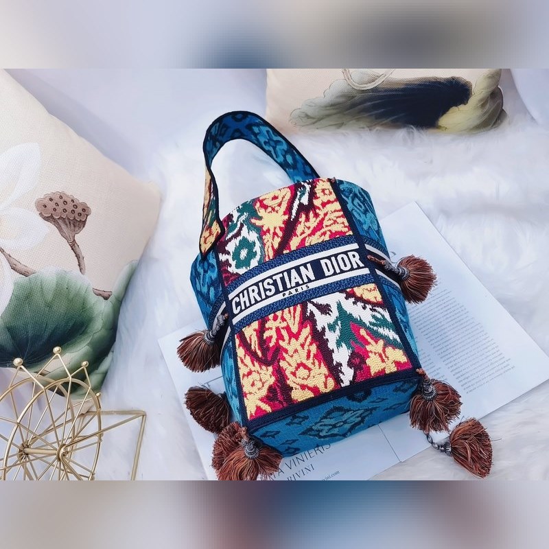 DIOR D-버블 버킷 백 블루 캐슈 플라워 모던하고 세련된 이 제품은 전시회에서 멋진 모습을 선보였습니다. 이 제품은 여러 가지 색상의 디올 페이즐리 패턴으로 수놓아졌으며 앞면에 파란색 Christian Dior 로고가 있습니다. 이 제품은 손으로 들거나 넓은 어깨 끈으로 어깨에 메고 다니며 수제 폼폼으로 장식되어 있어 더욱 매력적입니다. 포엠은 빈티지 실버 마감의 금속 디테일로 장식되어 있습니다. 앞면에 있는 Christian Dior 로고 손으로 들거나 어깨에 메고 다닐 수 있습니다. 크기: 16 x 25 x 16cm