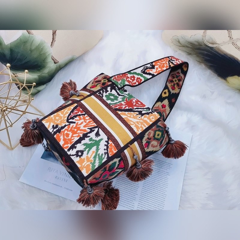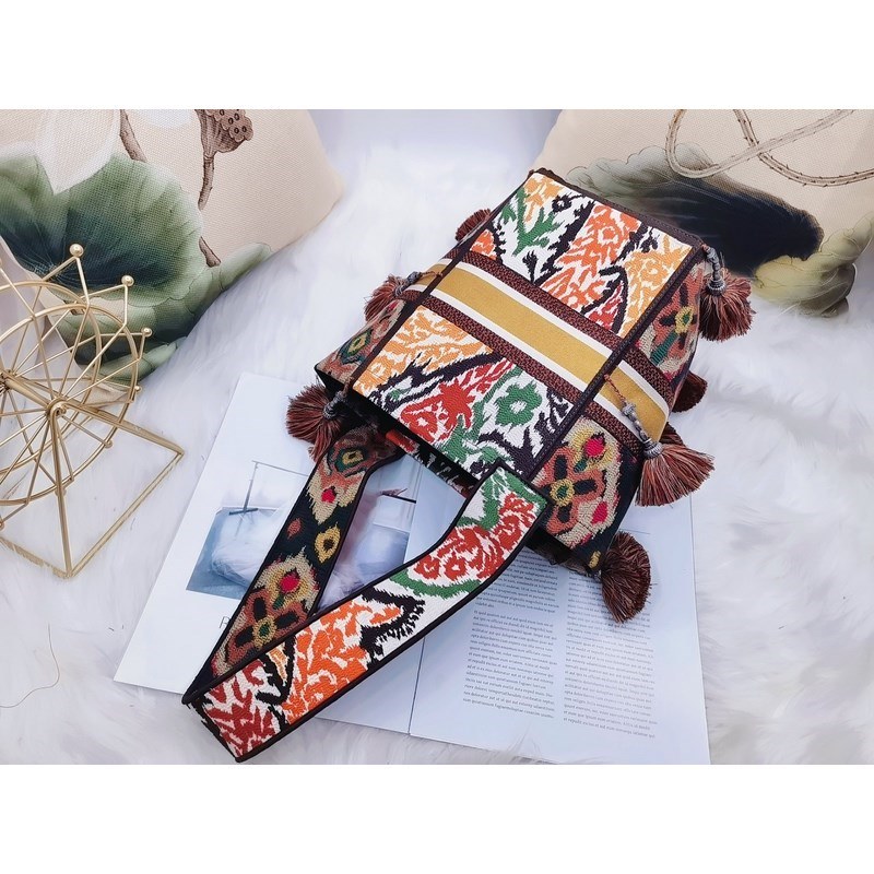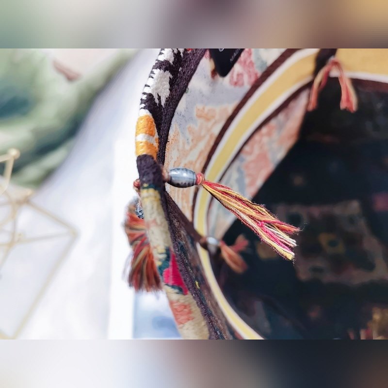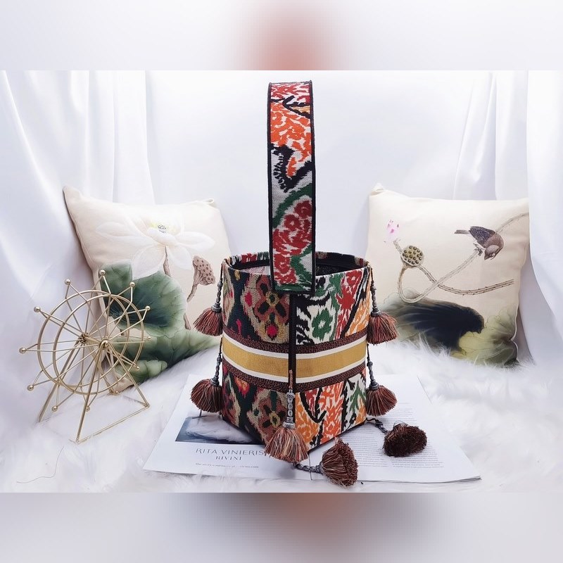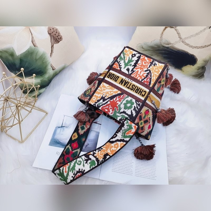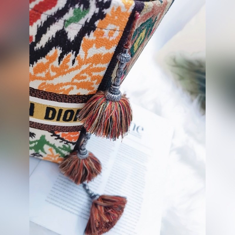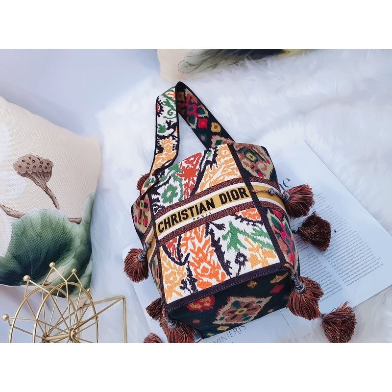 DIOR D-버블 버킷백 컬러 캐슈 꽃 모던하고 패셔너블한 이 제품은 전시회에서 눈부신 모습을 선보였습니다. 이 제품은 전체에 혼합 색상의 디올 페이즐리 패턴이 자수되어 있으며 앞면에는 파란색 Christian Dior 시그니처가 특징입니다. 이 제품은 손으로 들거나 어깨에 메는 넓은 어깨 끈이 함께 제공되며 수제 폼폼으로 장식되어 있어 더욱 매력적입니다. 포엠은 빈티지 실버 마감의 금속 디테일로 장식되어 있습니다. 앞면에 있는 Christian Dior 로고 손으로 들거나 어깨에 메고 다닐 수 있습니다. 크기: 16 x 25 x 16cm