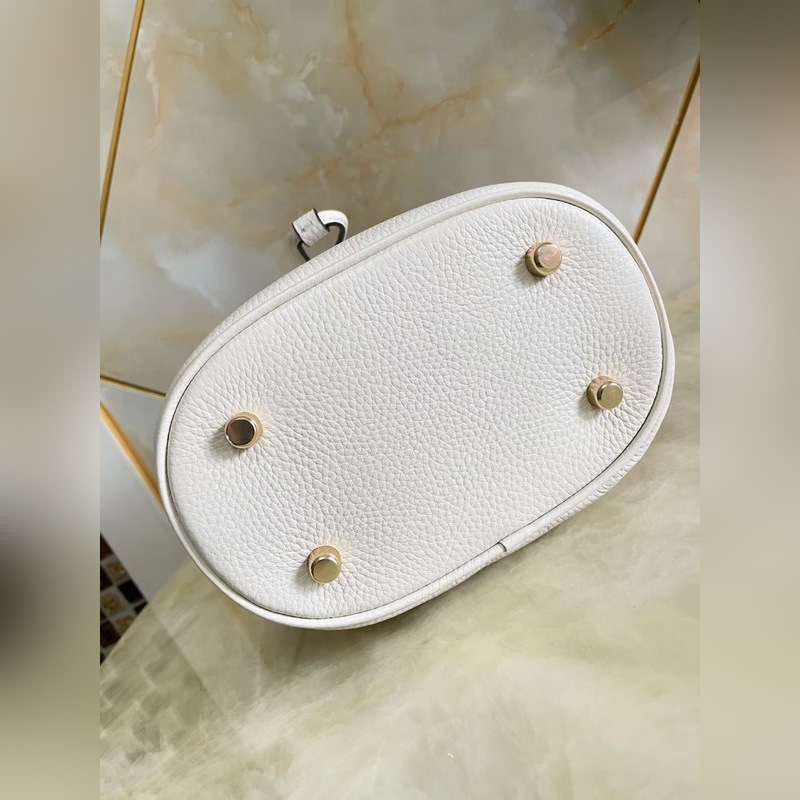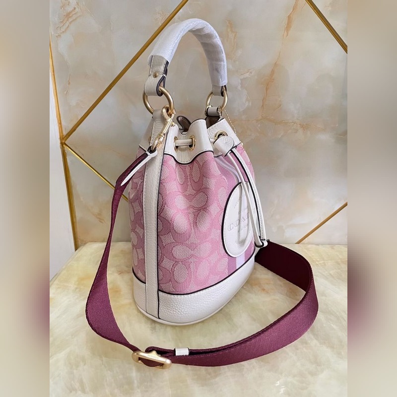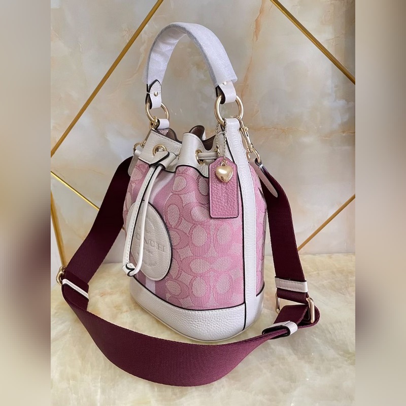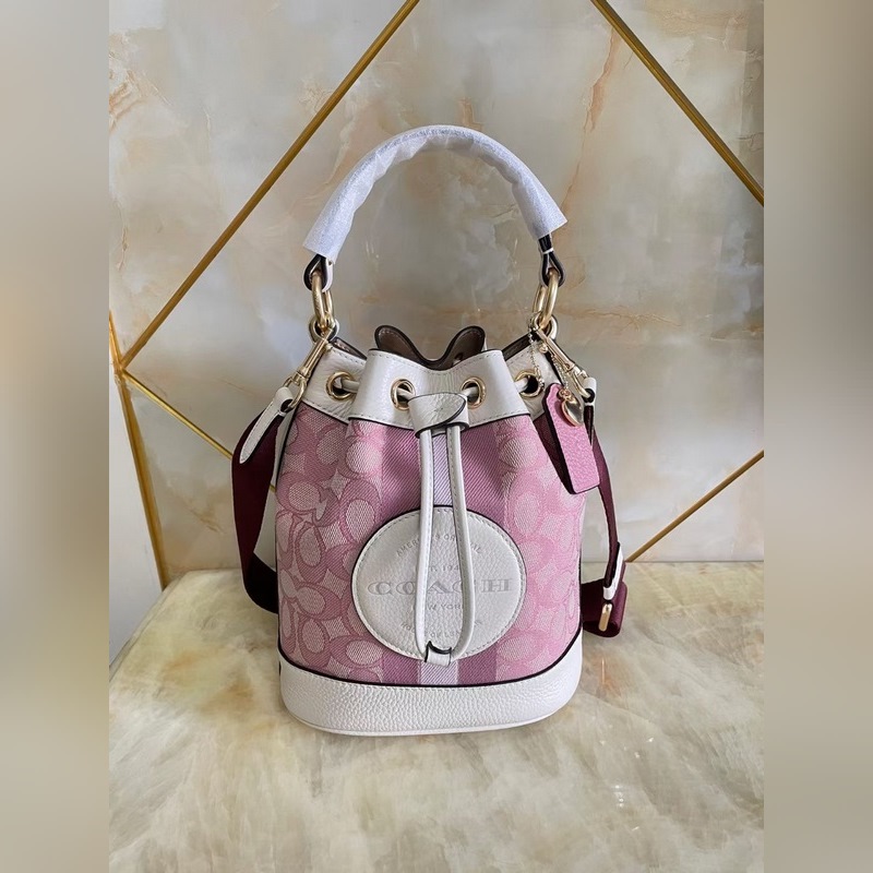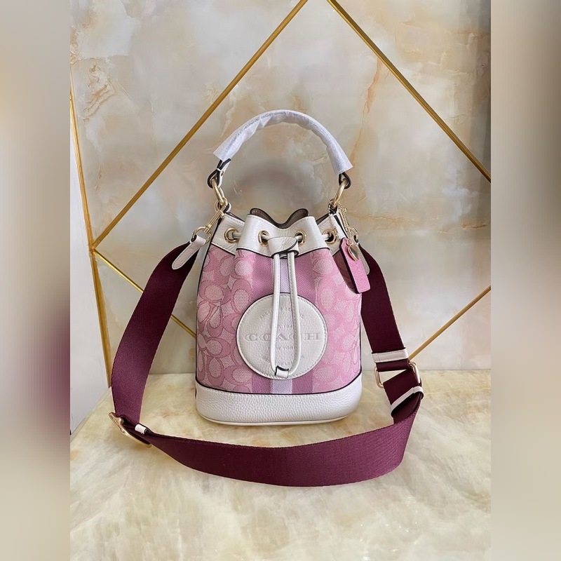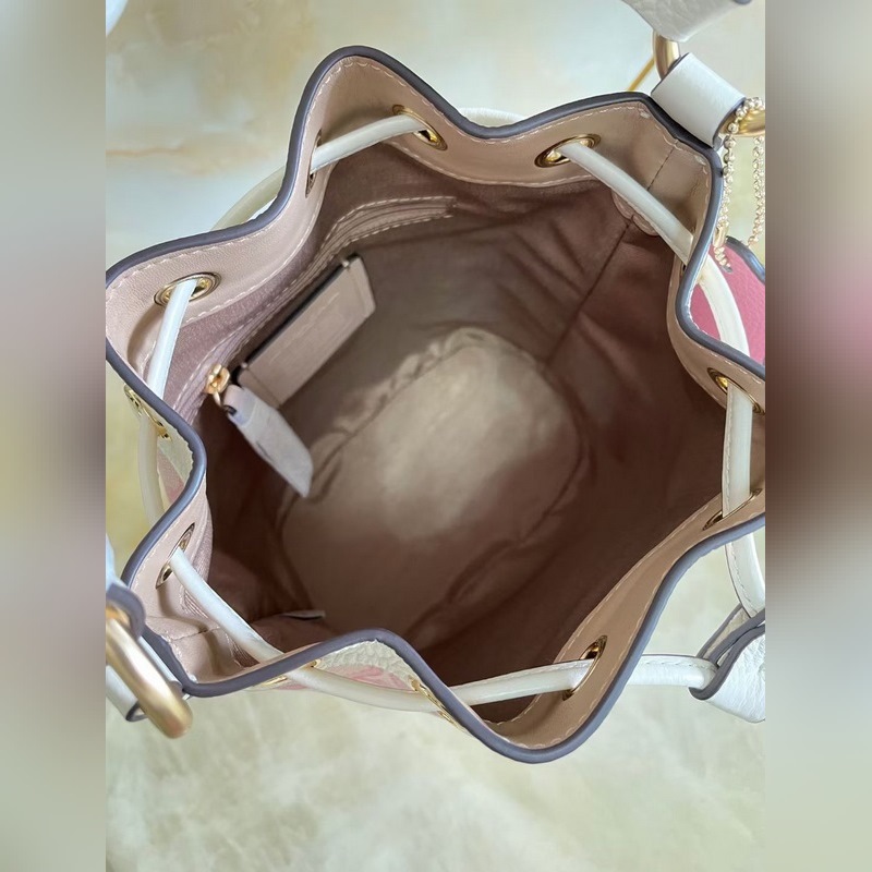 코치/?? 모델 7964 중간 크기의 버킷 백 탈부착이 가능하고 길이 조절이 가능한 긴 어깨 스트랩 최고급 가죽에 핑크색 로고 직조 패브릭... 크기: 18x22x11cm