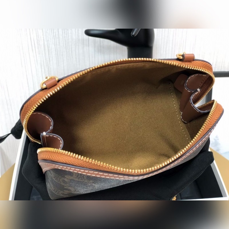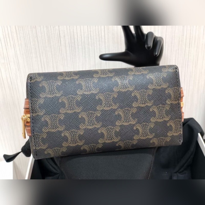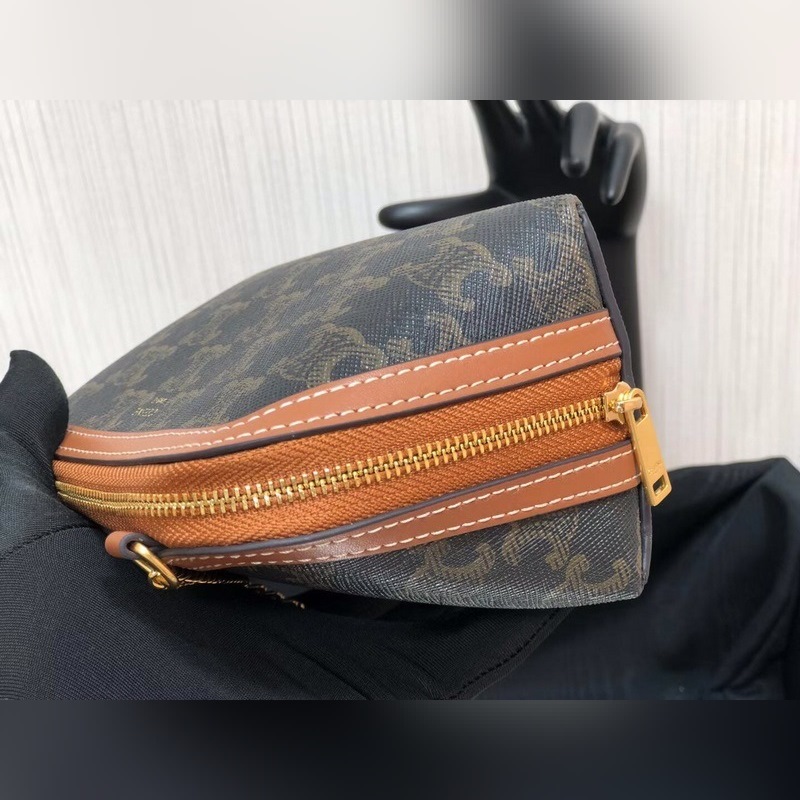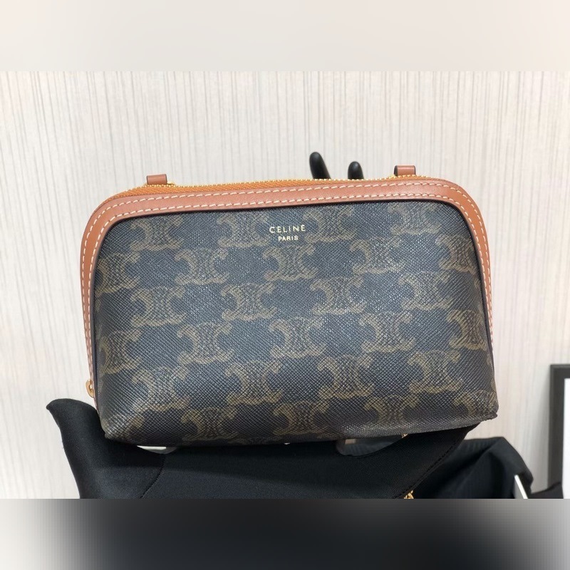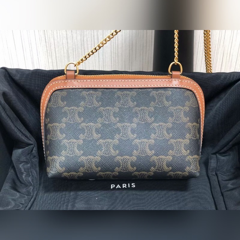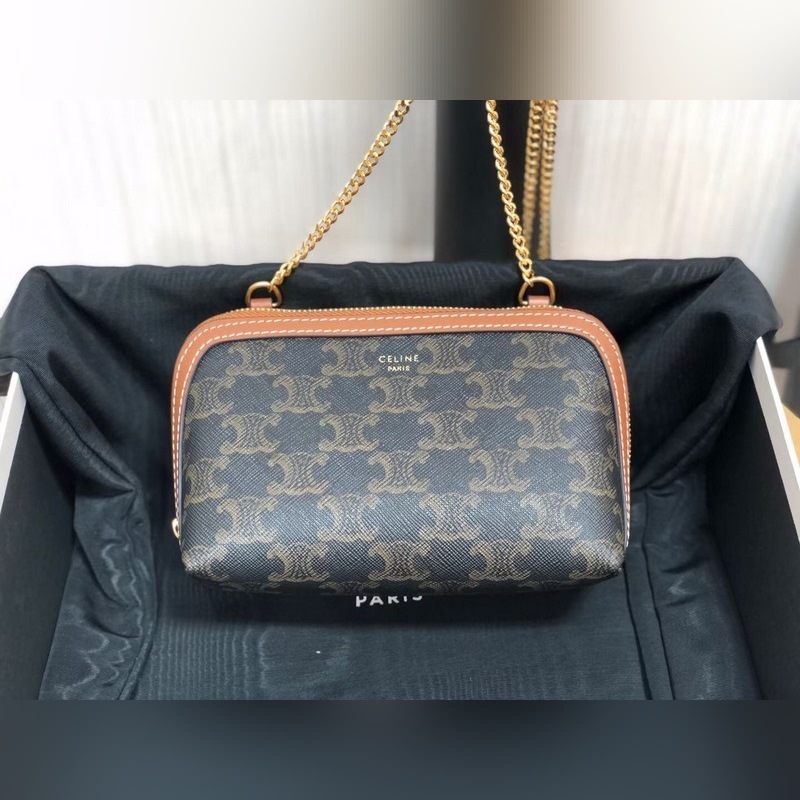 셀린느 로고 프린트 양가죽 체인 핸드백 No. 10E382CBX.01TA 코팅된 인조 가죽 양가죽으로 장식 안감 금색 금속 부속품 크로스 바디와 숄더 지퍼 잠금 1개의 메인 수납공간 체인 스트랩 길이 22인치(55cm) 크기 16 x 11cm
