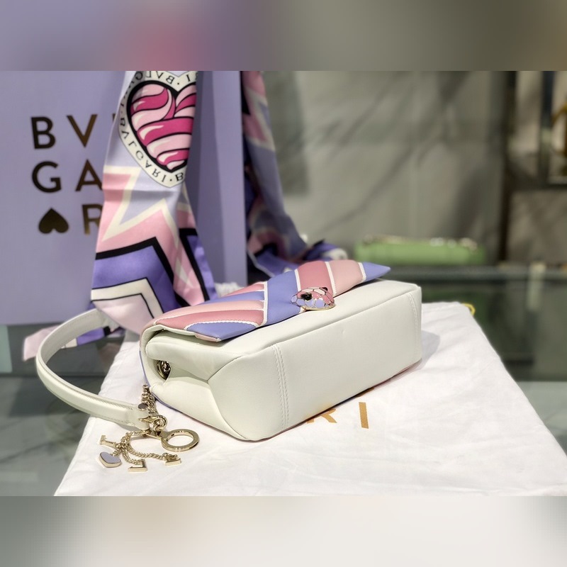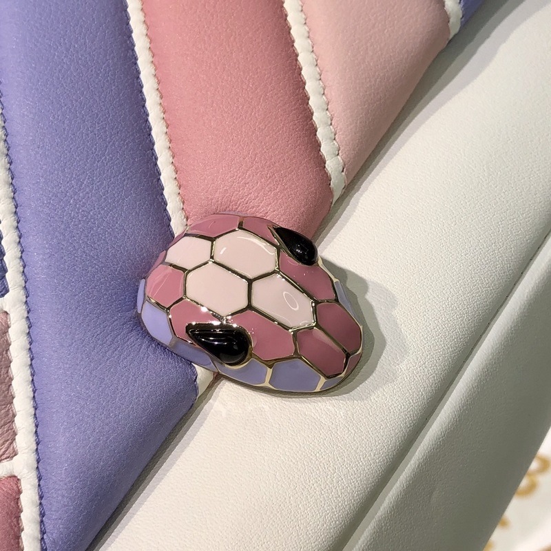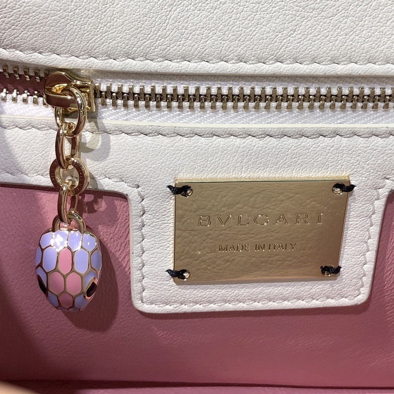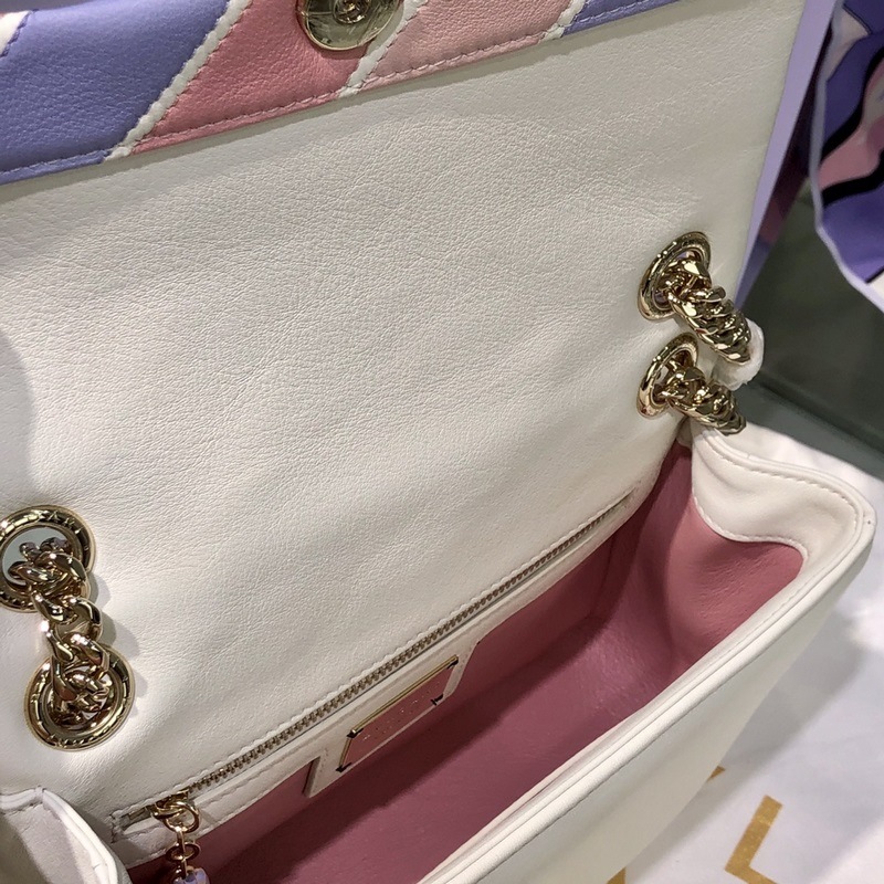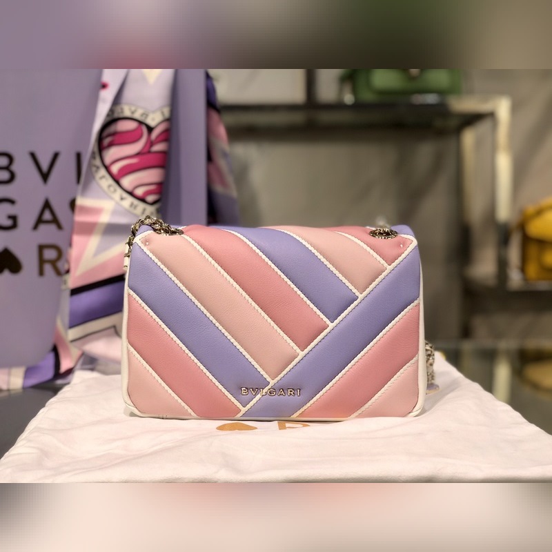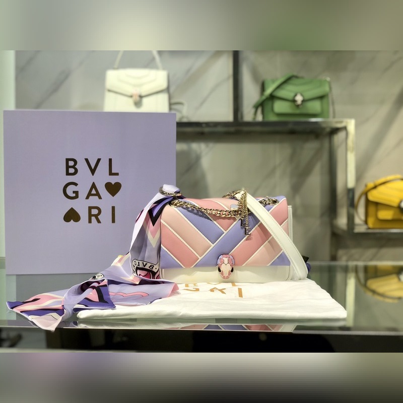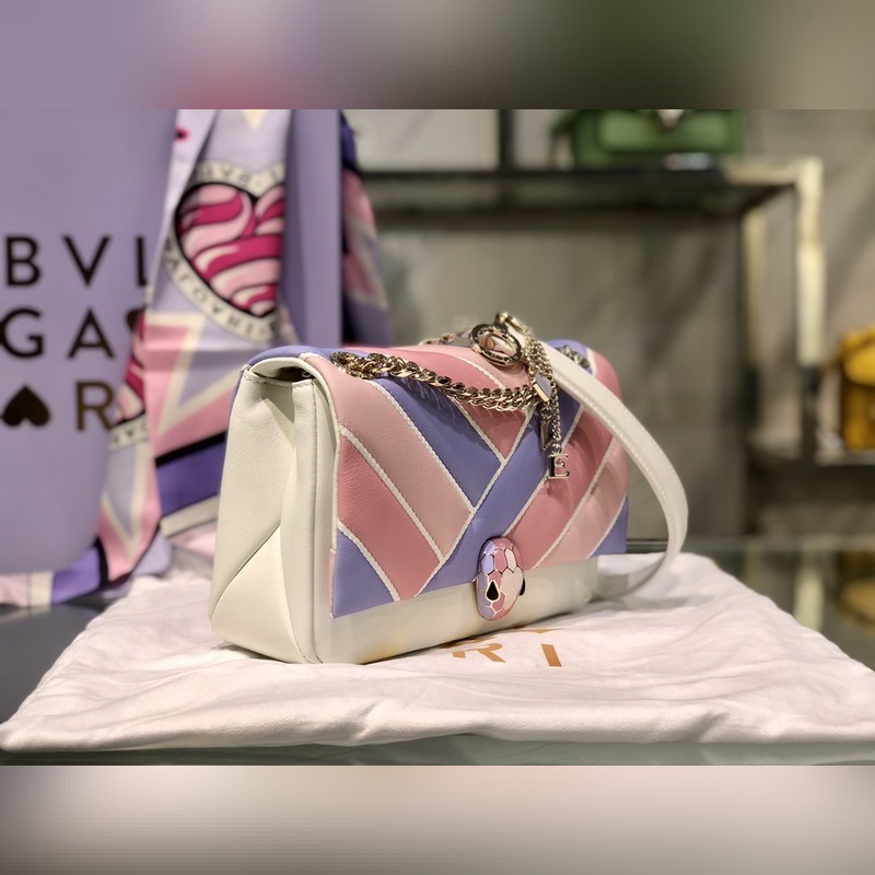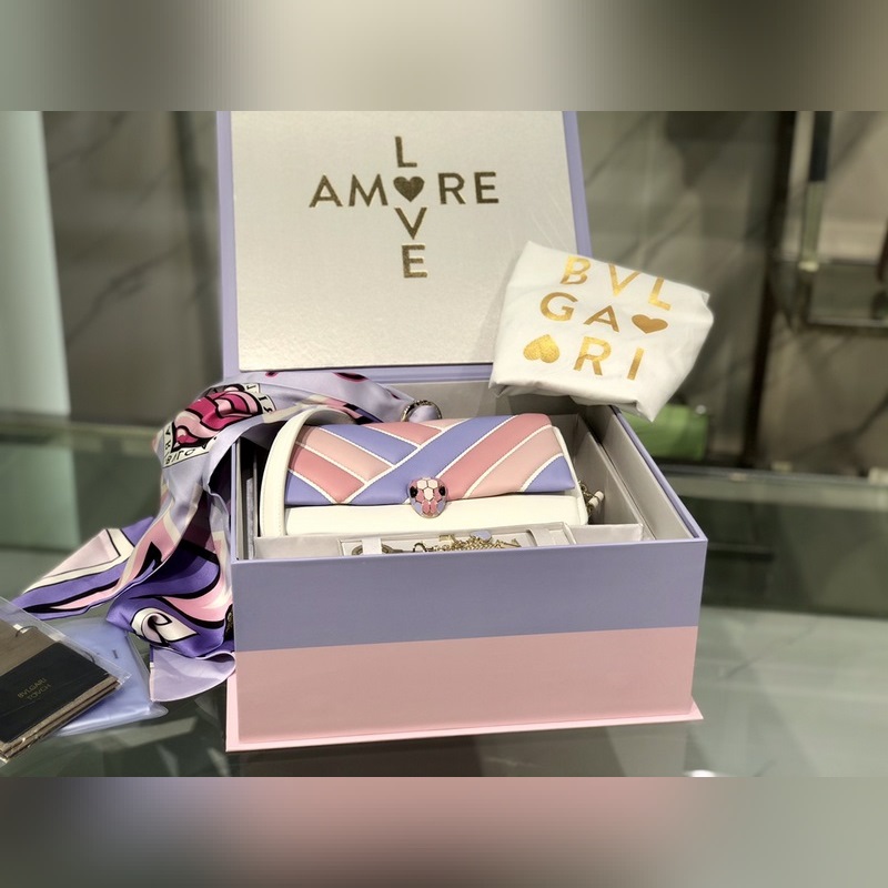 불가리 컬러풀하고 정교한 핸드백과 정교한 숄 선물 세트 모델 번호 290471 Serpenti Cabochon 컬렉션의 이 숄더백은 부드럽고 컬러풀한 송아지 가죽으로 만든 플랩과 뒷면 그리고 흰색 오닉스 송아지 가죽으로 만든 앞면과 측면이 특징입니다. 이 가방은 앞면에도 사용된 카보숑 컷 보석의 기하학적 패턴에서 영감을 받았습니다. 가방은 클래식한 라이트 골드 도금 황동 뱀 머리 버클로 닫혀 있으며 반짝이는 라벤더 플라밍고 쿼츠 프렌치 로즈 에나멜로 장식되어 있고 블랙 오닉스 눈으로 장식되어 있습니다. 두꺼운 체인과 탈부착이 가능한 편안한 가죽 어깨 스트랩이 함께 제공됩니다. LOVE 글자 참이 매력을 더해 줍니다. 작은 크기 하나의 수납공간 하나의 내부 지퍼 포켓 하나의 오픈 포켓. 내부 금속판에 BVLGARI 로고가 새겨져 있습니다. 맥시 셸리 B 숄은 라벤더색의 고급 능직 실크 소재로 만들어졌으며 전체적으로 사랑의 상징이 특징인 고전적인 패치워크 기법과 매력적인 금도금 황동 펜던트가 있습니다. 이탈리아에서 수작업으로 제작되었습니다. 14 x 185cm - 5.5 x 72.8인치 크기: 22.5 x 15 x 10cm