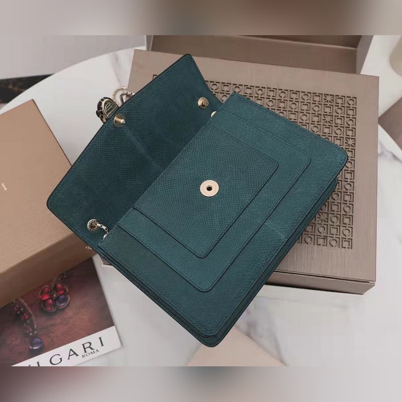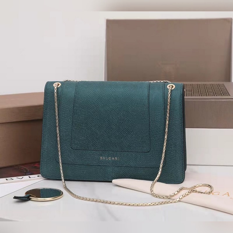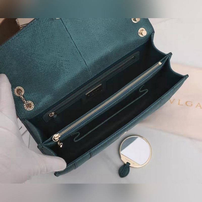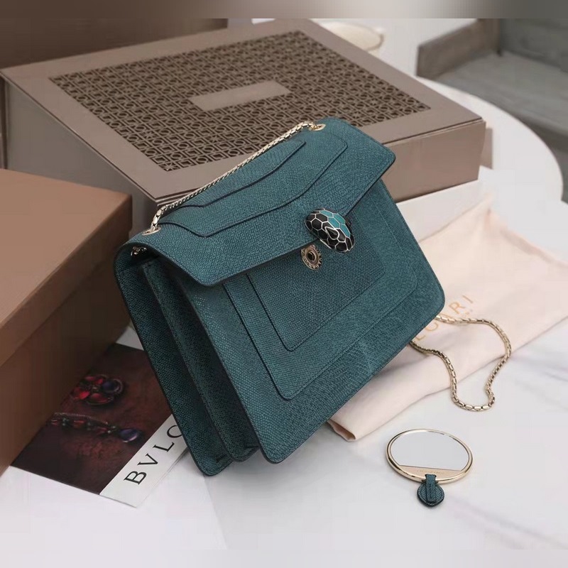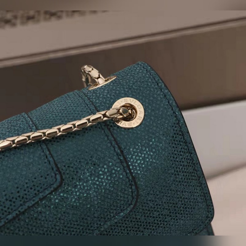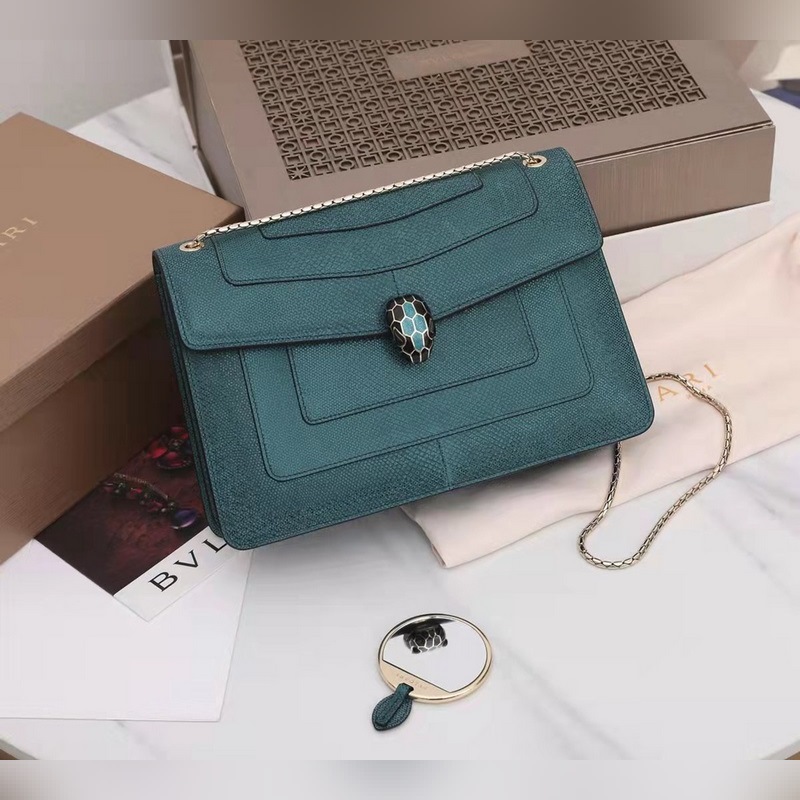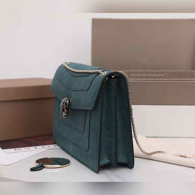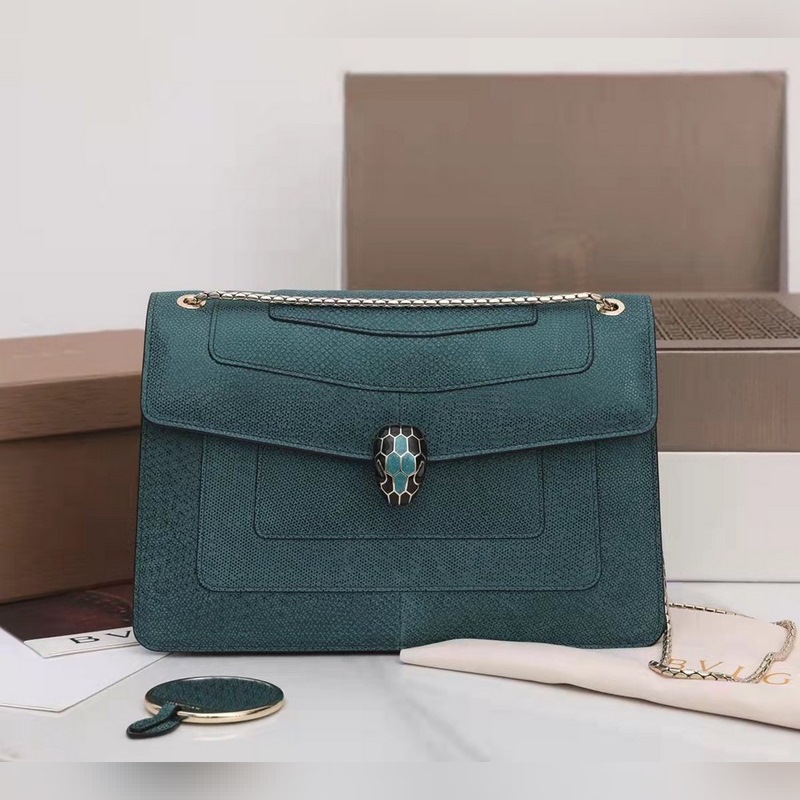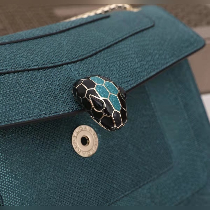 불가리 SERPENTI FOREVER 숄더백 모델: 3536291200 귀중한 금속 질감의 짙은 녹색 소가죽으로 만들어졌으며 검은색과 무지갯빛이 도는 짙은 녹색 에나멜로 장식되어 있고 검은색 오닉스 소재의 관능적인 눈과 조화를 이루는 매력적인 뱀 머리 장식은 매우 매력적입니다. 이 중간 크기의 가방은 두 개의 수납공간이 있으며 뱀의 몸을 닮은 가볍고 금도금된 슬라이딩 체인이 달려 있습니다. 이 가방에는 하나의 오픈 포켓 하나의 거울 포켓 하나의 중앙 지퍼 포켓이 있습니다. 불가리 로고가 새겨진 금속 명판과 개인화할 수 있는 컴팩트한 메이크업 거울이 함께 제공됩니다. 크기: 27.5 x 18 x 7cm