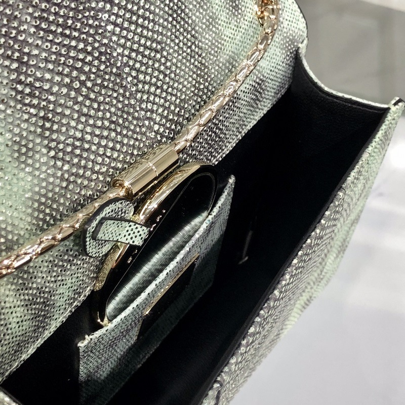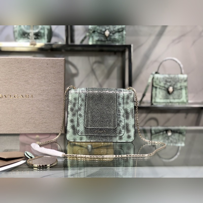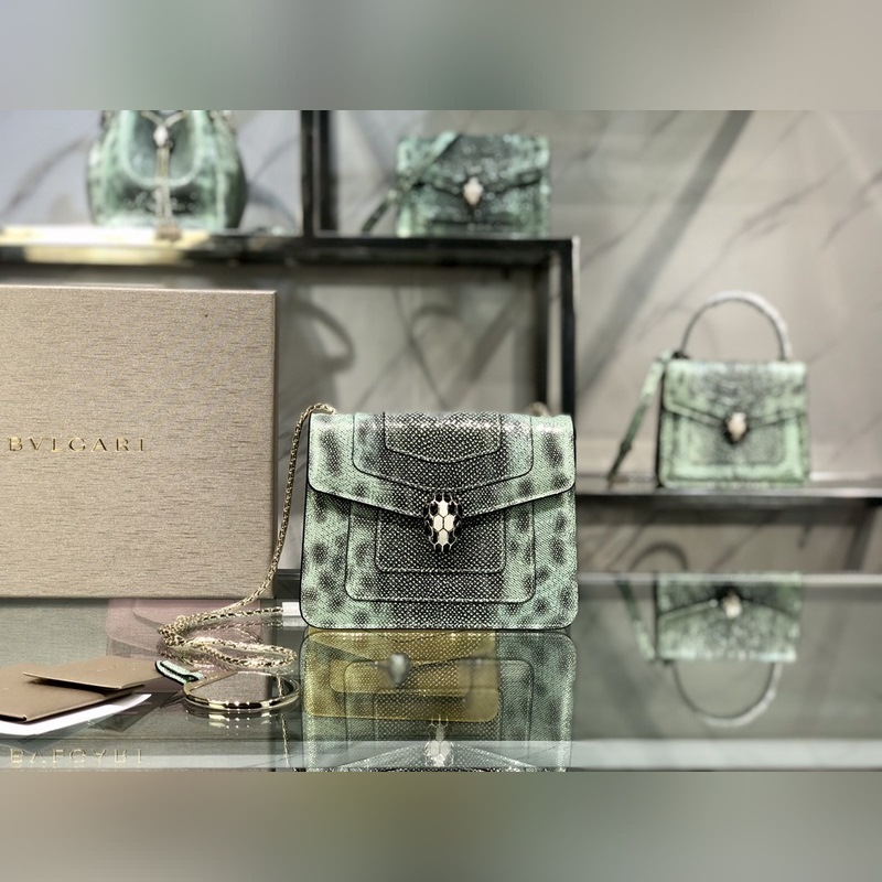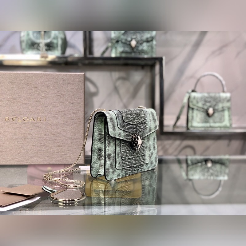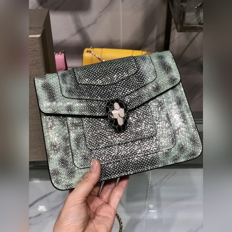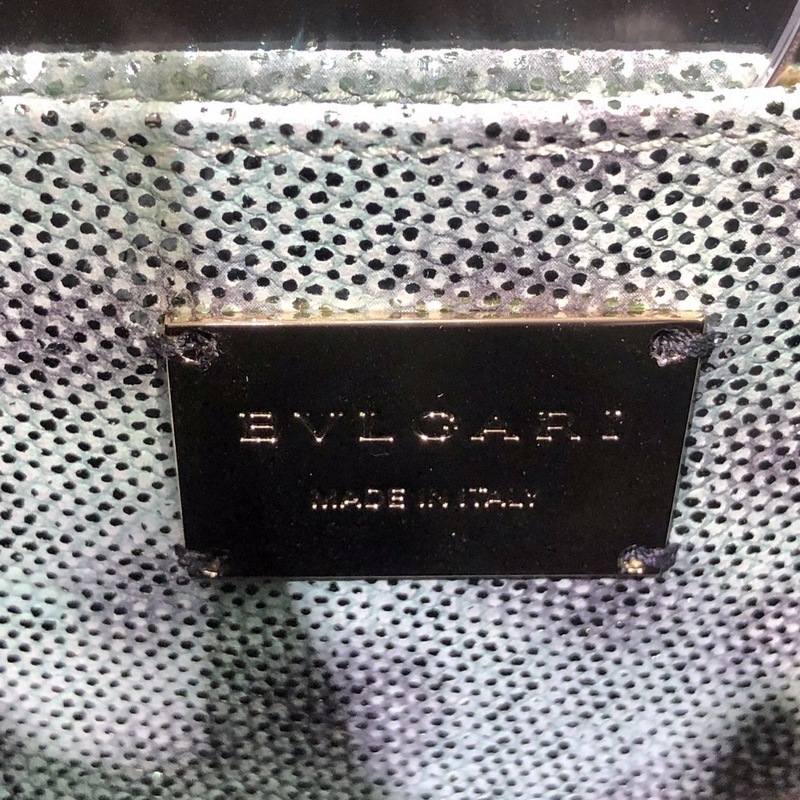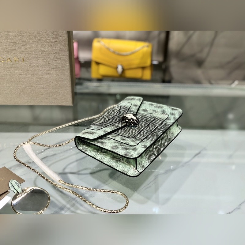 불가리 세르펜티 포에버 크로스바디 백 체인 백 모델 번호: 35107 이 가방은 귀중한 민트색 금속 소가죽에 뱀 무늬가 새겨져 있으며 불가리 장인의 고전적인 작품 제작에 대한 전문성을 보여줍니다. 검은색과 흰색 오닉스 에나멜이 검은색 오닉스 감각적인 눈과 조화를 이루어 뱀 머리 장식을 더욱 돋보이게 합니다. 유연한 라인의 밝은 금도금 황동 뱀 체인은 하나의 수납 공간이 있으며 작은 화장 거울과 조화를 이룹니다. 내부 금속판에는 BVLGARI 로고가 새겨져 있습니다. 크기: 20 x 15 x 5cm