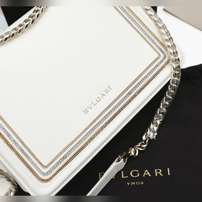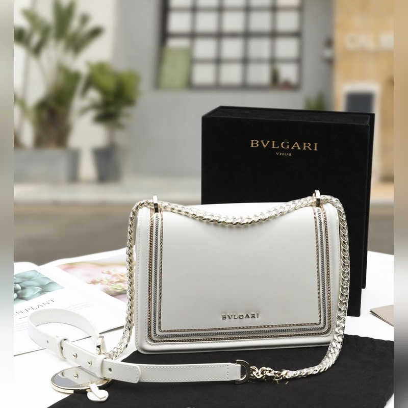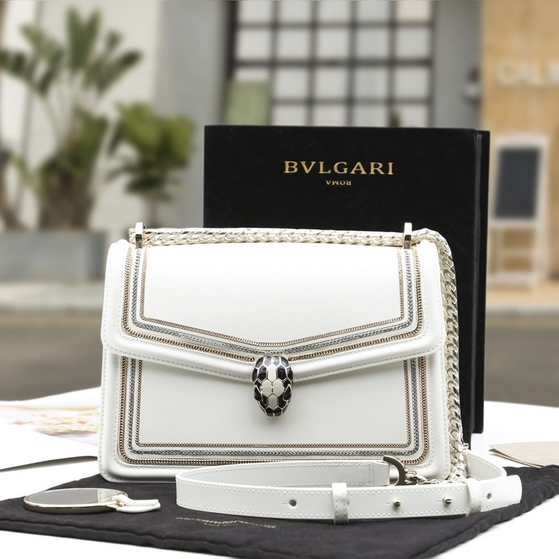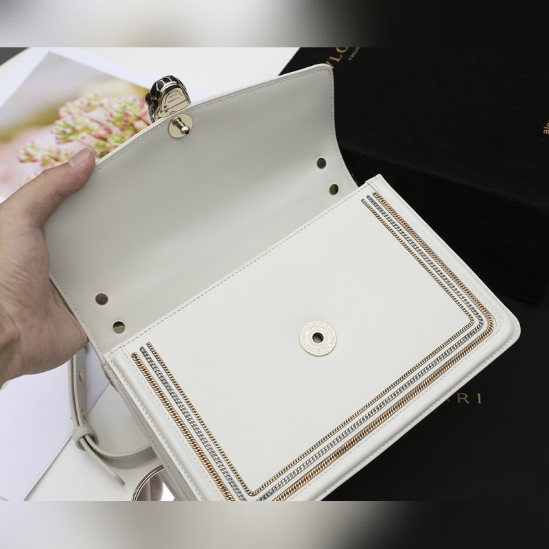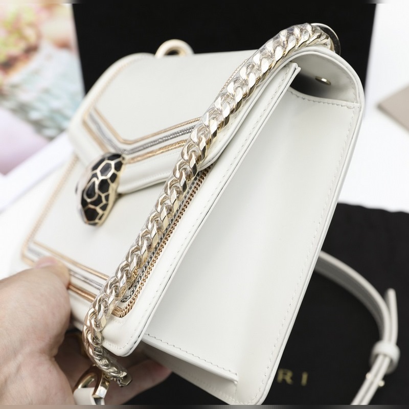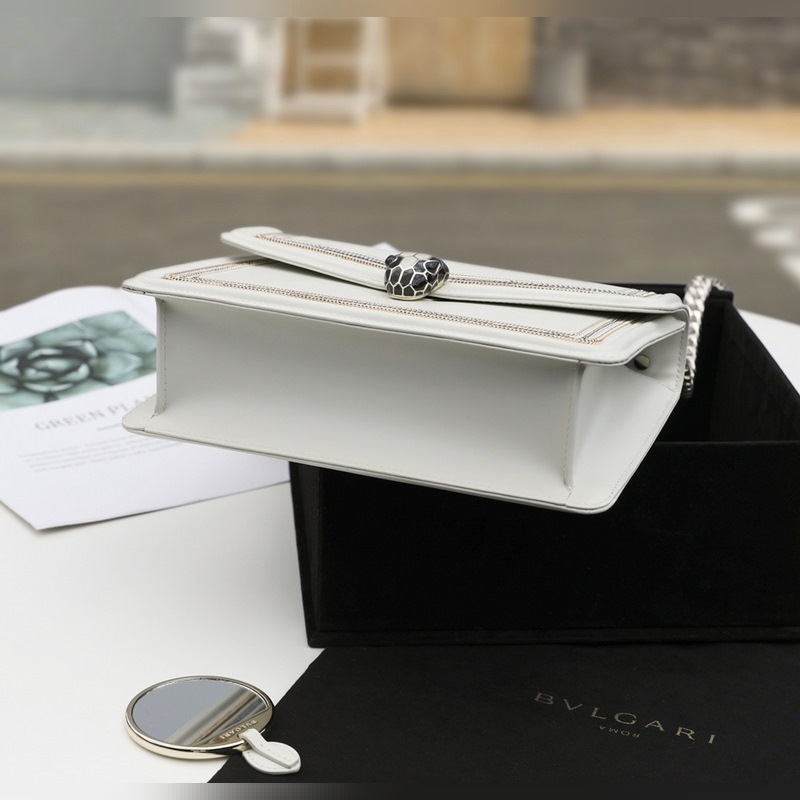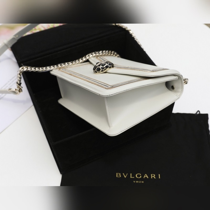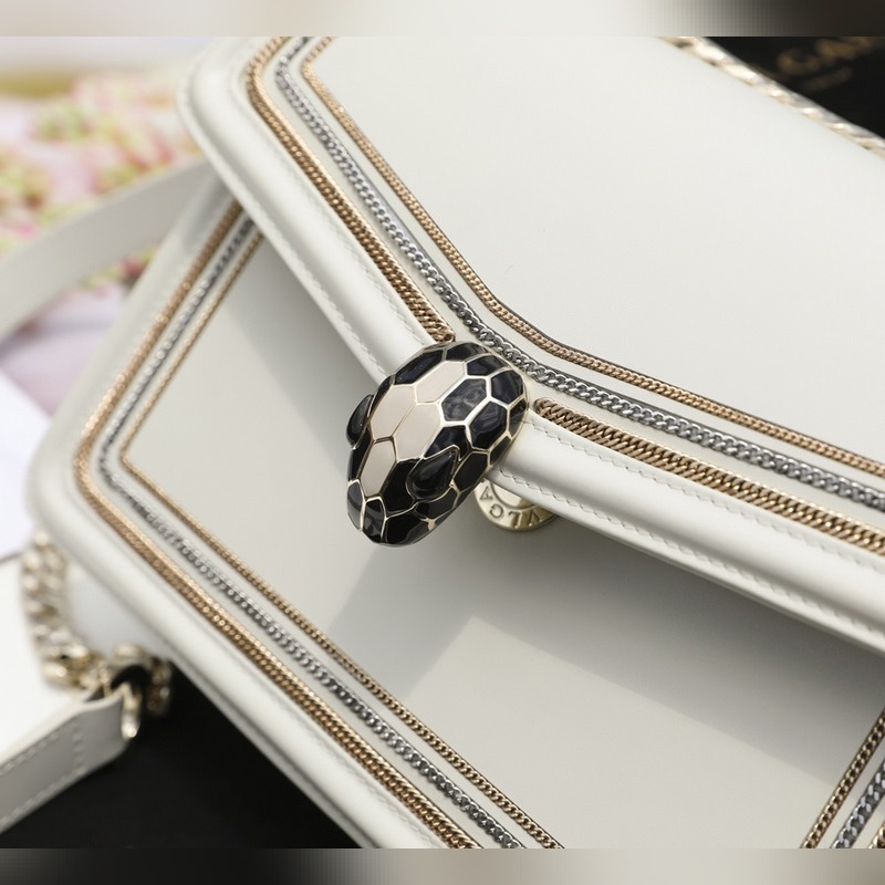 불가리 세르펜티 다이아몬드 블래스트 체인백 모델: 28865691200 송아지 가죽 소재에 체인 장식 세 개가 달려 있습니다. 클래식한 뱀 머리 모양의 가벼운 금도금 황동 버클은 흑백 에나멜로 장식되어 있으며 검은색 오닉스 눈이 달려 있습니다. 크기: 24*16*7cm