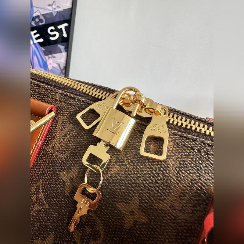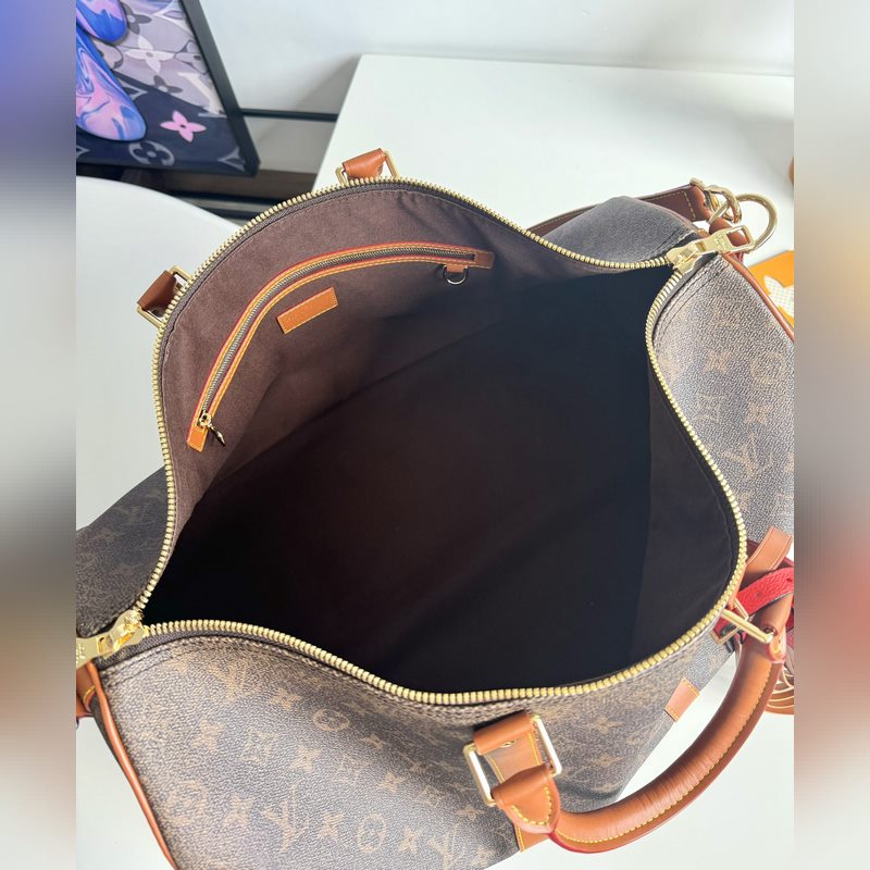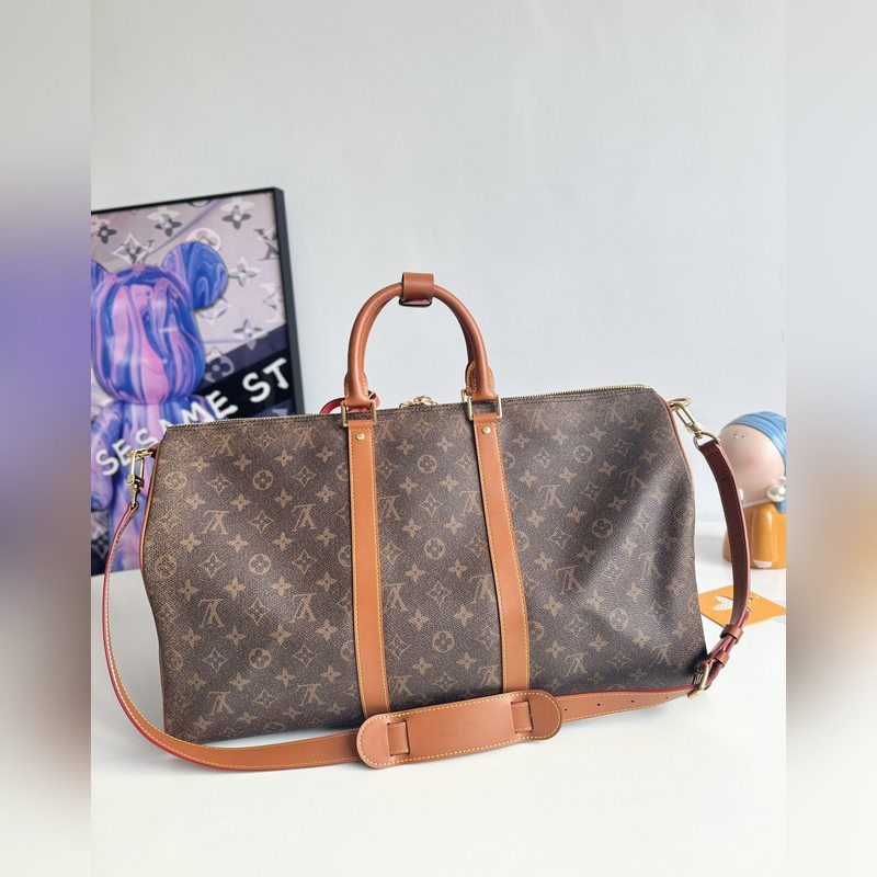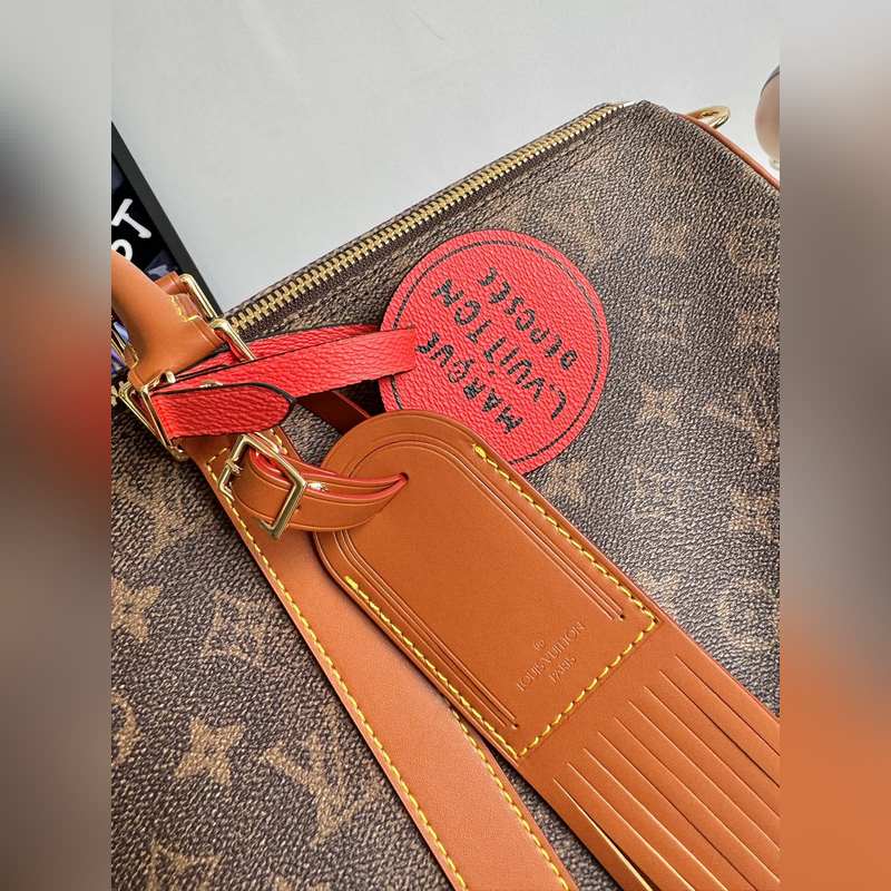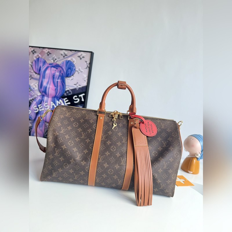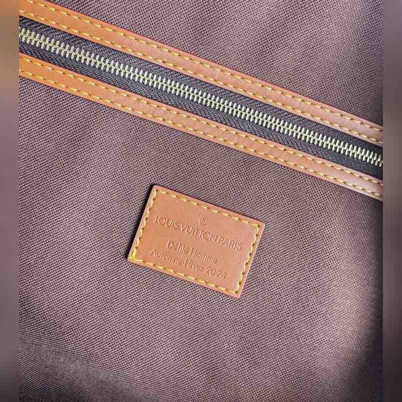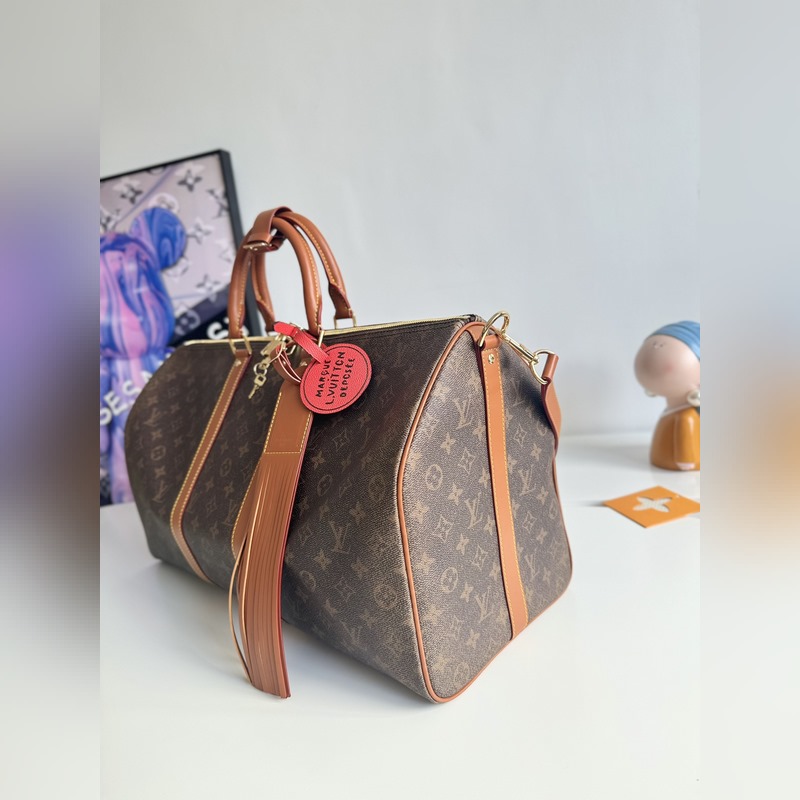 해외 오리지널 싱글 M11541 한정판 리얼 샷! 이 키 올 밴둘리에 50 여행 가방은 2025년 가을/겨울 패션쇼에서 선보인 제품입니다. 모노그램 더스트 코팅 캔버스에 디스트레스드 카우하이드 가죽과 금속 부품을 사용하여 하렐 윌리엄스가 브랜드의 역사에 바치는 헌사를 보여줍니다. 마르크 L. 비통 데 오세 데코레이션과 태슬이 달린 가죽 이름표가 정교한 디테일을 완성합니다. 크기: 50×29×23cm