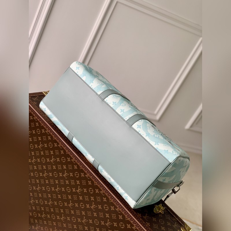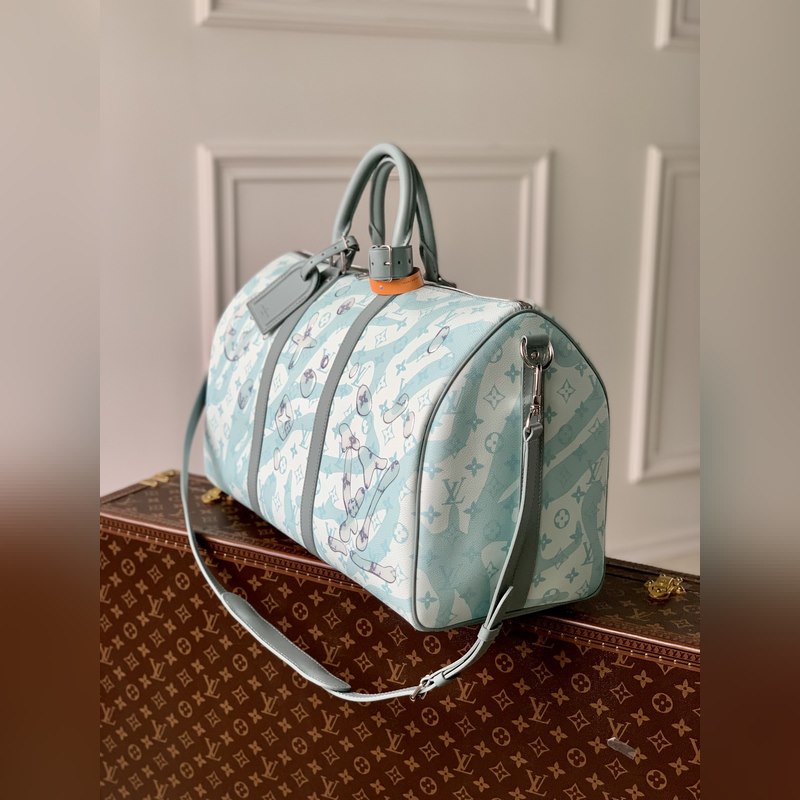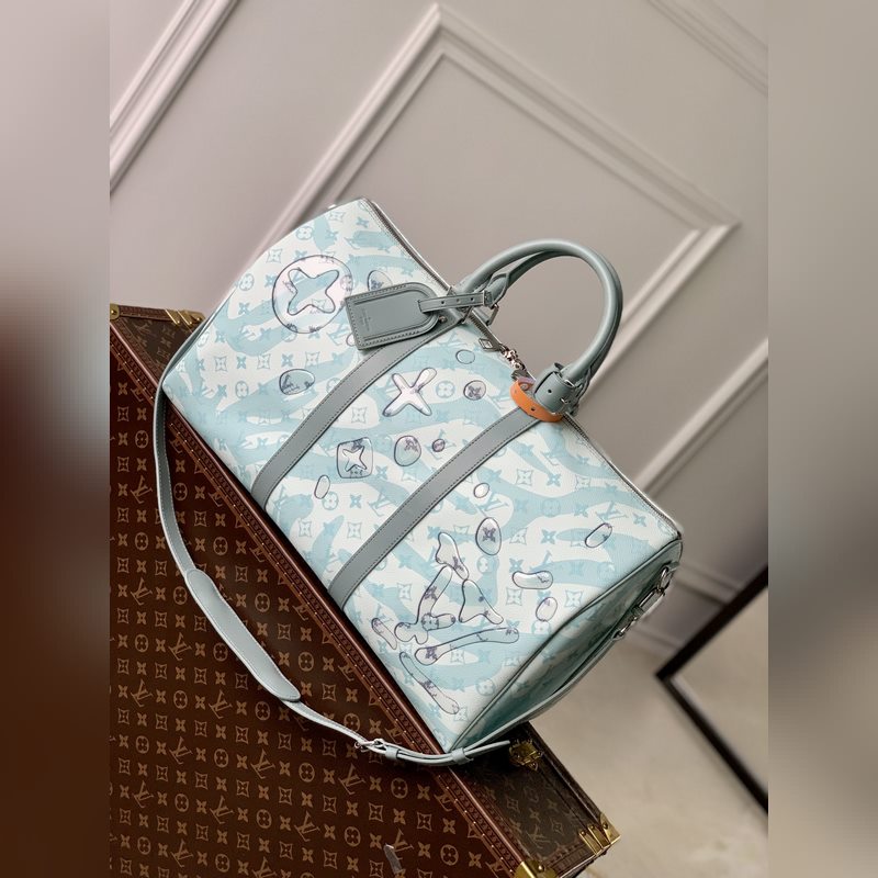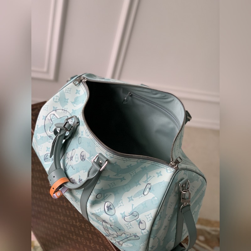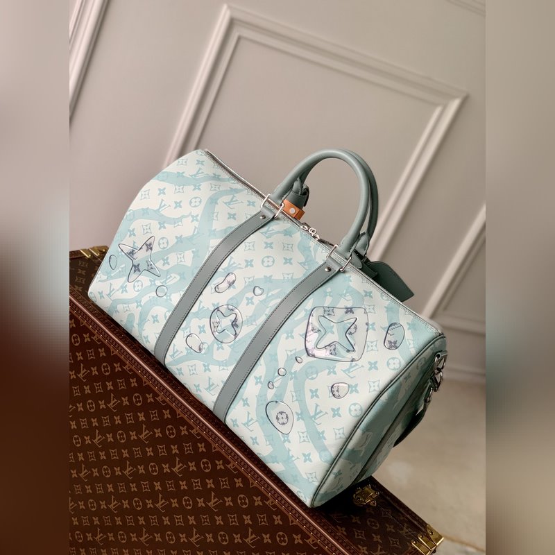 LV M22570 이 Kee all Bandouli?re 50 여행 가방은 모노그램 아쿠아가든 캔버스로 만들어져 모노그램 꽃과 LV 글자가 맑고 투명한 모노그램 패턴의 수면 위에 떠 있는 듯한 입체적인 물방울 모양을 띱니다. 가죽 소재의 측면 스트랩 상단 손잡이 이름표는 클래식한 요소를 이어갑니다. 50.0 x 29.0 x 23.0cm(길이 x 높이 x 너비)