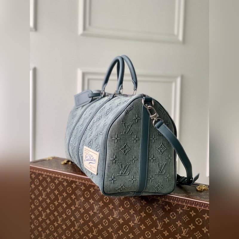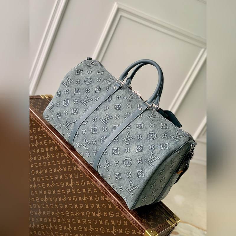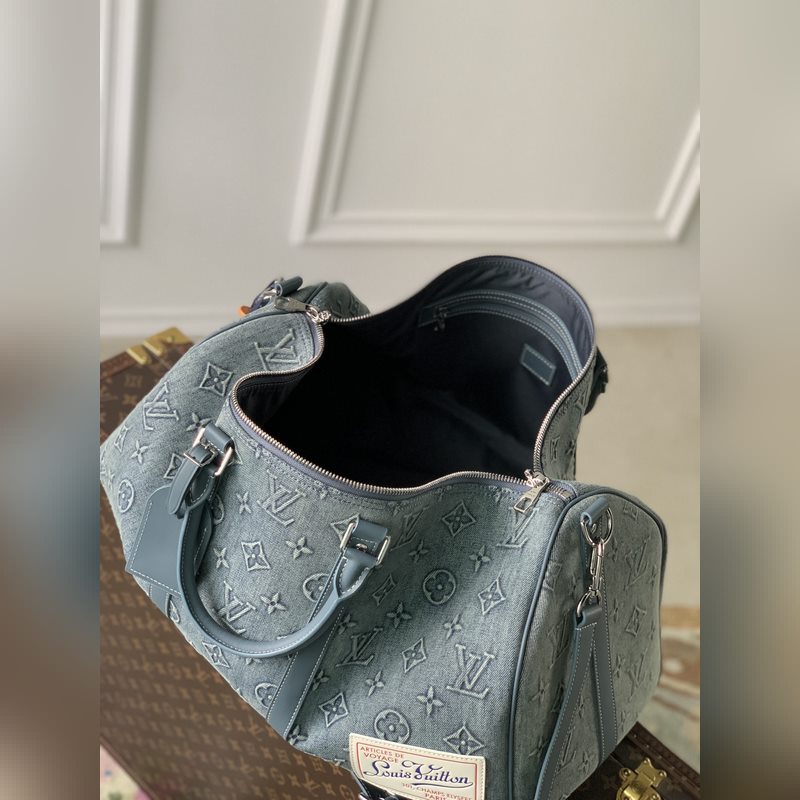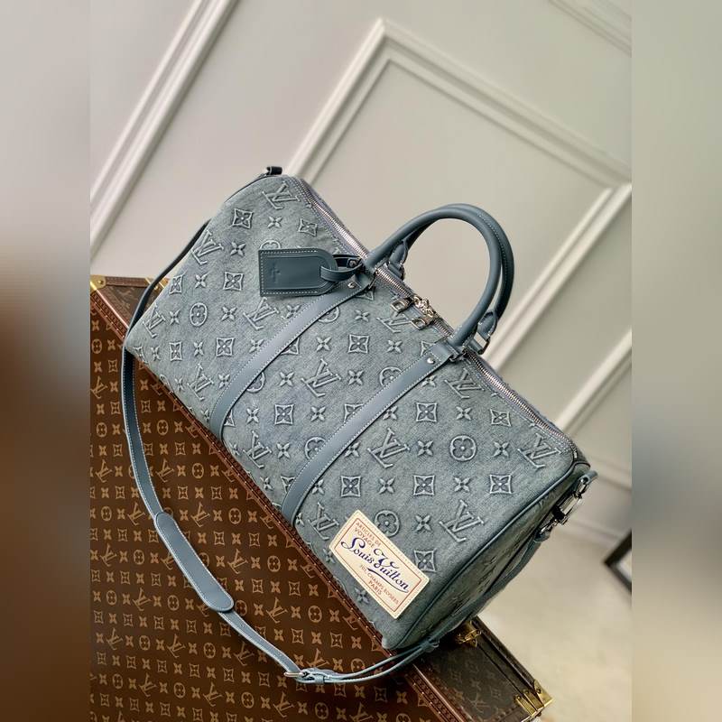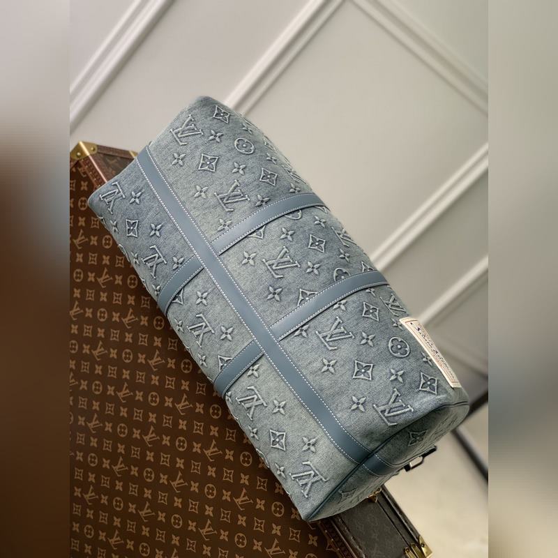 LV M22532 이 Kee all Bandouli?re 50 여행 가방은 루이 비통의 클래식한 디자인 중 하나를 재현한 모노그램 프린트의 페이드 데님 소재로 만들어졌습니다. 강화된 측면 스트랩과 상단 손잡이는 소가죽으로 만들어졌으며 기내 반입 수하물 크기로도 충분한 공간을 갖추고 있어 짧은 주말 여행에 적합합니다. 50.0 x 29.0 x 23.0cm(길이 x 높이 x 너비)