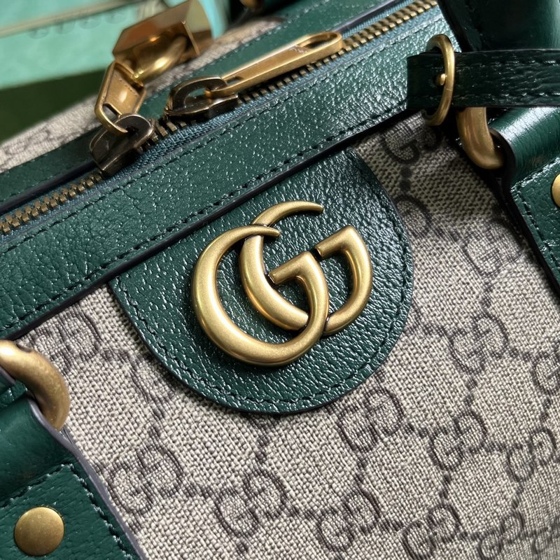 미니 GG 캔버스 여행 가방과 오리지널 그린 선물 가방 세트. 구찌 여행