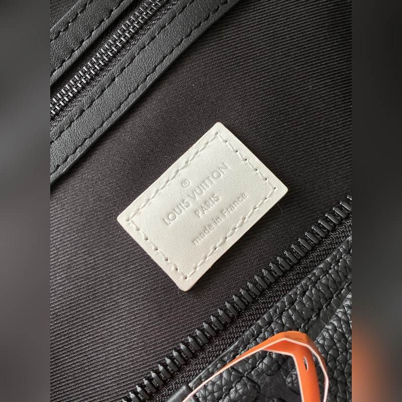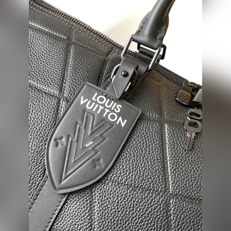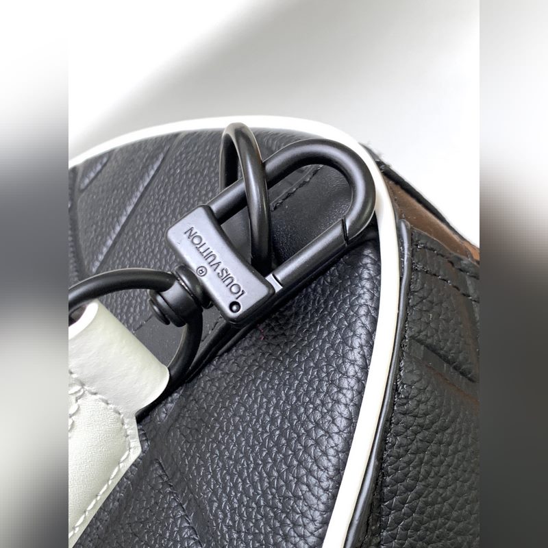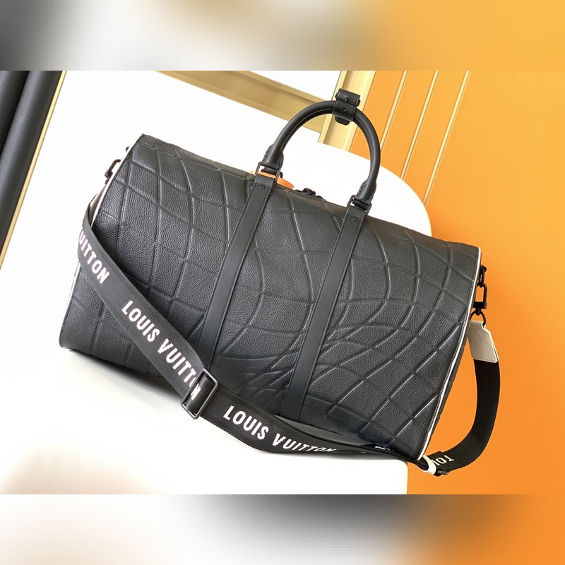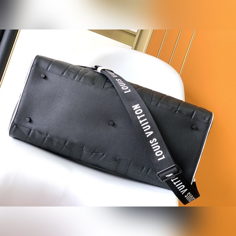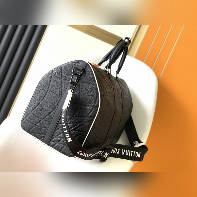최고의 오리지널 M21382 블랙 풀 레더 여행 가방 시리즈 Keeall Band oul i?re 50 주말 가방은 타우리 롱 송아지 가죽으로 만들어졌으며 골대 안으로 들어가는 골을 연상시키는 패턴이 특징입니다. 이 가방에는 흑백의 직물 스트랩과 축구팀 문장을 연상시키는 가죽 라벨이 달려 있습니다. 가방 바닥에는 어울리는 시그니처가 있습니다. 크기: 50 x 29 x 23cm