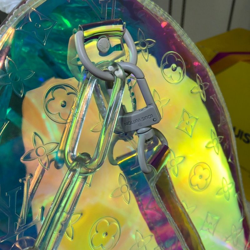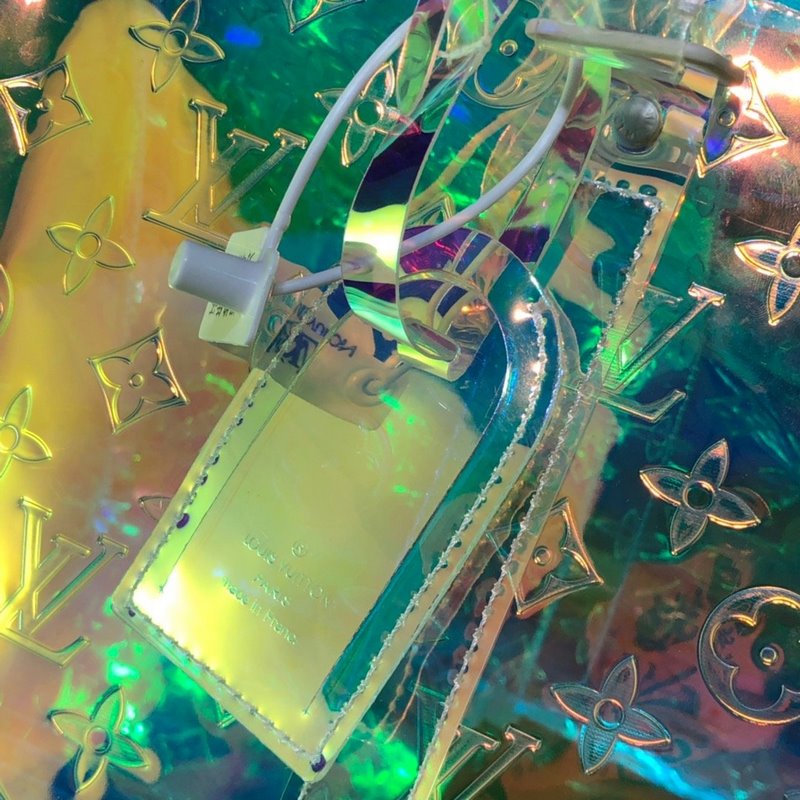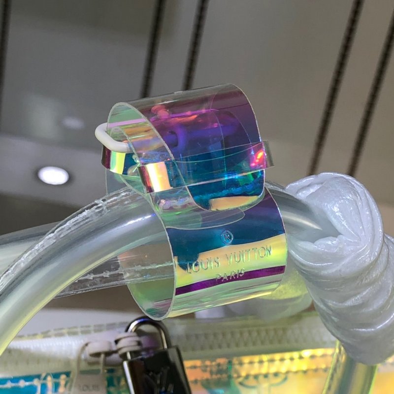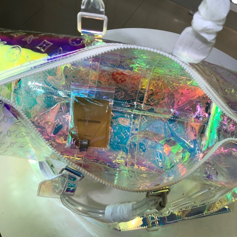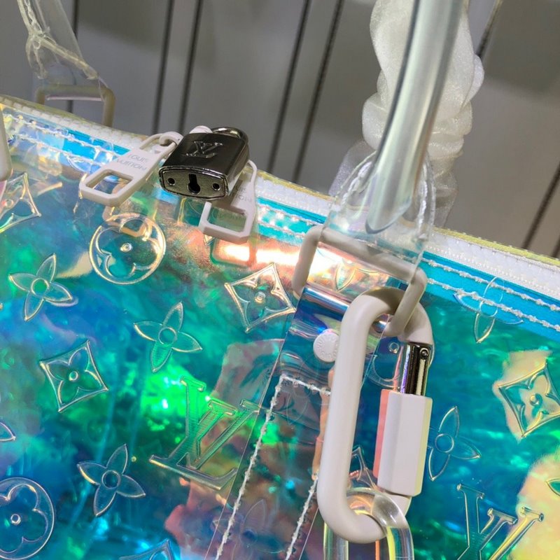 LV 모델 번호: M53271 KEEPALL 50 컬러풀 여행 가방(어깨끈 포함) 이 화려한 Keepall 50 여행 가방은 루이 비통 남성복의 아트 디렉터인 버질 아블로의 비전적인 접근 방식을 보여줍니다. 즉 젊은 개인의 에너지와 루이 비통의 클래식하고 우아한 이미지가 충돌하고 얽혀 있는 것입니다. 모노그램 프린트 PVC로 제작된 이 가방은 크기가 크고 대담한 무지개색으로 시선을 사로잡습니다. 탈착식 어깨끈과 상단 손잡이로 다양한 운반 옵션을 제공합니다. 50.0 x 29.0 x 23.0 cm (L x H x W) 무지갯빛 프리즘 투명 모노그램 프린트 PVC 트림 흰색 하드웨어 상단 손잡이 손으로 들거나 팔에 걸 수 있는 크기 가죽 손잡이(고정형 슬리브 포함) 더블 지퍼 잠금 가죽으로 덮인 자물쇠 장식 어깨에 걸거나 대각선으로 메기 위해 제거할 수 있는 가죽 어깨끈이 달린 레진 체인 항목 번호: 96181050 GS9618800