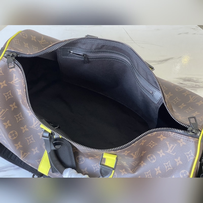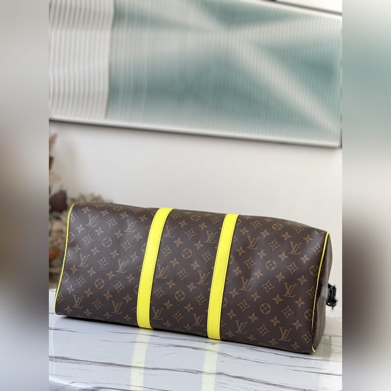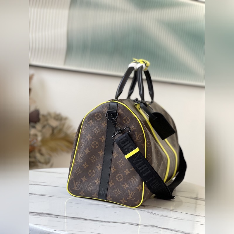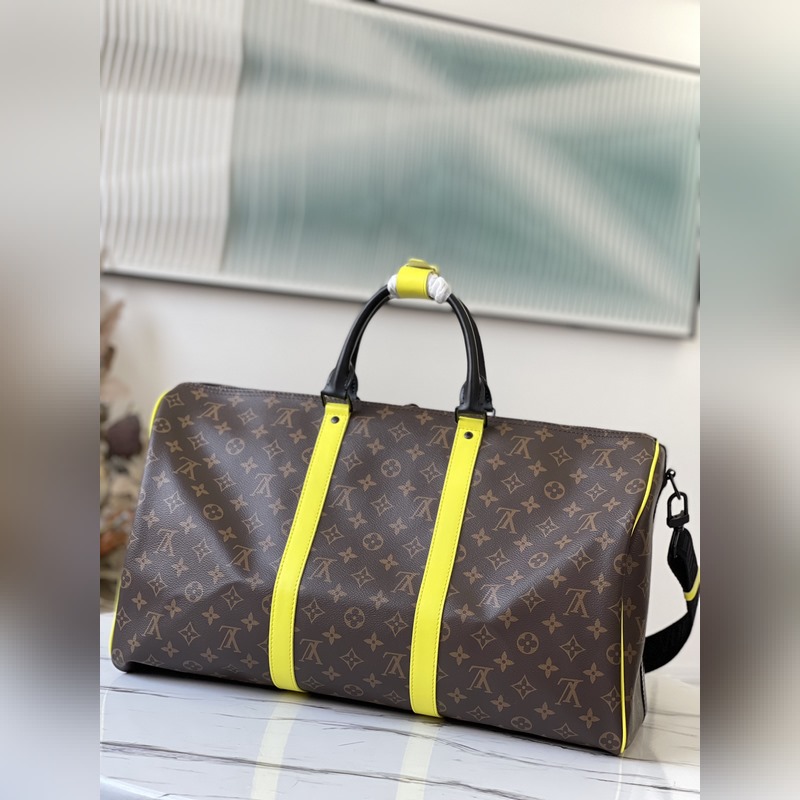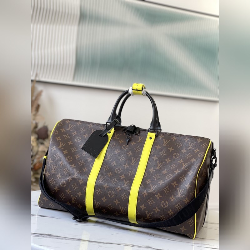 LV 아이템 번호: M45866 클래식 킵올 50 여행 가방 모노그램 마카사르 캔버스로 제작되었으며 가죽 소재의 측면 스트랩과 상단 핸들 잠금장치에 밝은 형광 노란색 액센트가 있습니다. 탈부착이 가능하고 길이 조절이 가능한 어깨 스트랩과 롤링 가죽 상단 핸들로 편안하게 휴대할 수 있습니다. 짧은 여행에 적합합니다. 크기: 50 x 29 x 23cm 아이템 번호: SG96181350