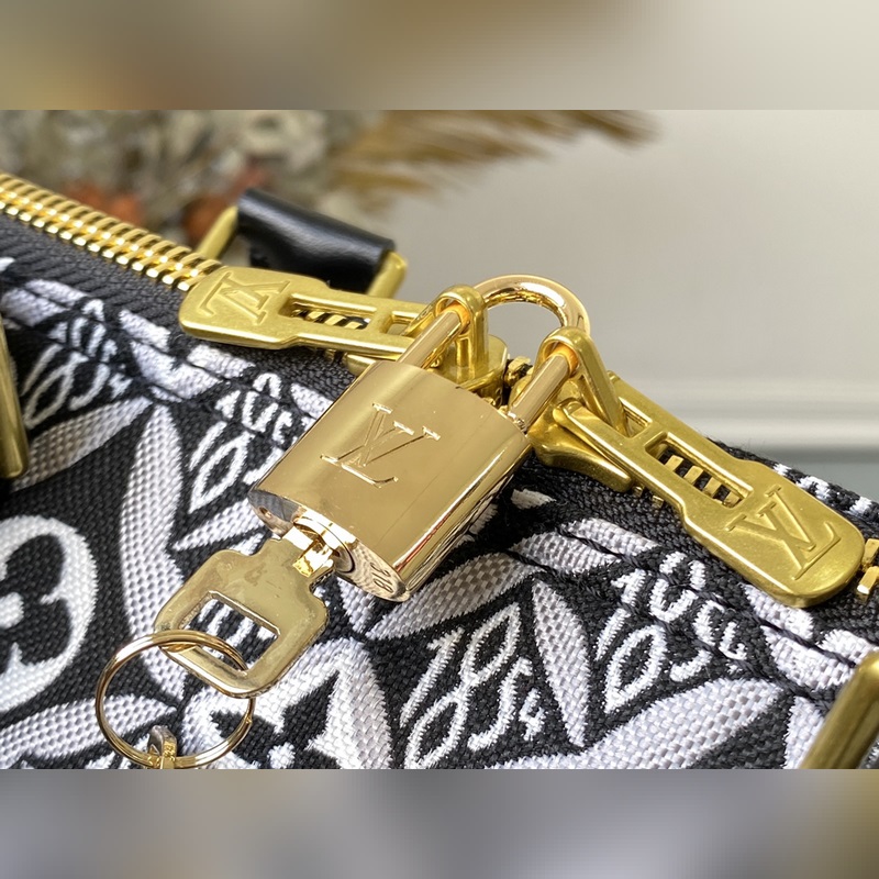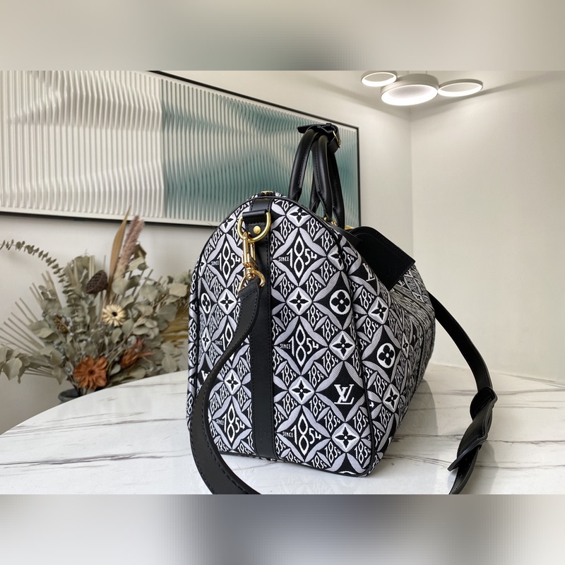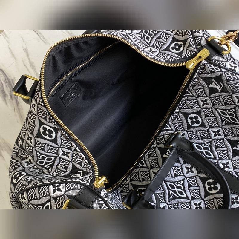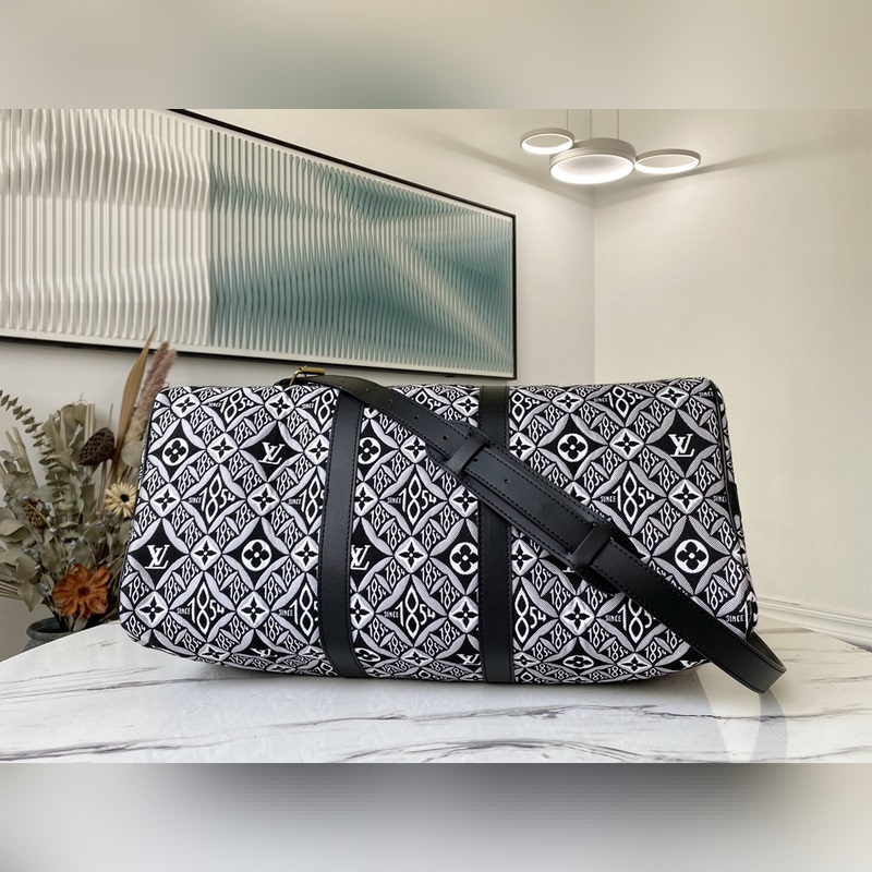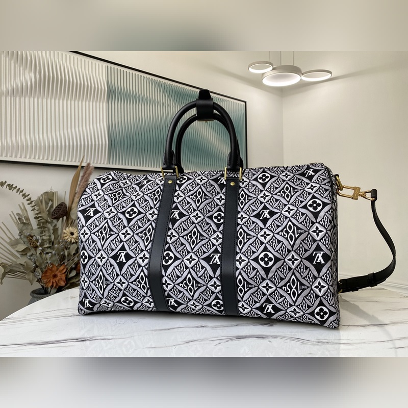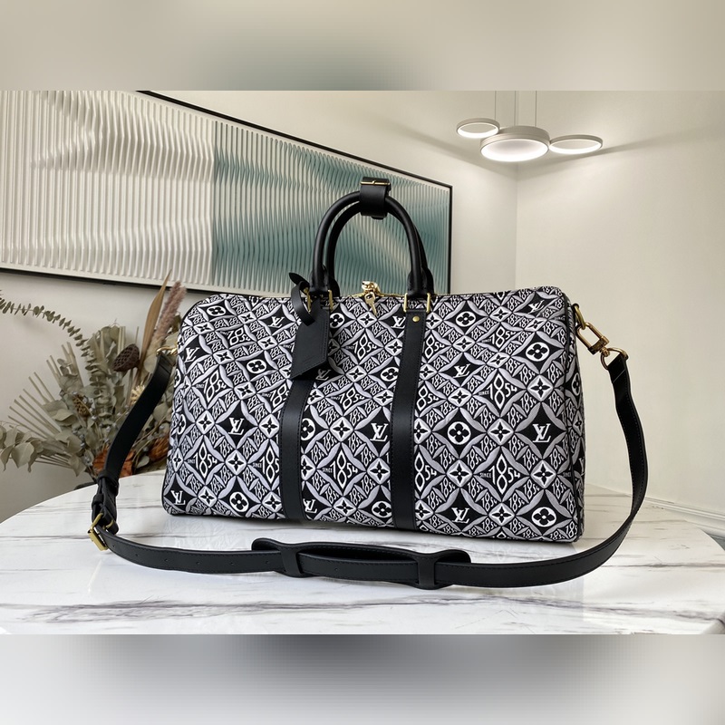 LV 아이템 번호: M57304 Keepall Bandouli?re 45 여행 가방 1854년 자카드 직물로 제작된 이 제품은 니콜라 제스키에르가 2020년 가을/겨울 컬렉션에서 주도한 복고풍 트렌드를 반영하여 클래식한 모노그램 플라워 패턴과 브랜드 창립 연도를 나타내는 숫자 1854를 결합했습니다. 크기: 45 x 27 x 20cm 아이템 번호: SG96181350