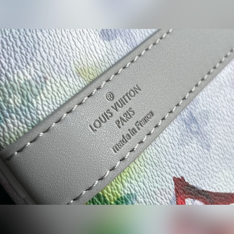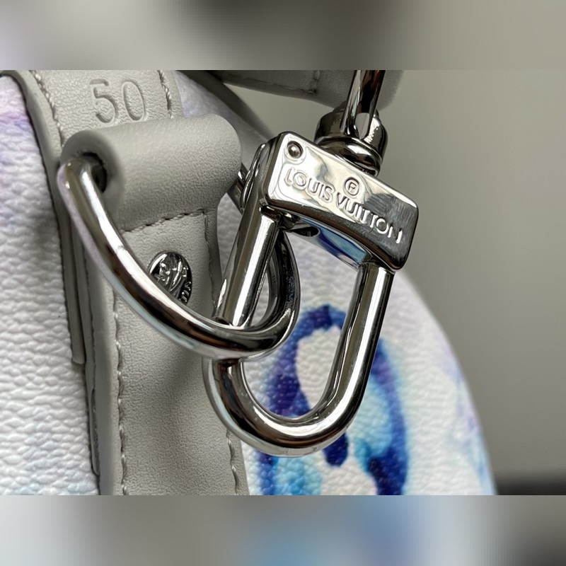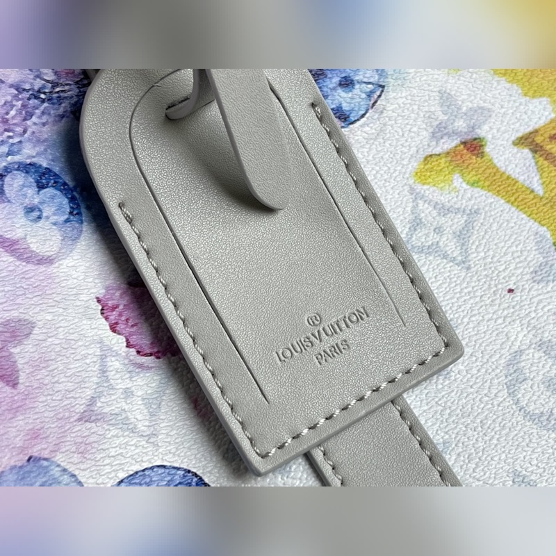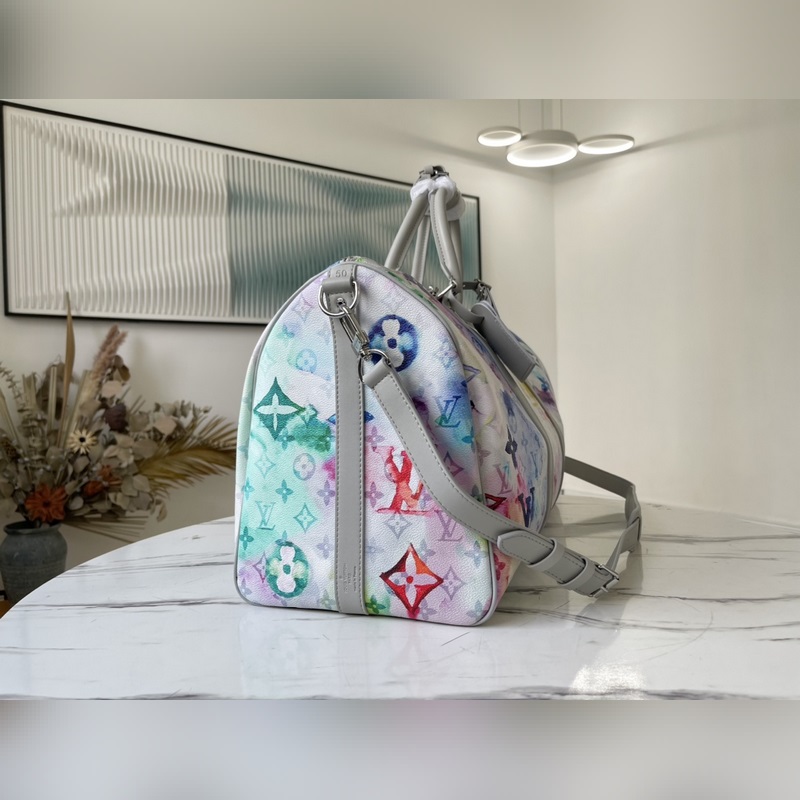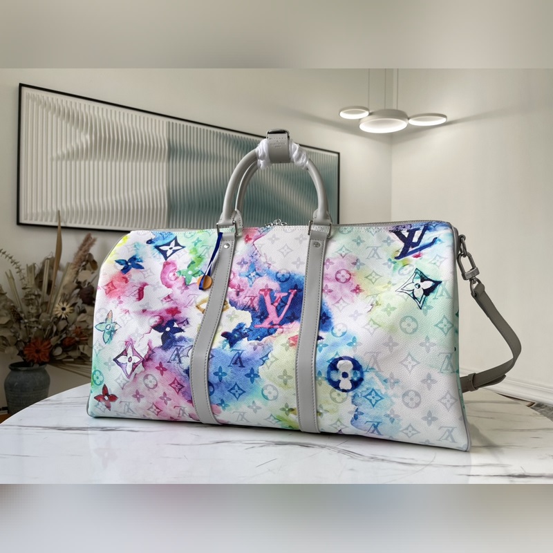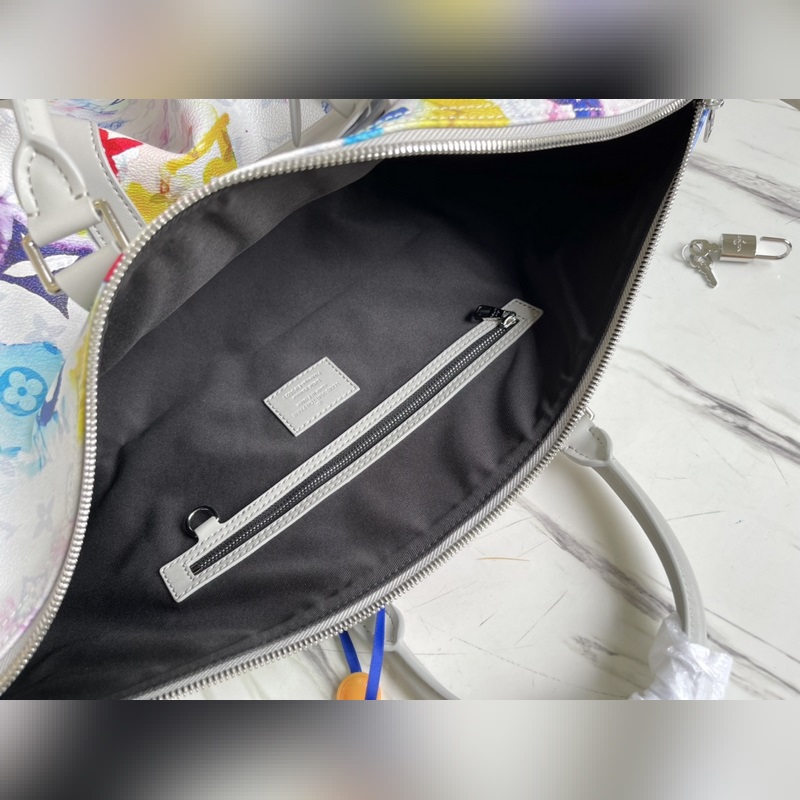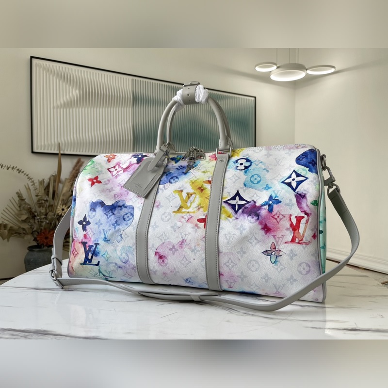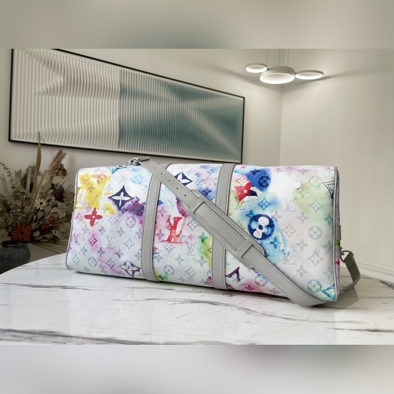LV 아이템 번호: M45758 KEEPALL BANDOULI?RE 50 여행 가방 잉크 이 Keepall 50 BANDOULI?RE 소프트 트래블 백은 코팅된 캔버스 표면에 밝은 수채화 물감으로 모노그램 패턴을 적용하여 버질 아블로가 만들어낸 무지개 같은 판타지를 연상시킵니다. 기내 반입 수하물을 위한 충분한 숨겨진 공간이 있어 주말 여행에 이상적인 동반자입니다. 크기: 50 x 29 x 23cm 항목 번호: SG96181250 96181100 9618 (흰색 가죽)