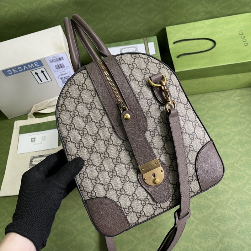 원래의 녹색 상자 포장이 함께 제공됩니다. 이 여행 가방은 최신 시즌의 브랜드의 새로운 이중 G 패턴이 캔버스에 엮여 있는 스타일리시한 볼링 가방 모양입니다. 클래식한 스트라이프 웨빙 디테일은 전체 디자인의 복고풍 스타일을 한층 더 강조합니다. 어깨 끈과 손잡이 디자인은 다양한 운반 옵션을 제공합니다. 브랜드의 모든 아이템은 실용적인 디자인과 다양한 방식으로 사용할 수 있는 스타일을 특징으로 하며 브랜드의 포괄적이고 다양한 개성을 강조합니다. 모델 번호: 645021. 크기: 45cm. 색상: 브라운/PVC. 아이템 번호: XP96181380