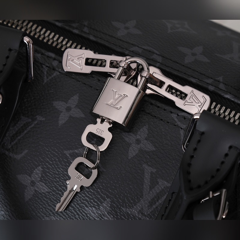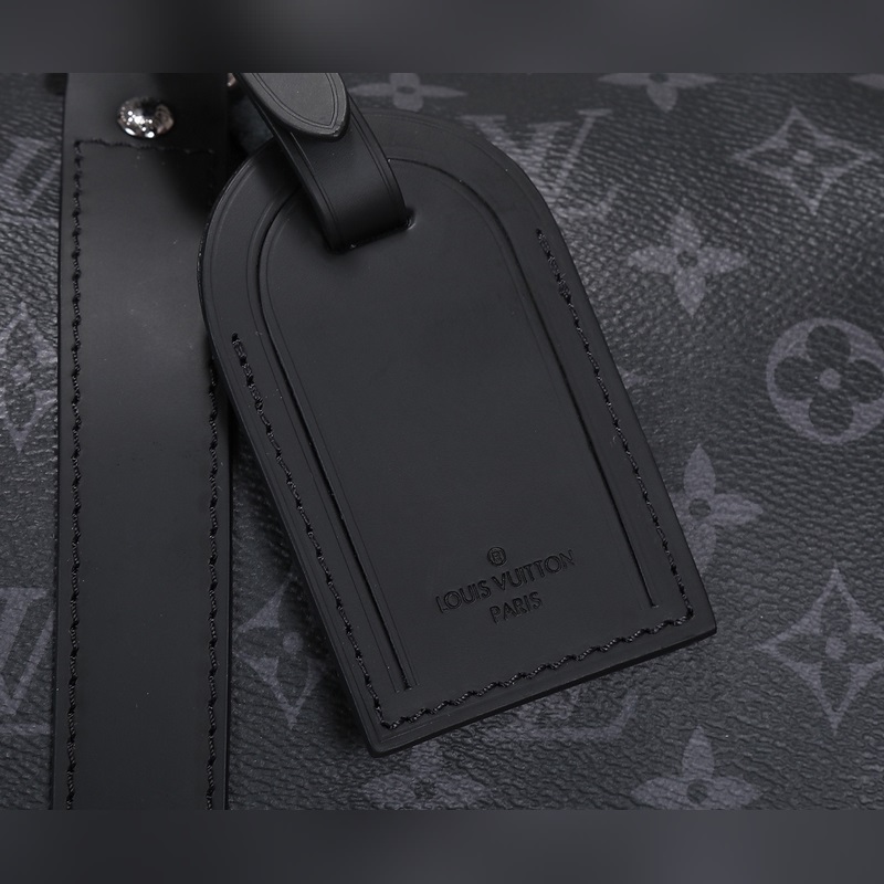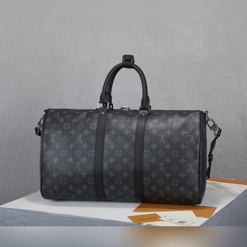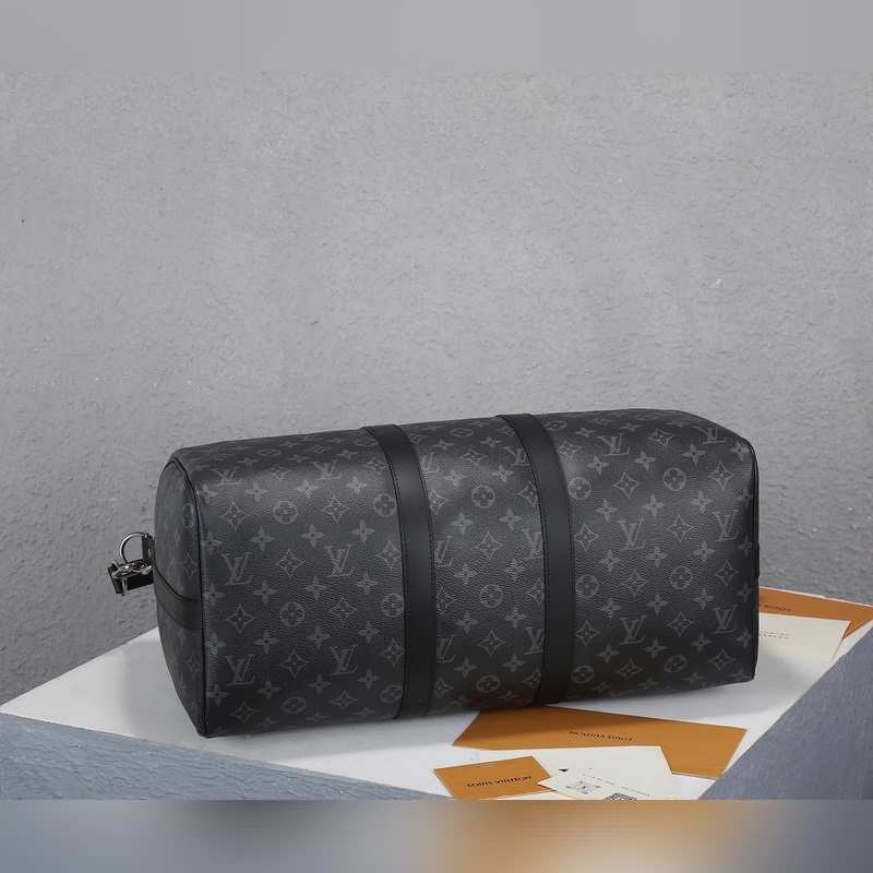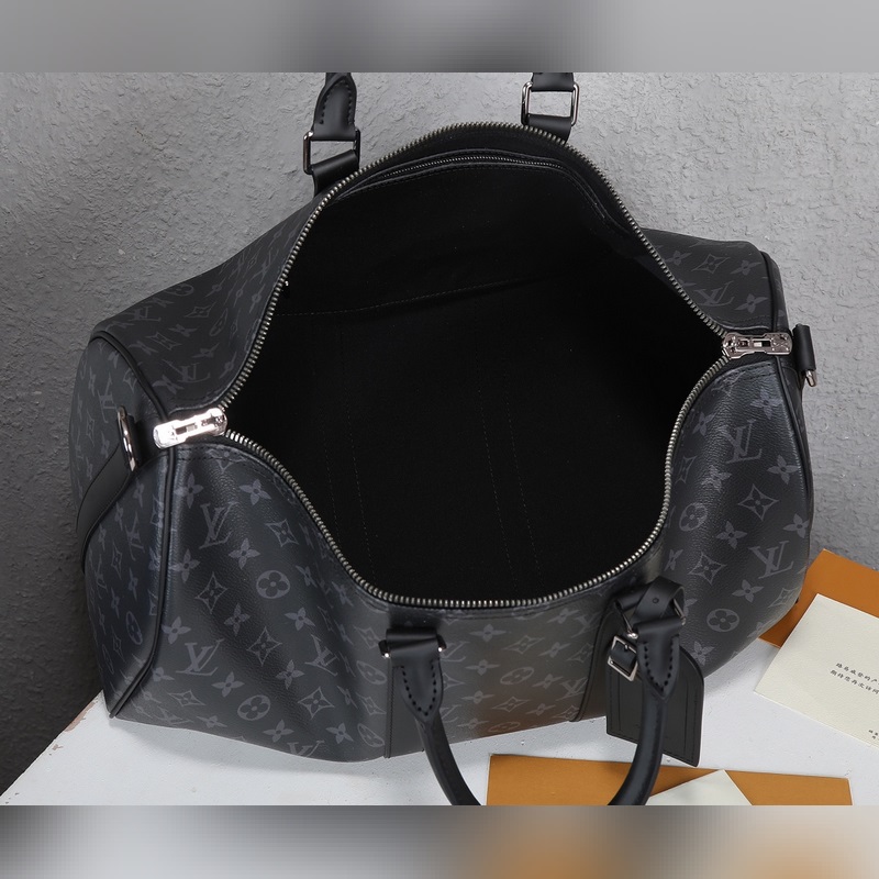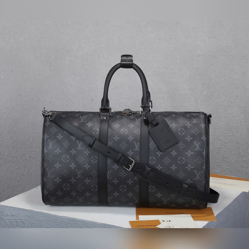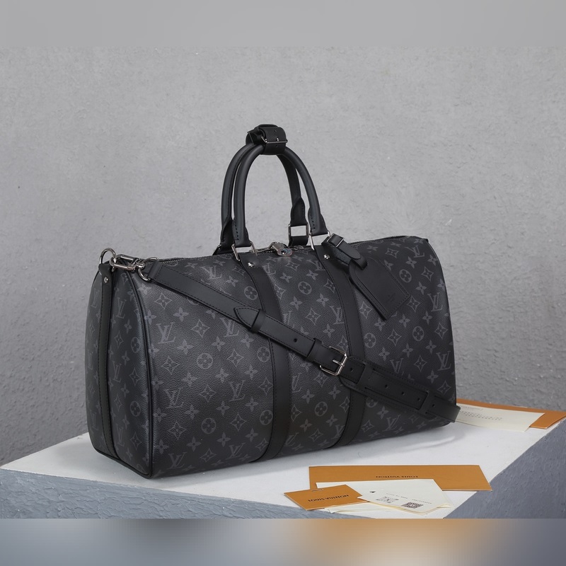 LV 올스틸 하드웨어 Keepall 45 여행 가방 모델: M40569 새로운 아이코닉한 블랙과 그레이의 모노그램 이클립스 캔버스로 제작되었습니다. 1930년부터 킵올 가방은 전 세계 모든 세대의 여행자들을 동반해 왔습니다. 이 새로운 여행 가방은 여러 개의 편안한 가죽 손잡이 캐주얼한 크로스 바디 캐리용 스트랩 반짝이는 자물쇠가 장착되어 있어 짧은 여행에 완벽한 동반자가 되어 줍니다. 특수 코팅 캔버스 천연 소가죽 트림 면직물 안감 대용량 디자인 기내 반입 수하물 크기 탈부착 가능한 가죽 이름표 은색 금속 부속품 탈부착 및 길이 조절이 가능한 어깨 스트랩 크기: 45x27x20cm