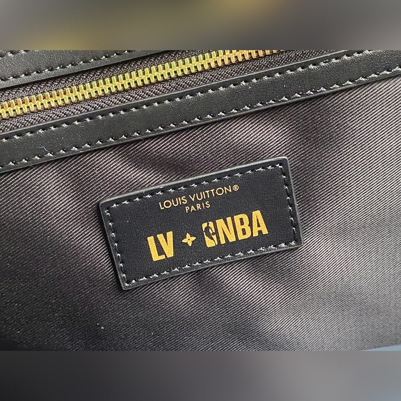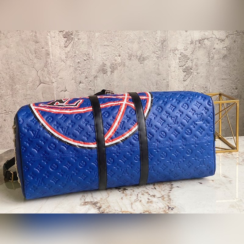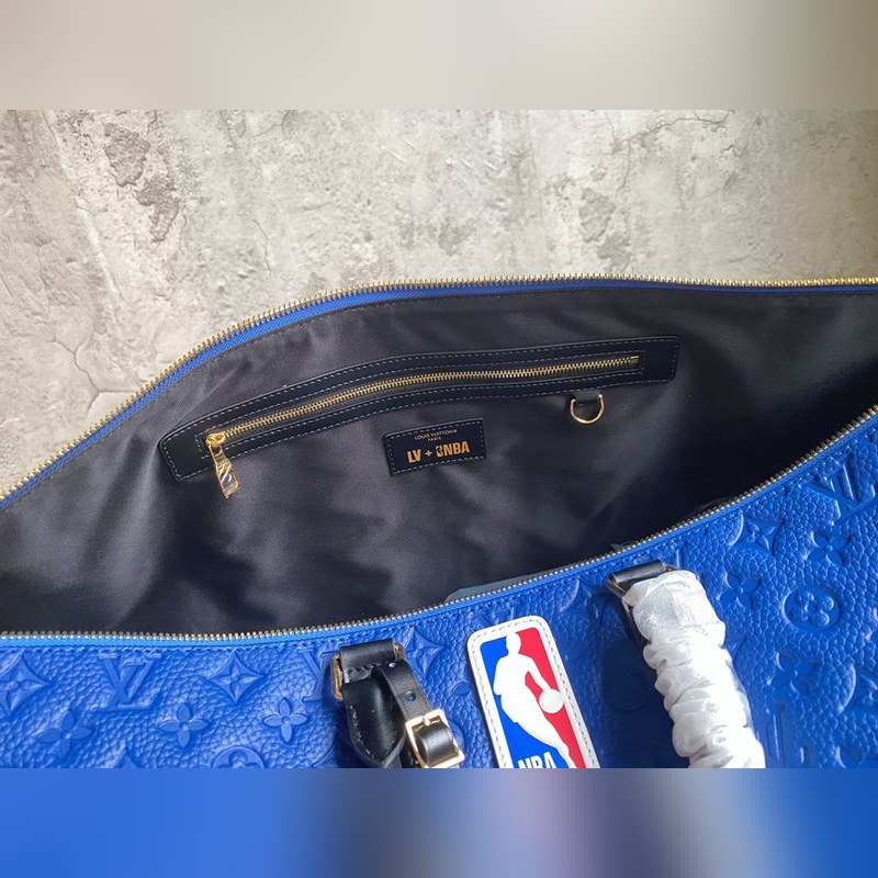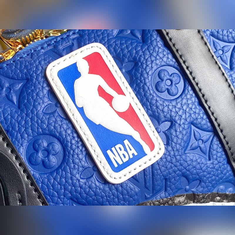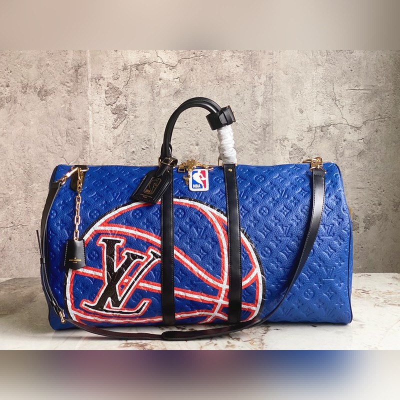 LV 모델 M21105 파란색 55cm 여행 가방 컬렉션 Keepall Bandouli?re 55 여행 가방은 NBA 경기의 상징적인 색상으로 디자인되었으며 타우리옹 가죽에 모노그램 패턴이 양각으로 새겨져 있고 새로운 LV 농구 로고와 NBA 로고 패치가 장식되어 있습니다. 여행 가방의 끝부분에는 그물 모양의 요소가 있습니다. 크기: 55.0 x 31.0 x 26.0cm (이 모델은 상자에 들어가지 않을 정도로 큽니다)
