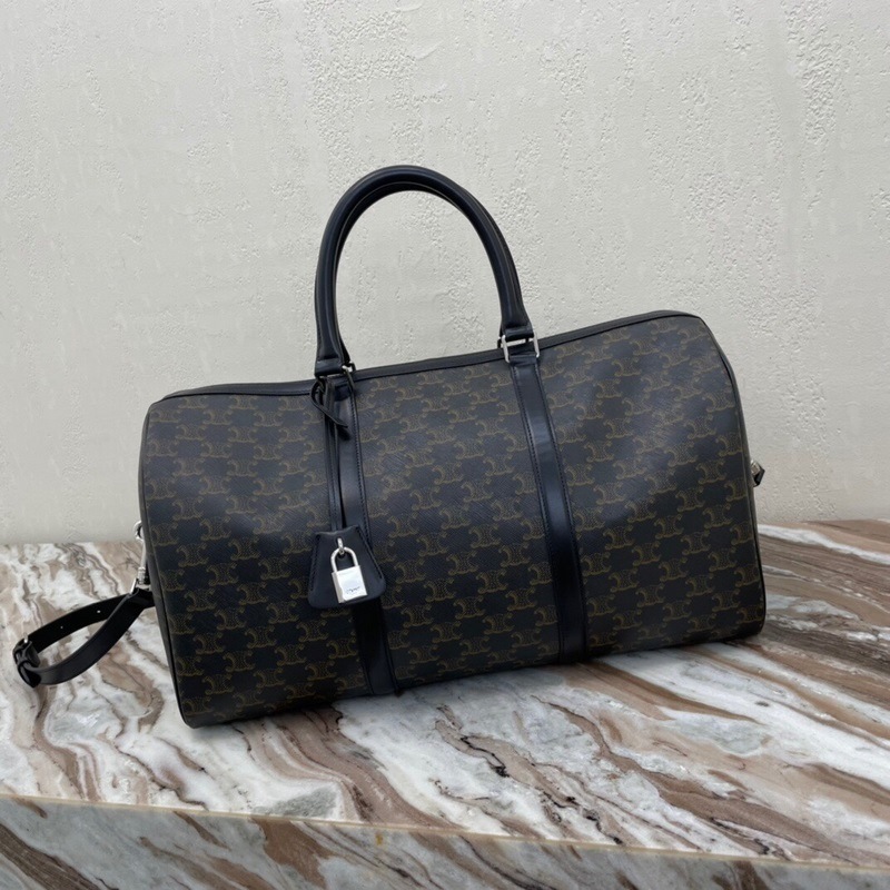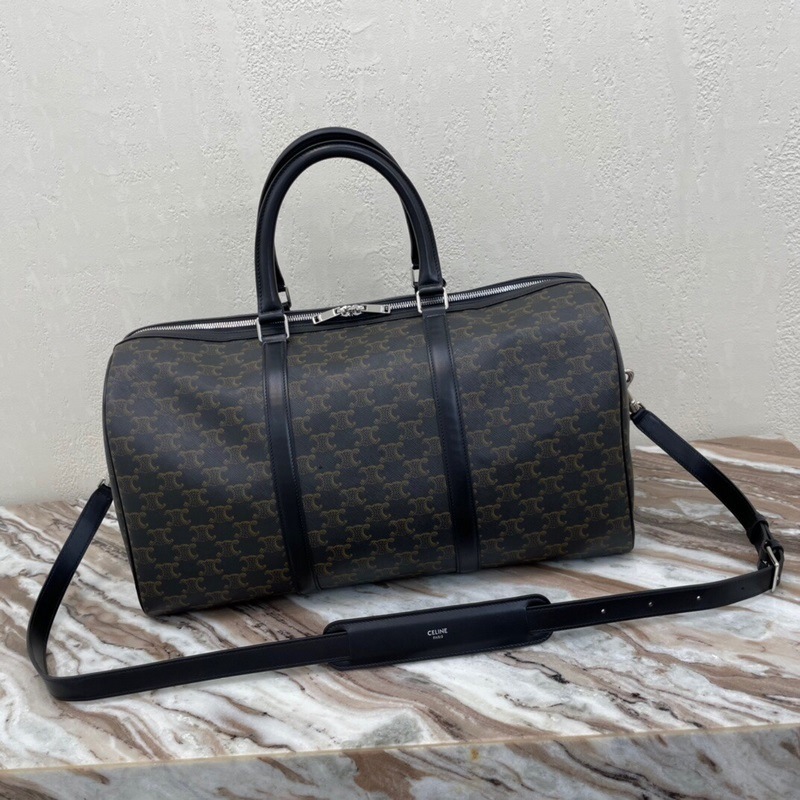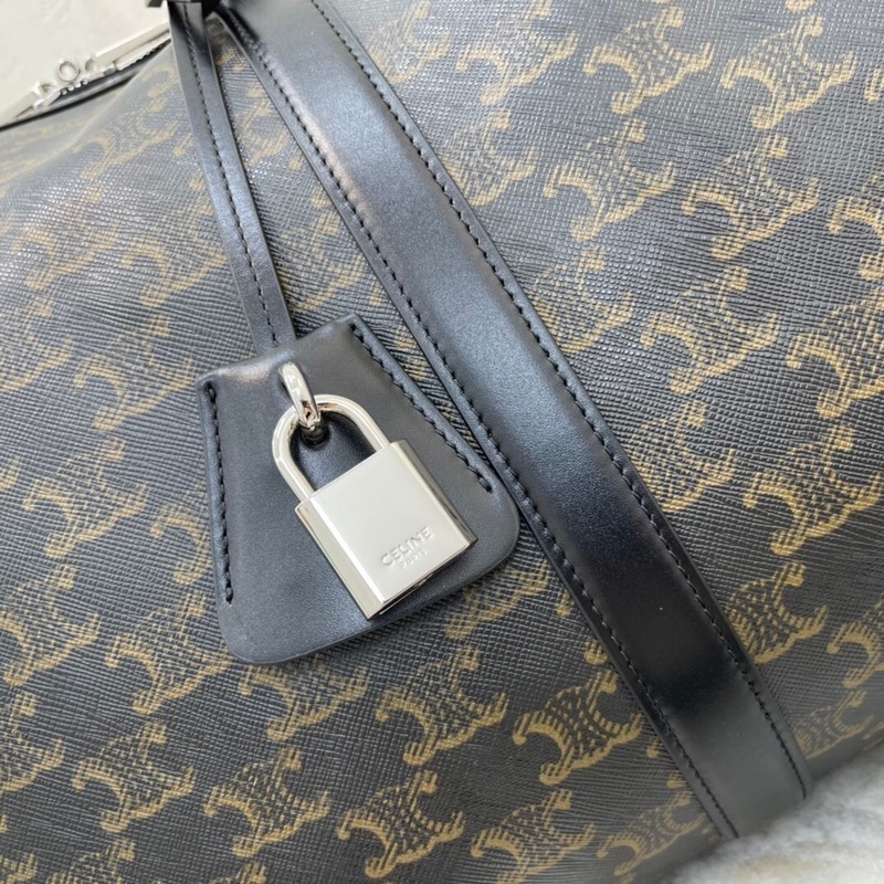 셀린 미디엄 사이즈 시그니처 프린트 소가죽 여행 가방 검정색 No. 190662CE8.38SI 캔버스/소가죽 안감: 원단 더블 지퍼 길이 17인치(43cm) 어깨 패드가 있는 조절 및 탈착식 가죽 어깨 스트랩 자물쇠로 잠글 수 있는 크기 45 x 25 x 21.5 cm