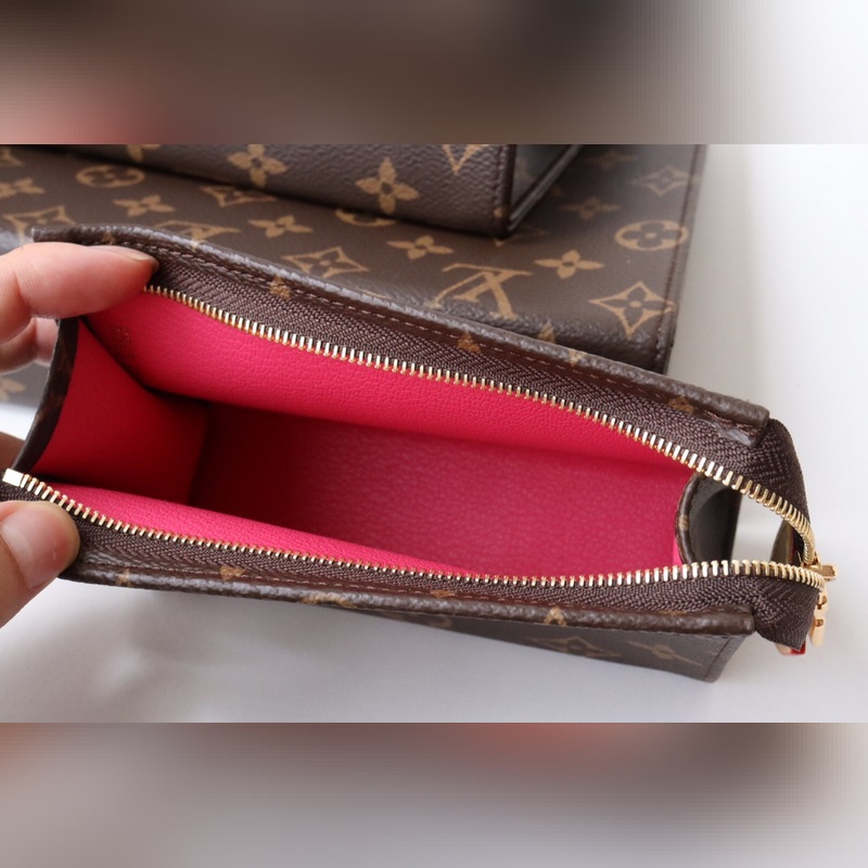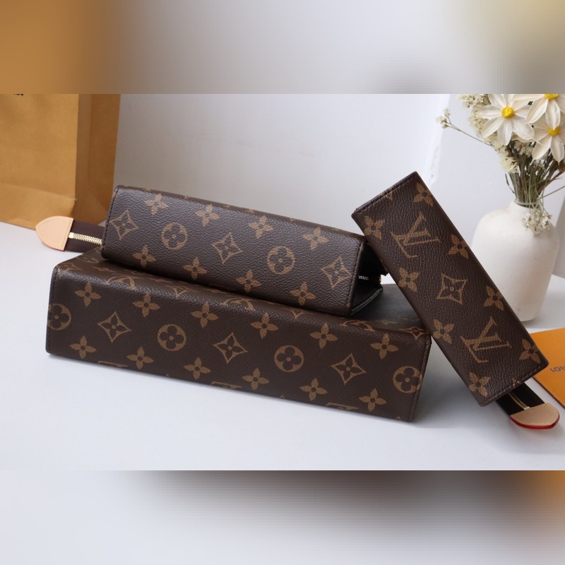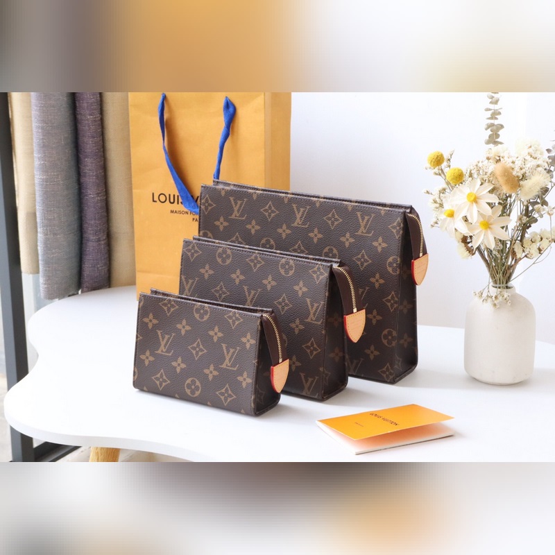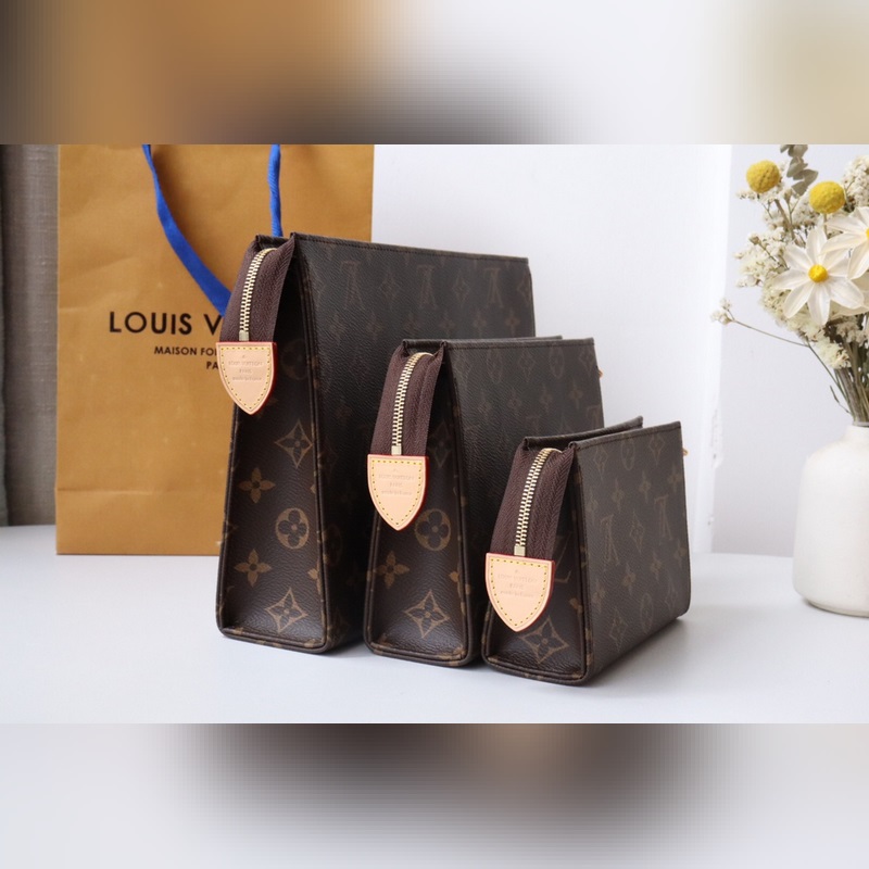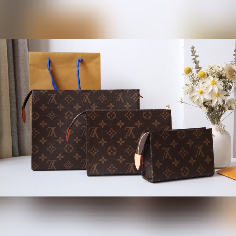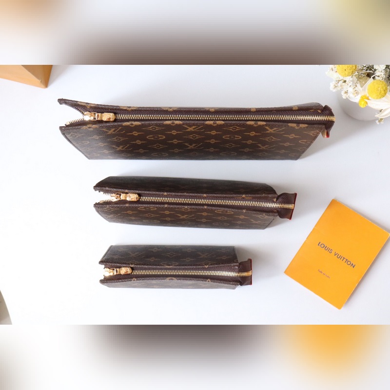 M47195 3종 세트 3가지 다른 사이즈의 루이 비통 클래식 메이크업 파우치로 구성된 세트 3 보쉬 퍼퓸. 모노그램 캔버스 소재로 제작되었으며、 물로 닦을 수 있는 안감에 각각 다른 생동감 있는 색상으로 마감된 우아하고 실용적인 메이크업 파우치입니다. 은색 금속 부품으로 세심하게 제작된 아이템입니다. 크기: 25 x 20 x 5.5 cm