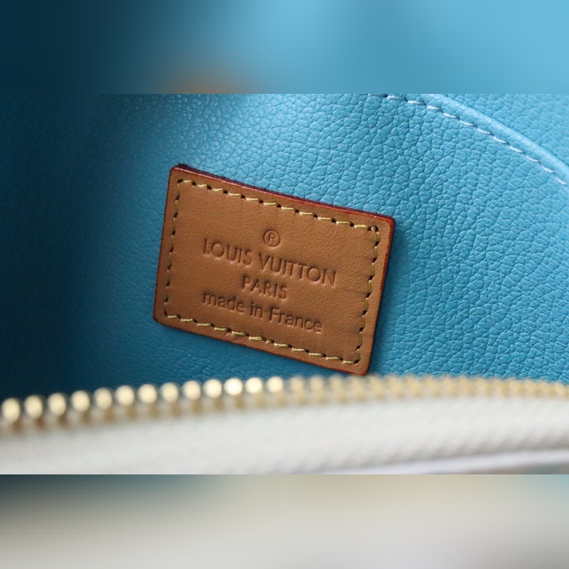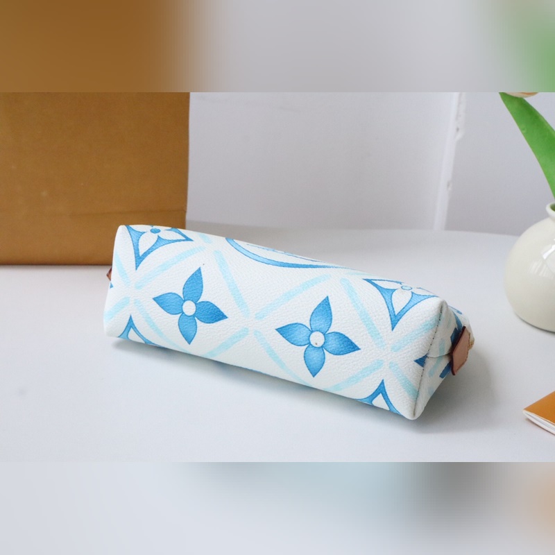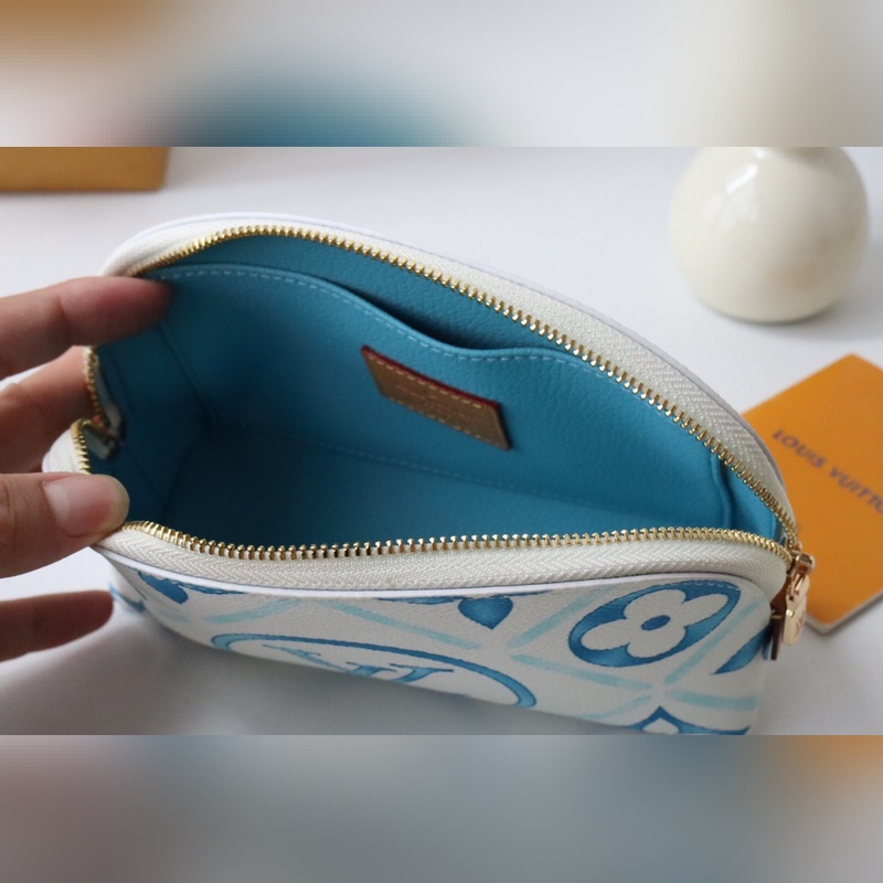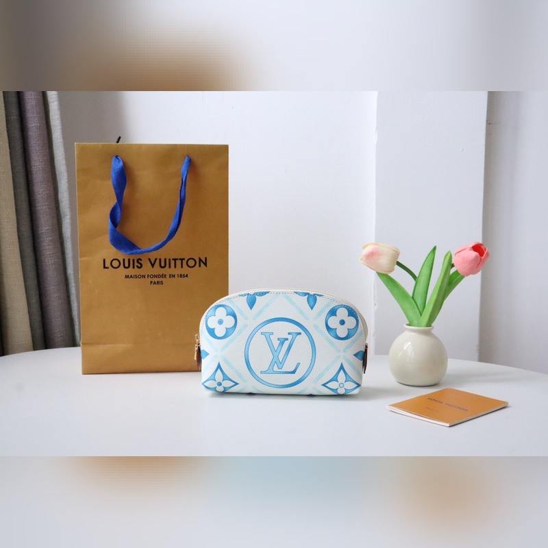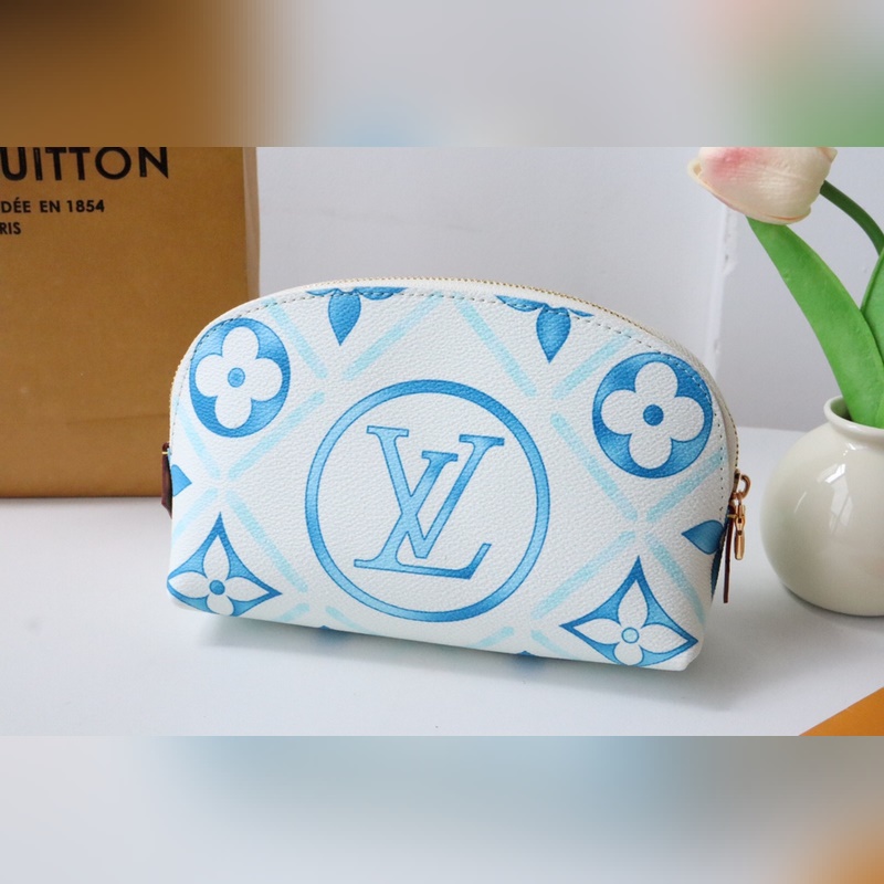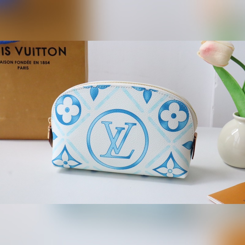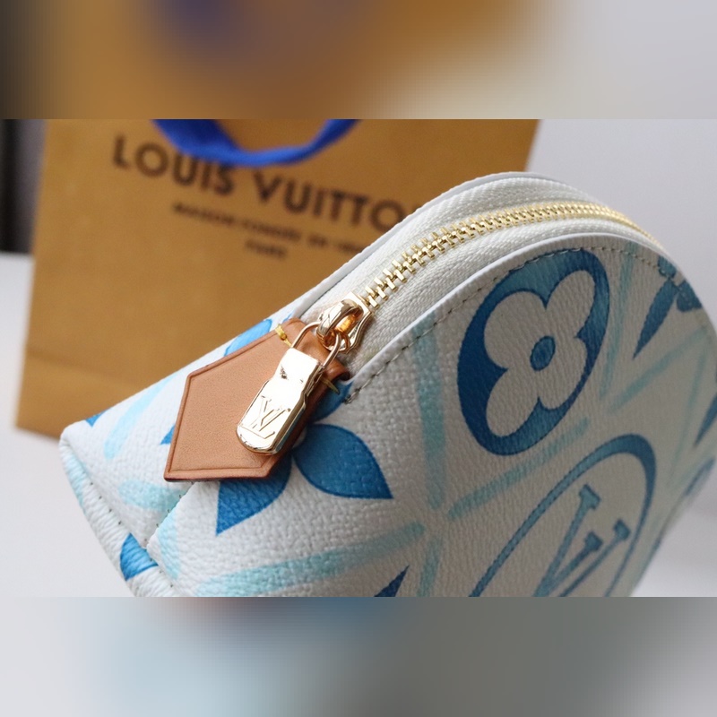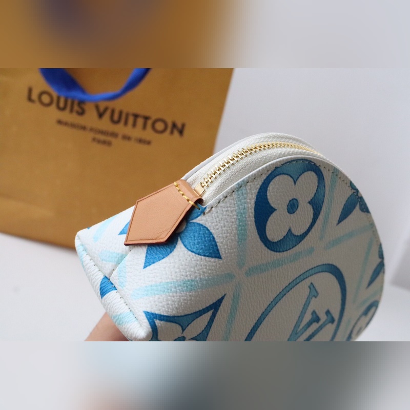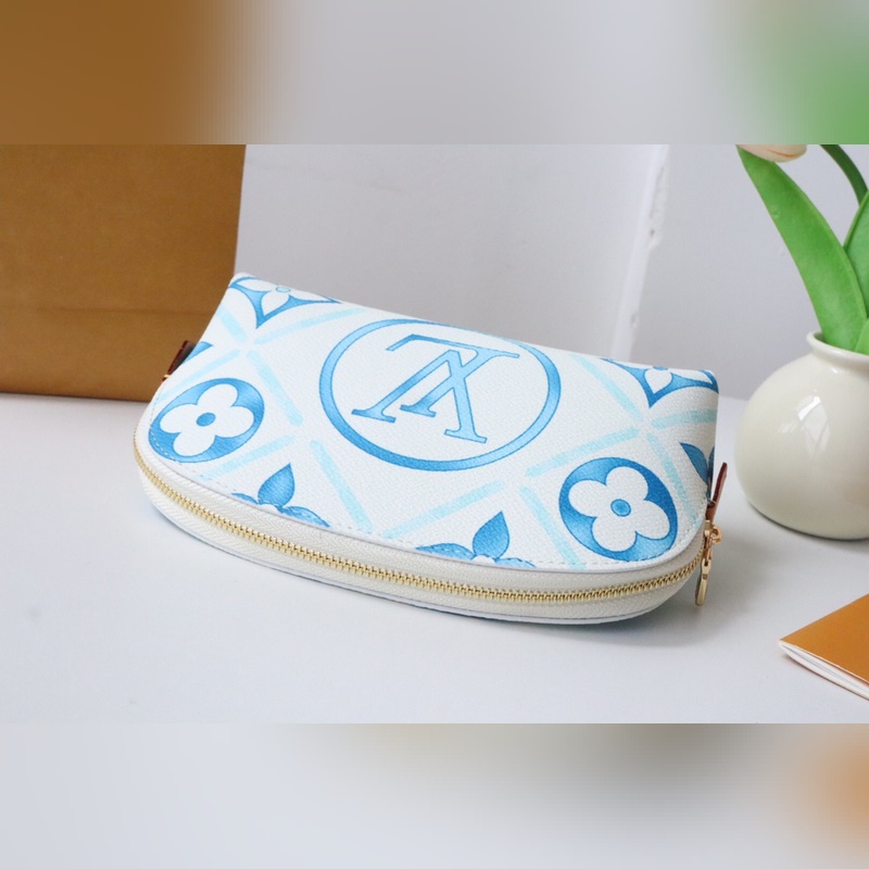 M11239 화장품 가방 여름 느낌의 이 카드 홀더는 코팅된 캔버스로 만들어졌으며 모노그램 타일 프린트와 큰 LV 서클 엠블럼이 결합되어 지중해 느낌을 줍니다.