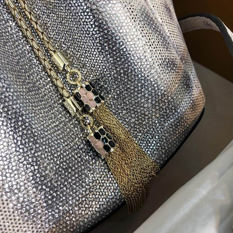 BVLGARI 붉은 물뱀 가죽 버킷백 모델: 287614 세 가지 색상이 있습니다: 빨강 검정 은빛 분홍. 은빛 분홍색은 하늘에 반짝이는 별처럼 보이며 모두 매우 매력적입니다. 검정색은 머리와 뱀 무늬가 같은 색으로 되어 있어 마치 예술 작품과 같습니다. 어떤 색상이 더 마음에 드십니까? 크기 16*19*11cm