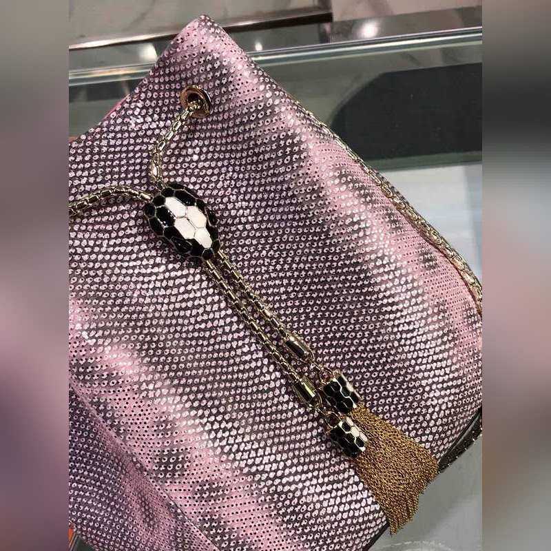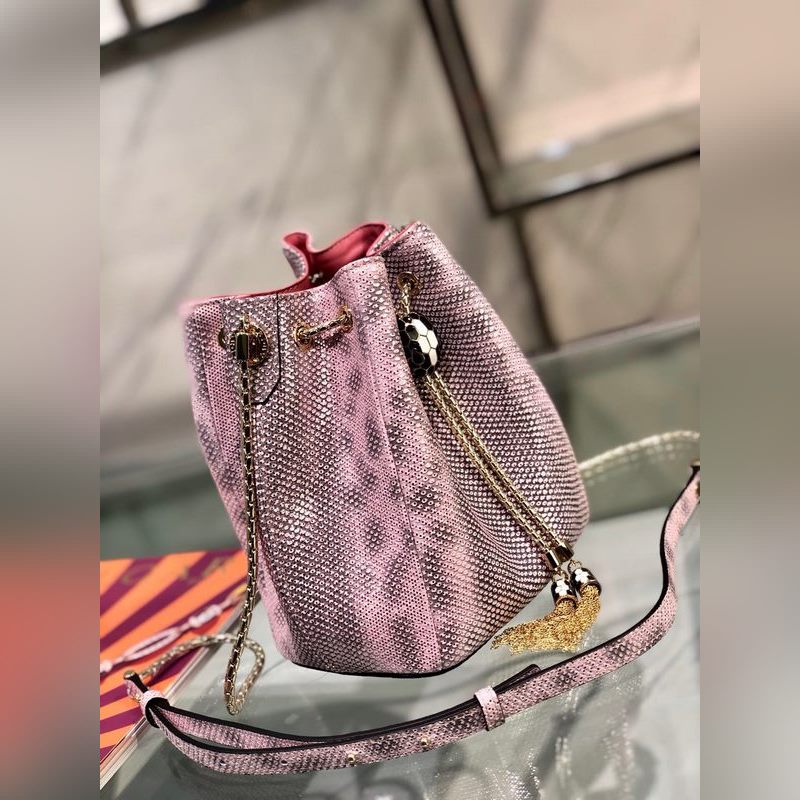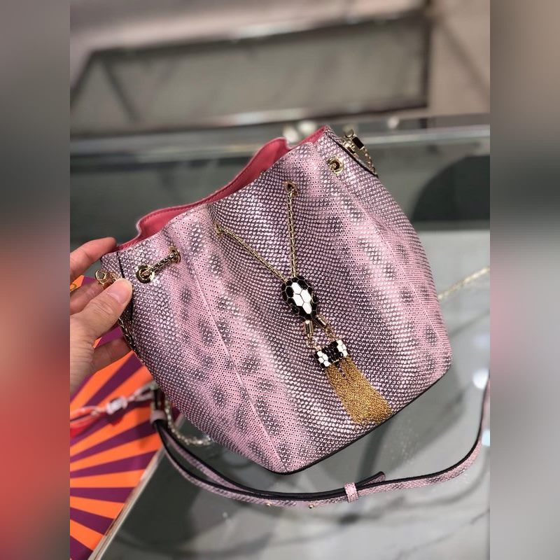 BVLGARI 붉은 물뱀 가죽 버킷백 모델: 287614 세 가지 색상이 있습니다: 빨강 검정 은빛 분홍. 은빛 분홍색은 하늘에 반짝이는 별처럼 보이며 모두 매우 매력적입니다. 검정색은 머리와 뱀 무늬가 같은 색으로 되어 있어 마치 예술 작품과 같습니다. 어떤 색상이 더 마음에 드십니까? 크기 16*19*11cm