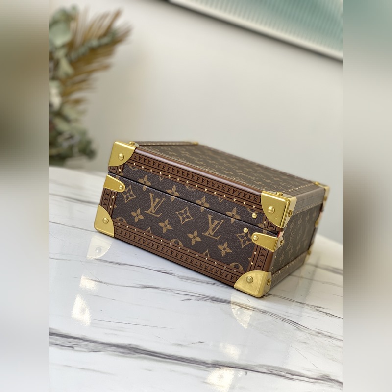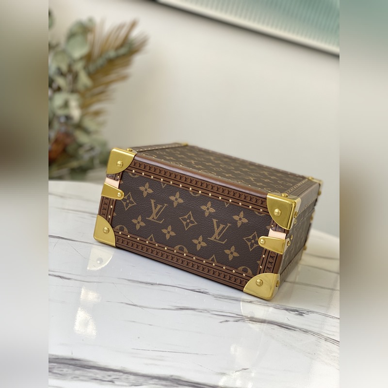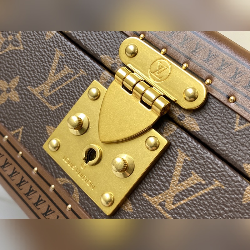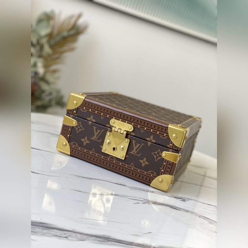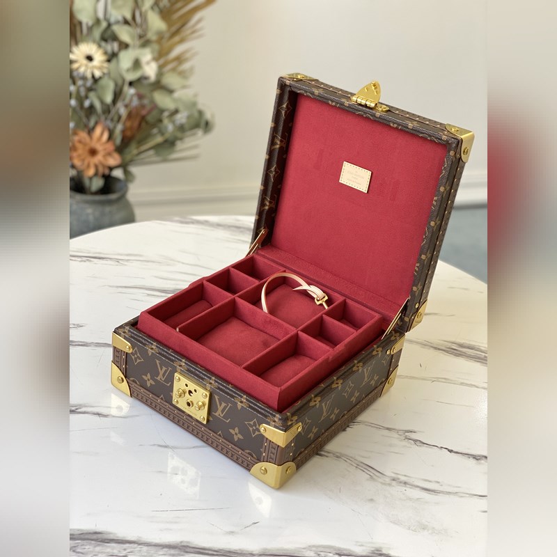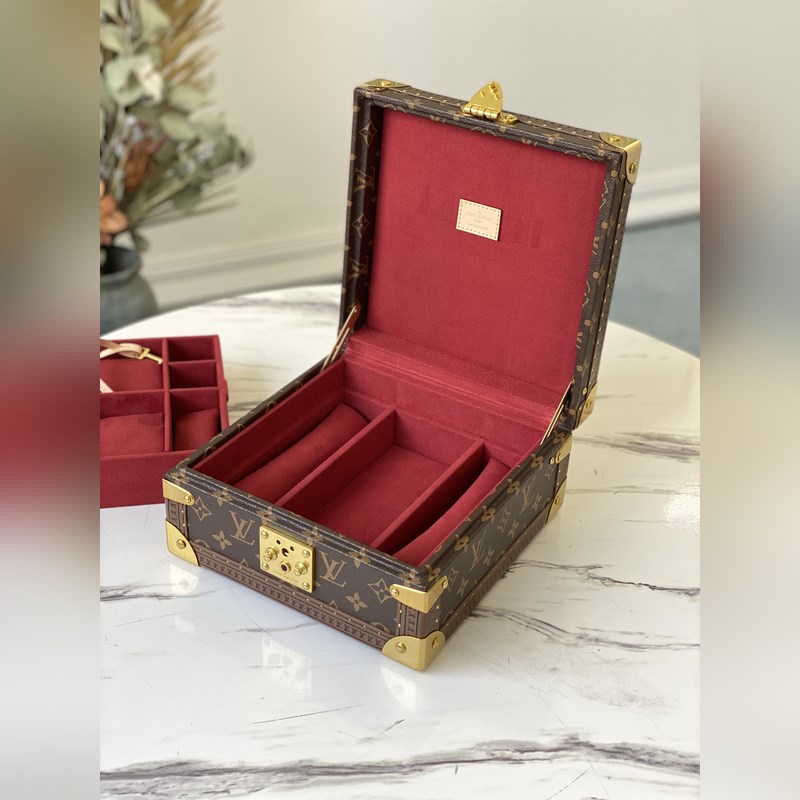 LV [보석함] 자홍색 크기 23.0*11.0*23.0cm 링 목걸이 팔찌 귀걸이 뱅글 등을 보관할 수 있도록 여러 겹으로 나눌 수 있습니다. 작은 쿠션이 함께 제공되어 보석류를 적절하고 편안하게 보관할 수 있습니다. 우아한 크기 실용적인 디자인 안전한 잠금 장치로 여행 시 좋은 동반자가 되어 줍니다. 귀걸이를 보관할 수 있는 4개의 정사각형 수납칸 중앙에 있는 2개의 정사각형 수납칸에 큰 귀걸이 또는 팔찌/뱅글을 보관할 수 있습니다. 2개의 긴 직사각형 수납칸 작은 반지 큰 반지를 보관할 수 있는 공간 2개 팔찌와 브레이슬릿을 보관할 수 있는 측면 수납공간 1개 목걸이를 보관할 수 있는 중앙 수납공간 1개 다이아몬드 무늬가 있는 금색 금속 모서리 캡 S자형 자물쇠 모노그램 캔버스 벨벳 안감 금색 금속 No.: SG96181900