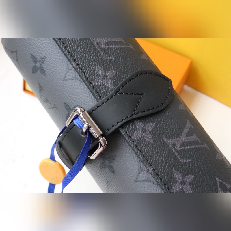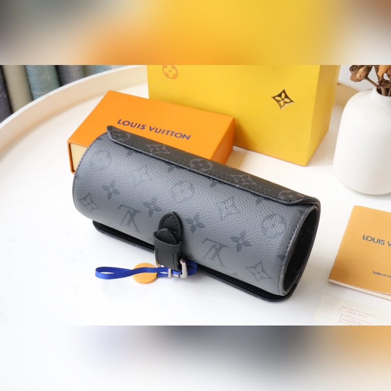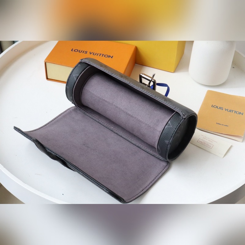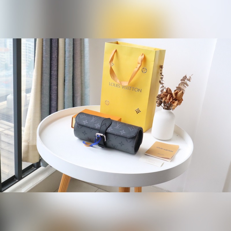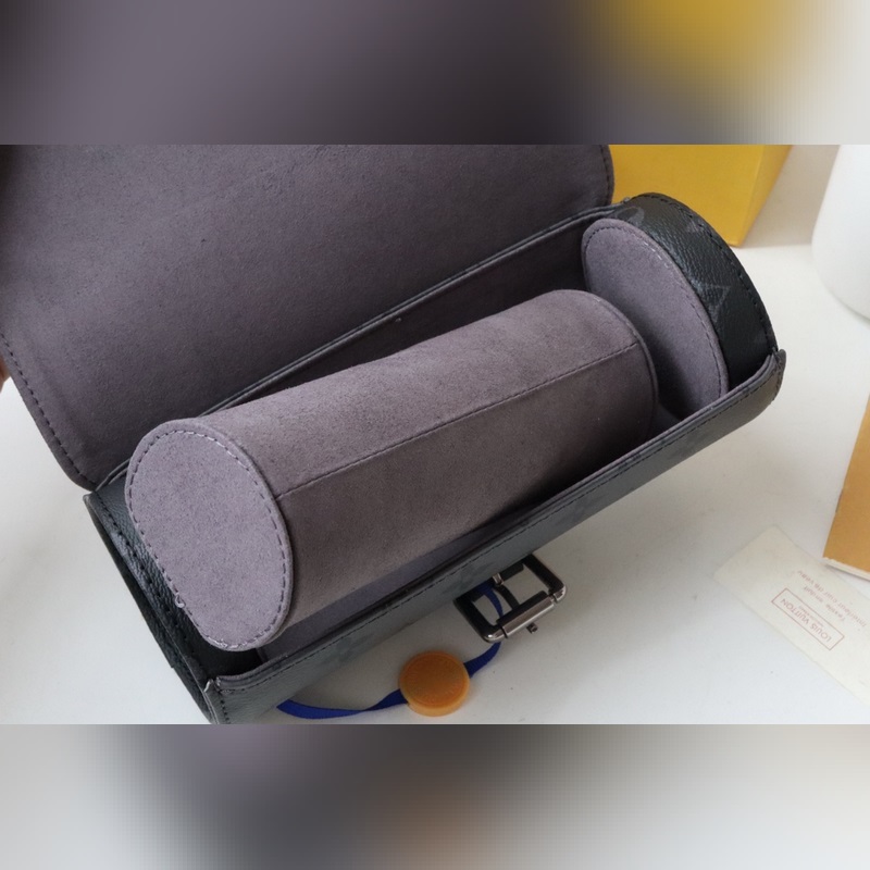 LV 시계 상자 아이템 번호 M47530 색상 조합 이 시계 케이스는 천연 소가죽으로 만들어졌으며 금색 금속 버클이 달려 있습니다. 남성용 시계 3개 또는 여성용 시계 4개를 수납할 수 있습니다. 크기: 20x8x8cm 아이템 번호: LD9618750