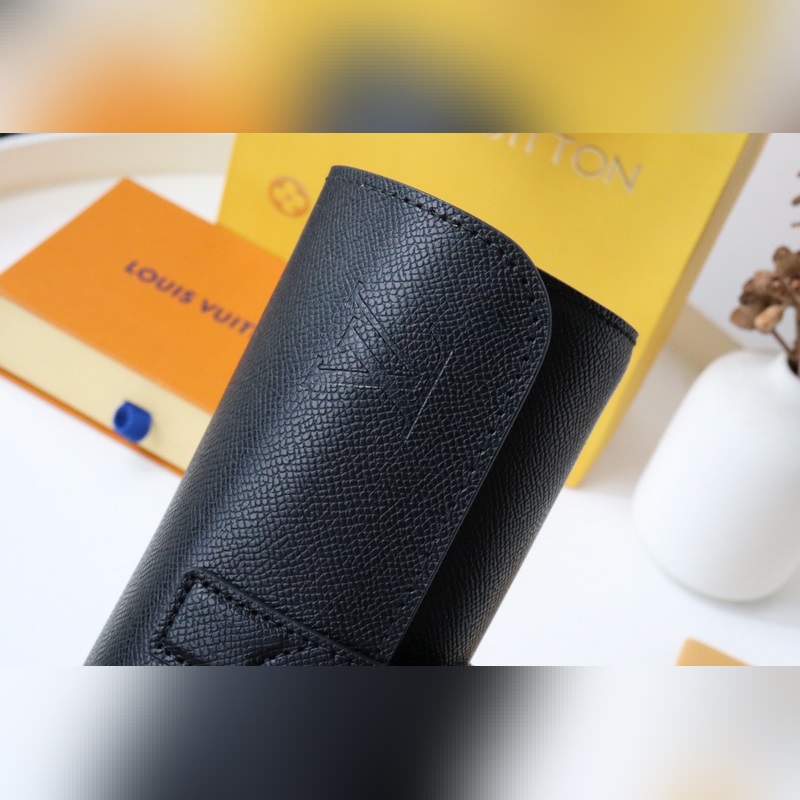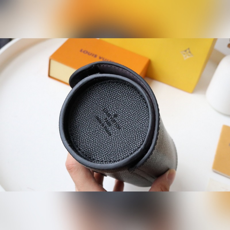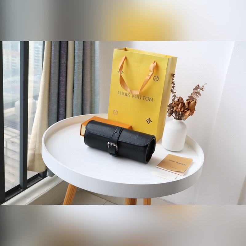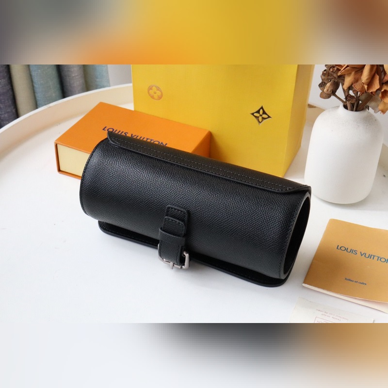 LV 시계 보관함 아이템 번호 M47530 십자형 이 시계 케이스는 천연 소가죽으로 만들어졌으며 금색 금속 버클이 달려 있습니다. 남성용 시계 3개 또는 여성용 시계 4개를 수납할 수 있습니다. 크기: 20x8x8cm 아이템 번호: LD9618750