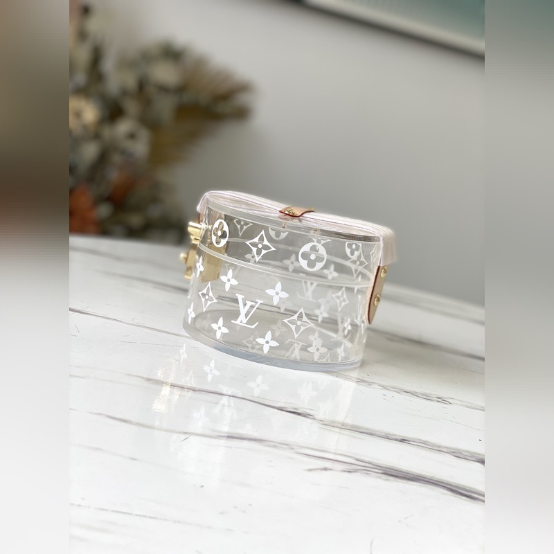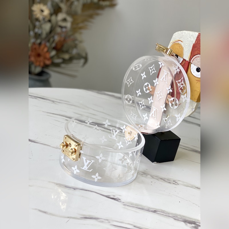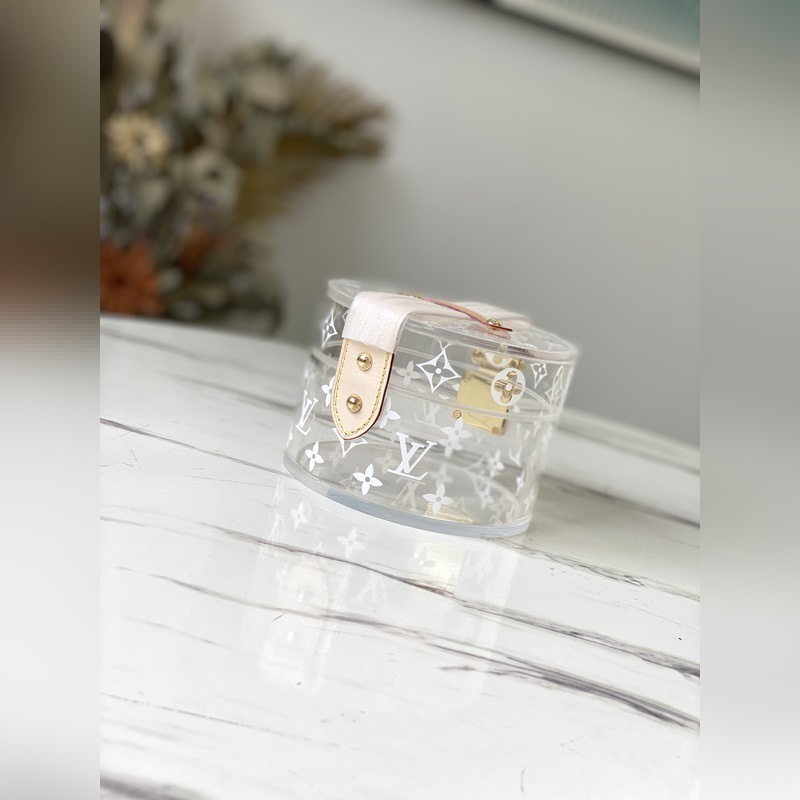 LV 상품 번호 GI0203 흰색 SCOTT 보관함 투명 가방(작고 가벼움) 플렉시글라스 고급 가죽 반짝이는 금속이 어우러져 눈길을 사로잡는 장식 상자입니다. 루이비통의 클래식한 트렁크를 연상시키는 디자인 디테일이 가득한 이 새로운 장식 상자는 보석과 화장품을 보관하는 용도로 사용할 수 있고 화장대 위에 장식용으로 올려놓을 수도 있습니다. 크기: 20 / 20cm 항목 번호: SG9618890 9618710