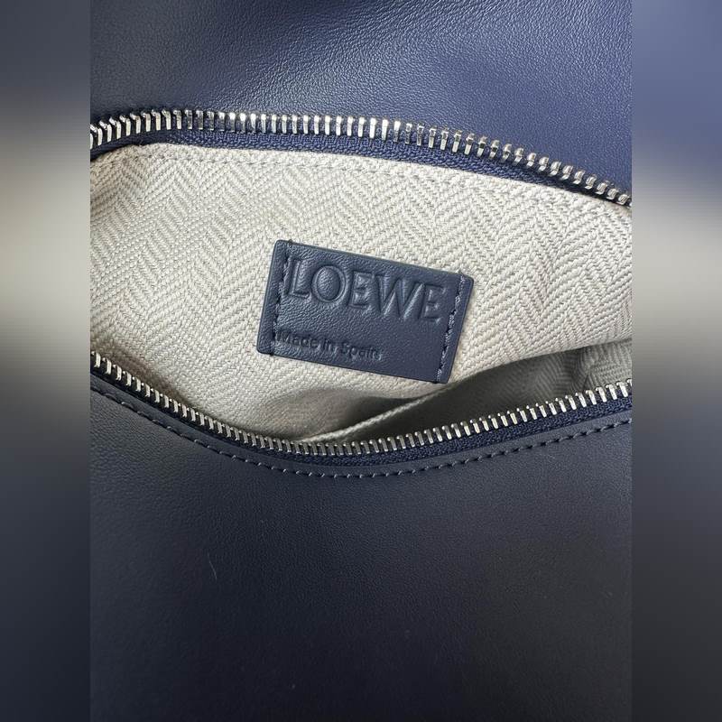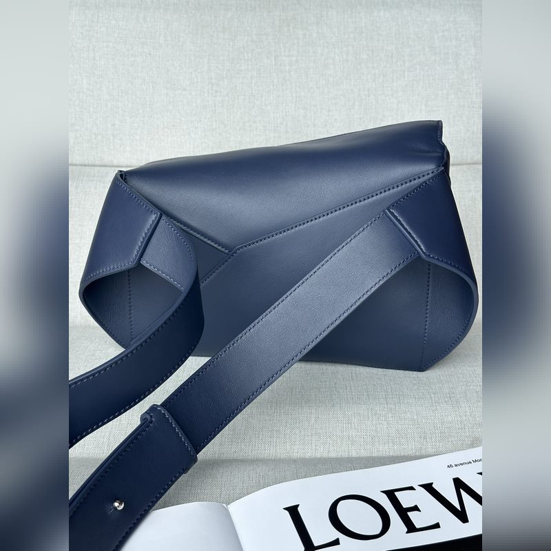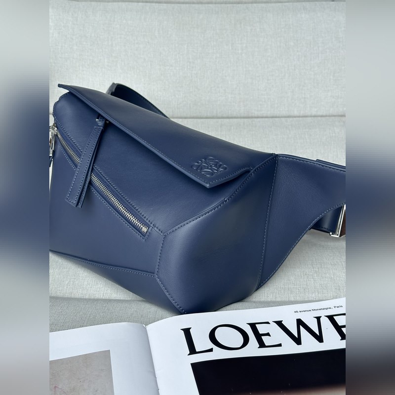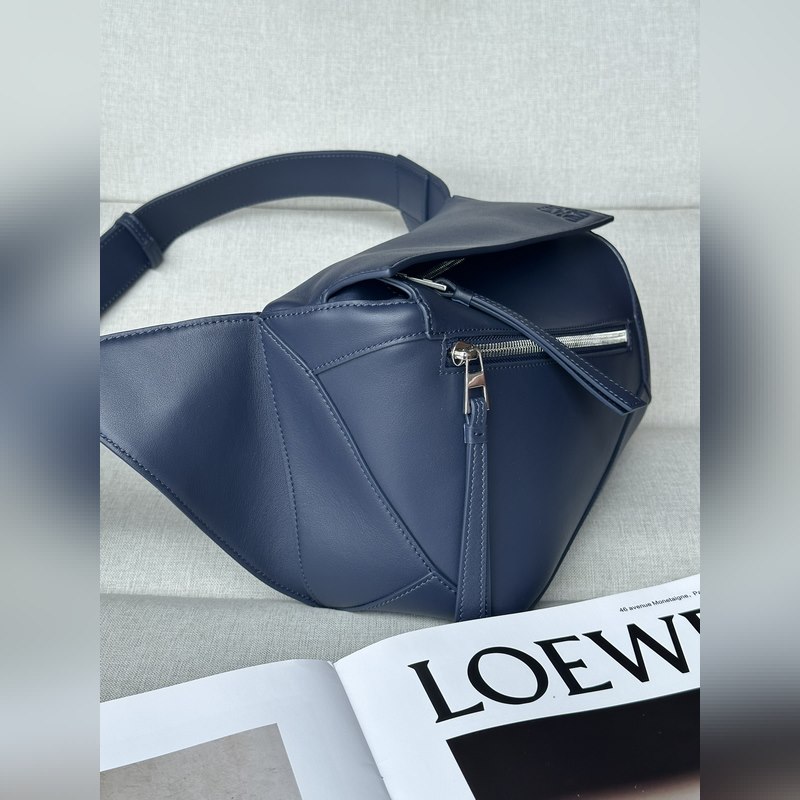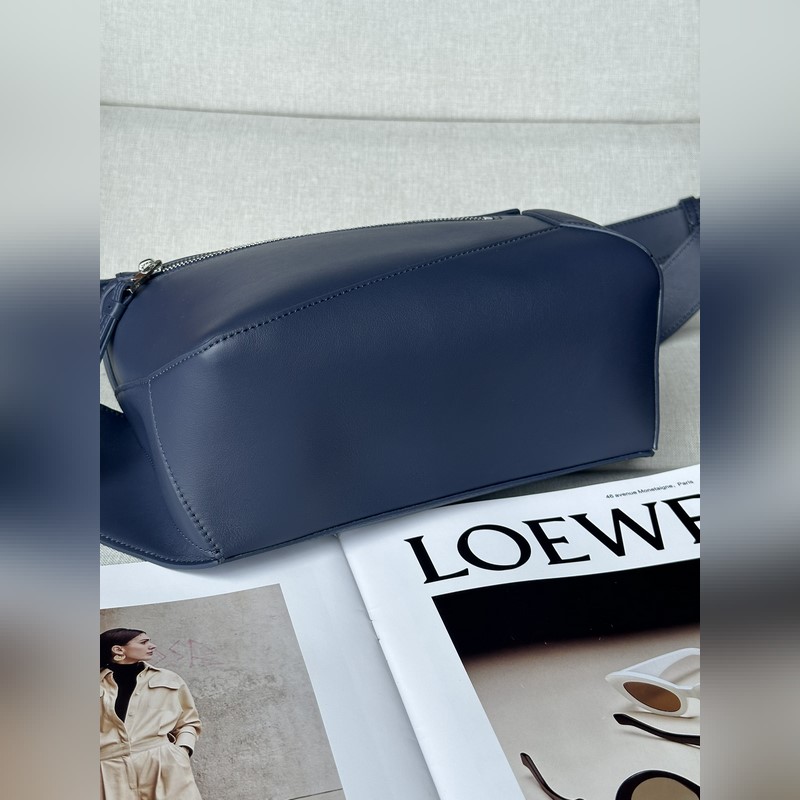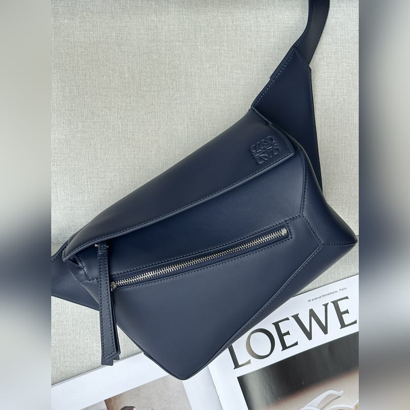 천연 가죽 작은 클래식 소가죽 퍼즐 힙색 6003 진한 파란색 퍼즐 백은 크리에이티브 디렉터 조나단 앤더슨이 LOEWE를 위해 만든 최초의 핸드백입니다. 직육면체 모양과 정교한 재단 기법이 퍼즐의 독특한 기하학적 라인을 만들어 냅니다. 이 작은 허리 가방은 클래식한 소가죽으로 만들어졌으며 겹치는 가장자리가 특징입니다. 어깨에 메거나 몸에 걸칠 수 있습니다. 조절 가능한 어깨 스트랩 금속 버클 잠금장치 로에베 로고 각인 가죽 지퍼 풀러 외부 지퍼 포켓과 내부 슬립 포켓 헤링본 무늬 면 캔버스 안감 아나그램 엠보싱 24-10.5-16