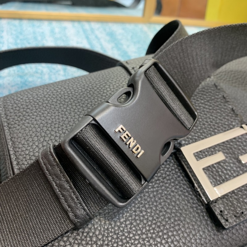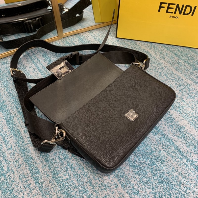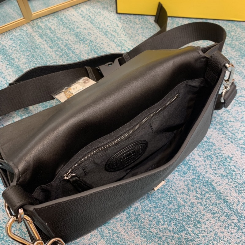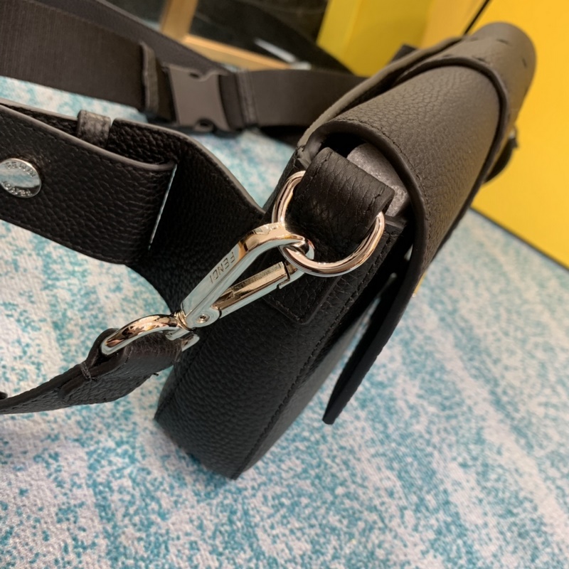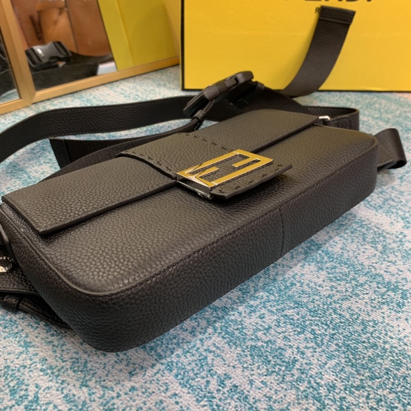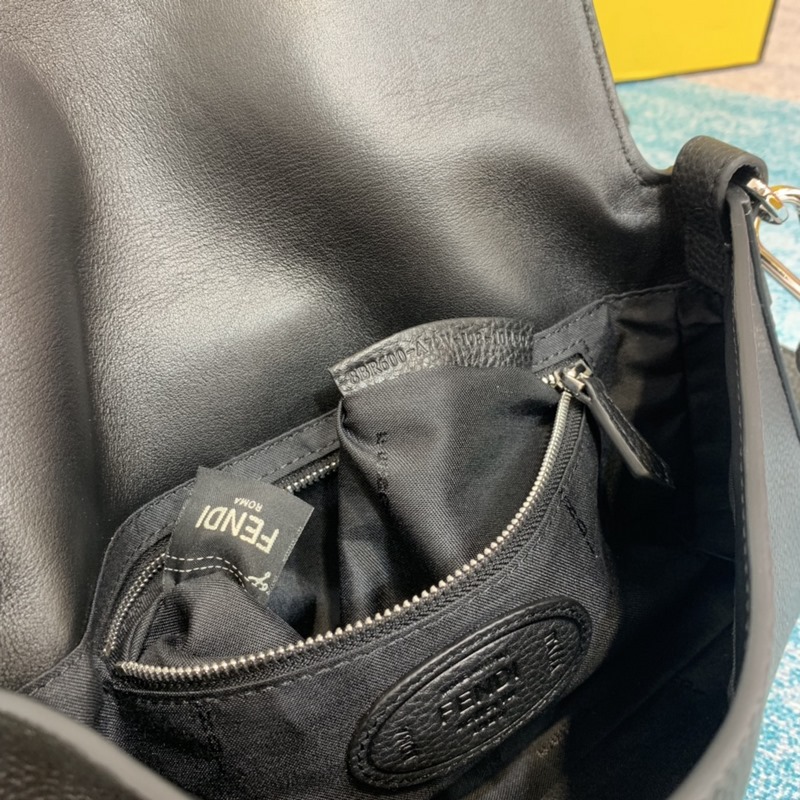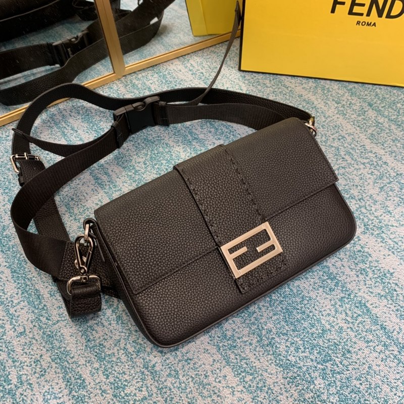 펜디 실버톤 사각형 플랩 디자인의 표준 바게트 핸드백 FF 자석 걸쇠 잠금장치. 뒷면의 외부 주머니에서 벨트를 빼서 허리 가방으로 착용하거나 탈착식 어깨 끈을 사용하여 어깨에 메거나 크로스 바디로 착용할 수 있습니다. 지퍼가 달린 안감 주머니. 이탈리아산 검은색 로마노 가죽으로 제작. 크기 28*18*7cm. 포장 포함 번호: BD96181300