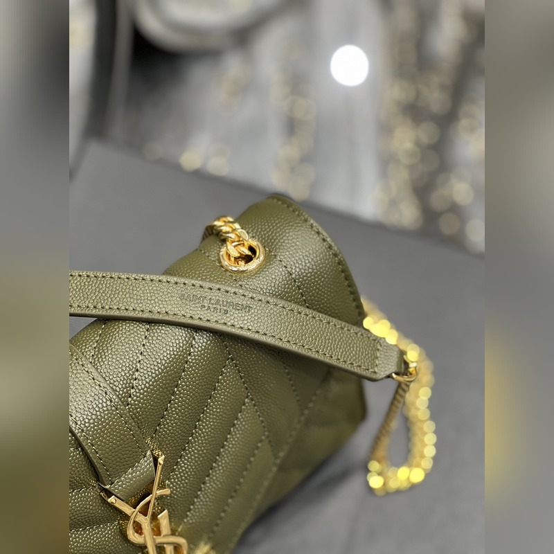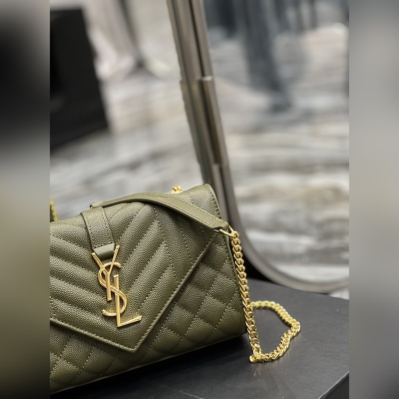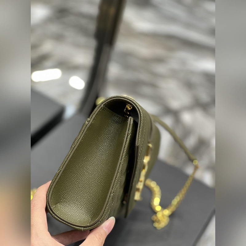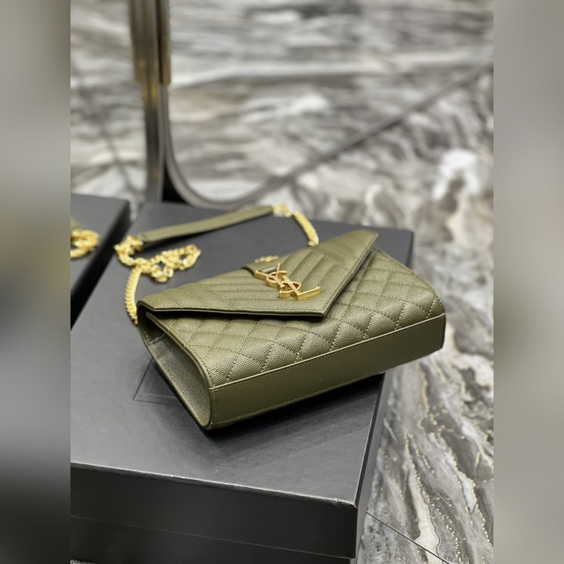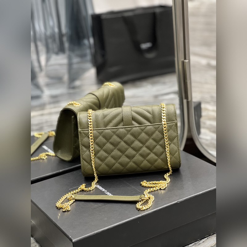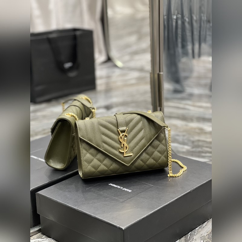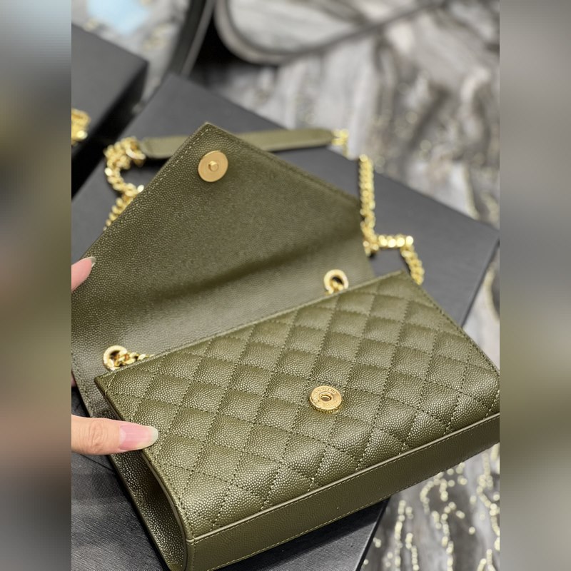 #Envelope# 그린 골드 버클 소형 그레인 압화 스티치 무늬 진품 가죽 봉투백 클래식은 영원합니다. 하늘을 찌를 듯 아름다운 V자 무늬와 다이아몬드 패턴이 조화를 이룬 캐비어 무늬는 매우 내구성이 뛰어납니다. 이탈리아산 소가죽에 눈에 띄는 Y자 로고가 더해져 고급스러움과 세련미를 동시에 선사합니다! 어떤 스타일에도 잘 어울리며 소형 사이즈임에도 불구하고 용량이 매우 넉넉합니다. 측면을 보면 얼마나 많은 물건을 담을 수 있는지 알 수 있습니다! 모델: 526286 사이즈: 21x13x6cm